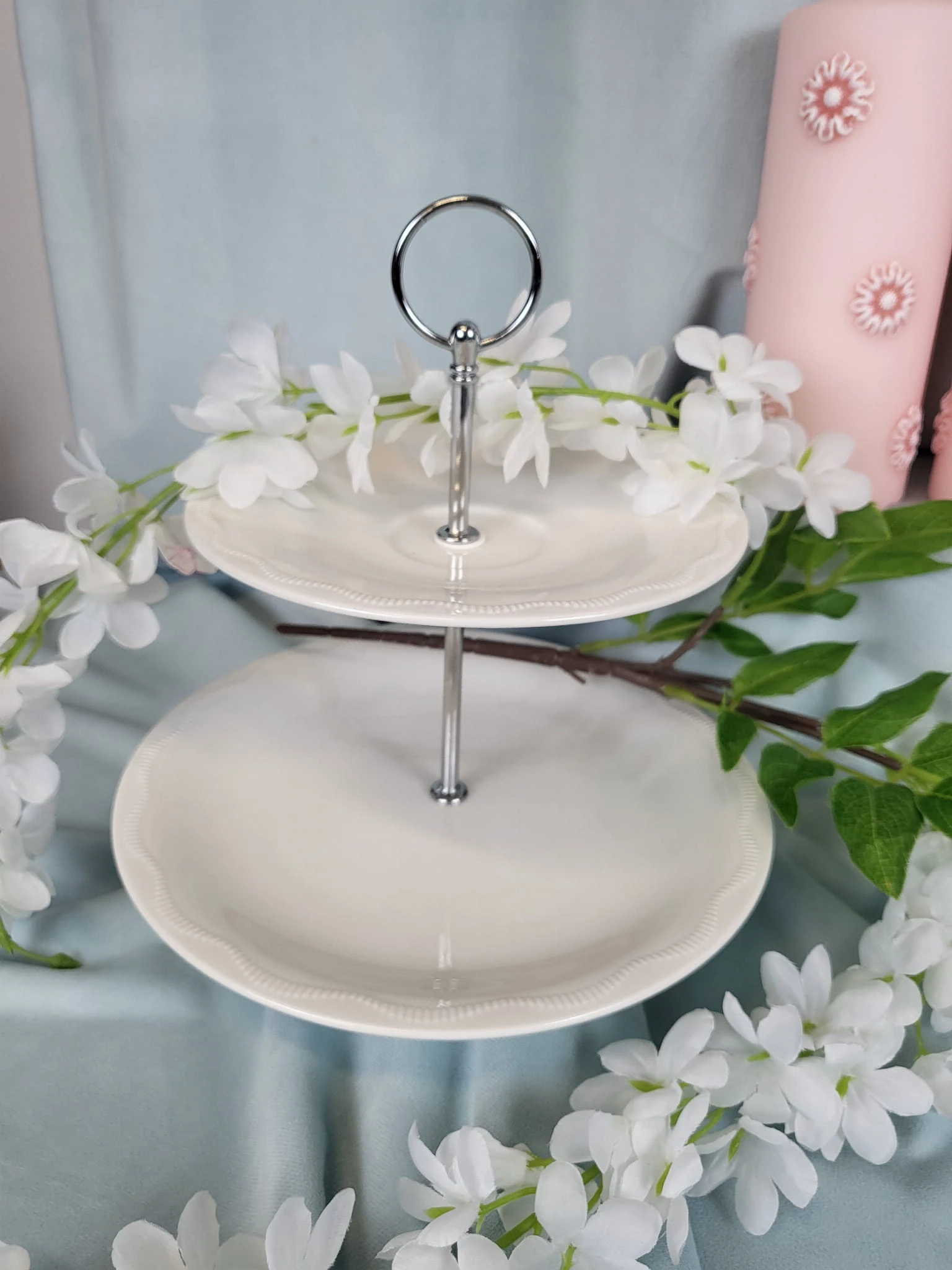 Patera w kolorze ecru ze srebnym uchwytem. Idealnie udekoruje stół oraz spełni funkcję praktyczną.