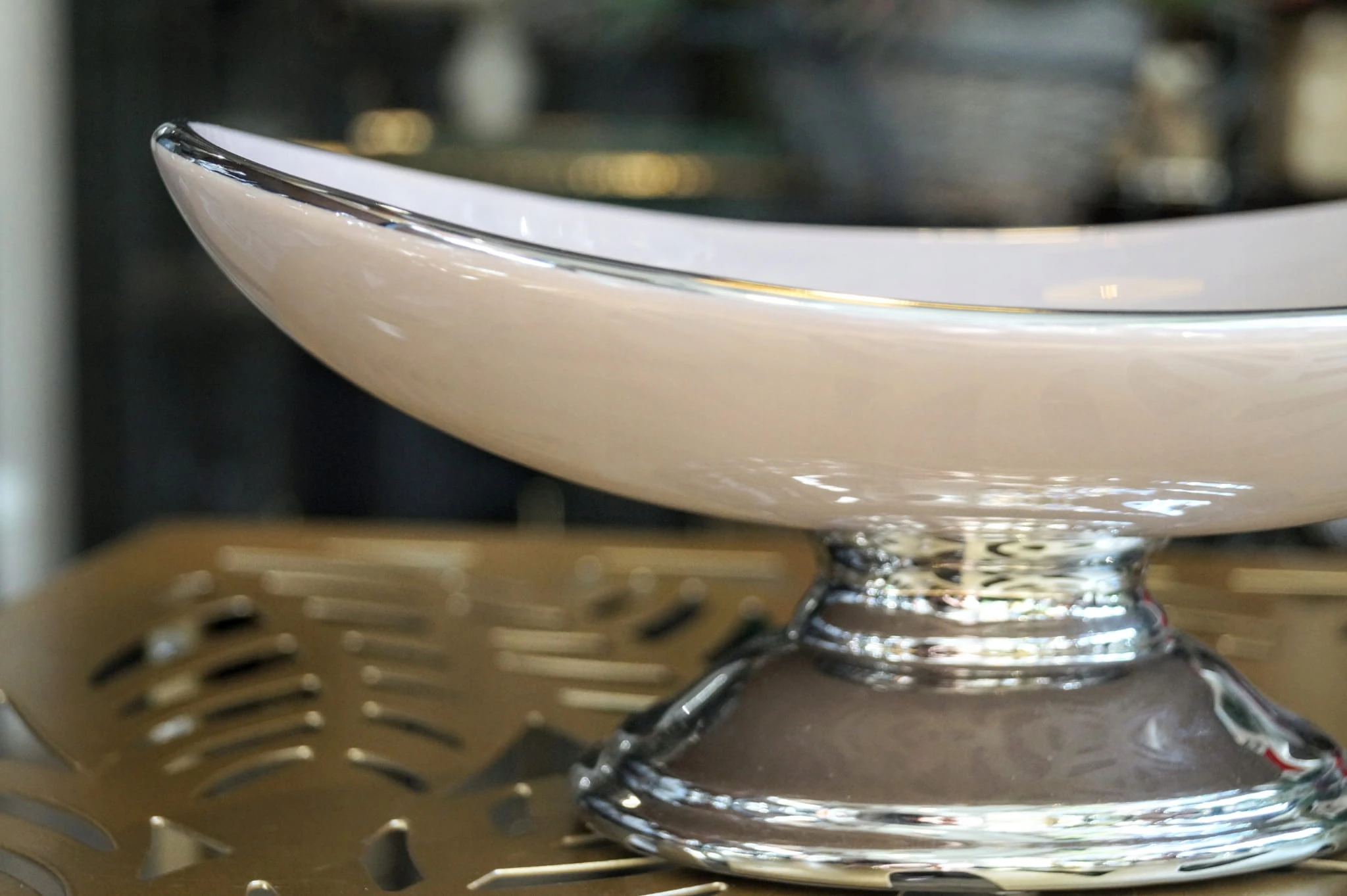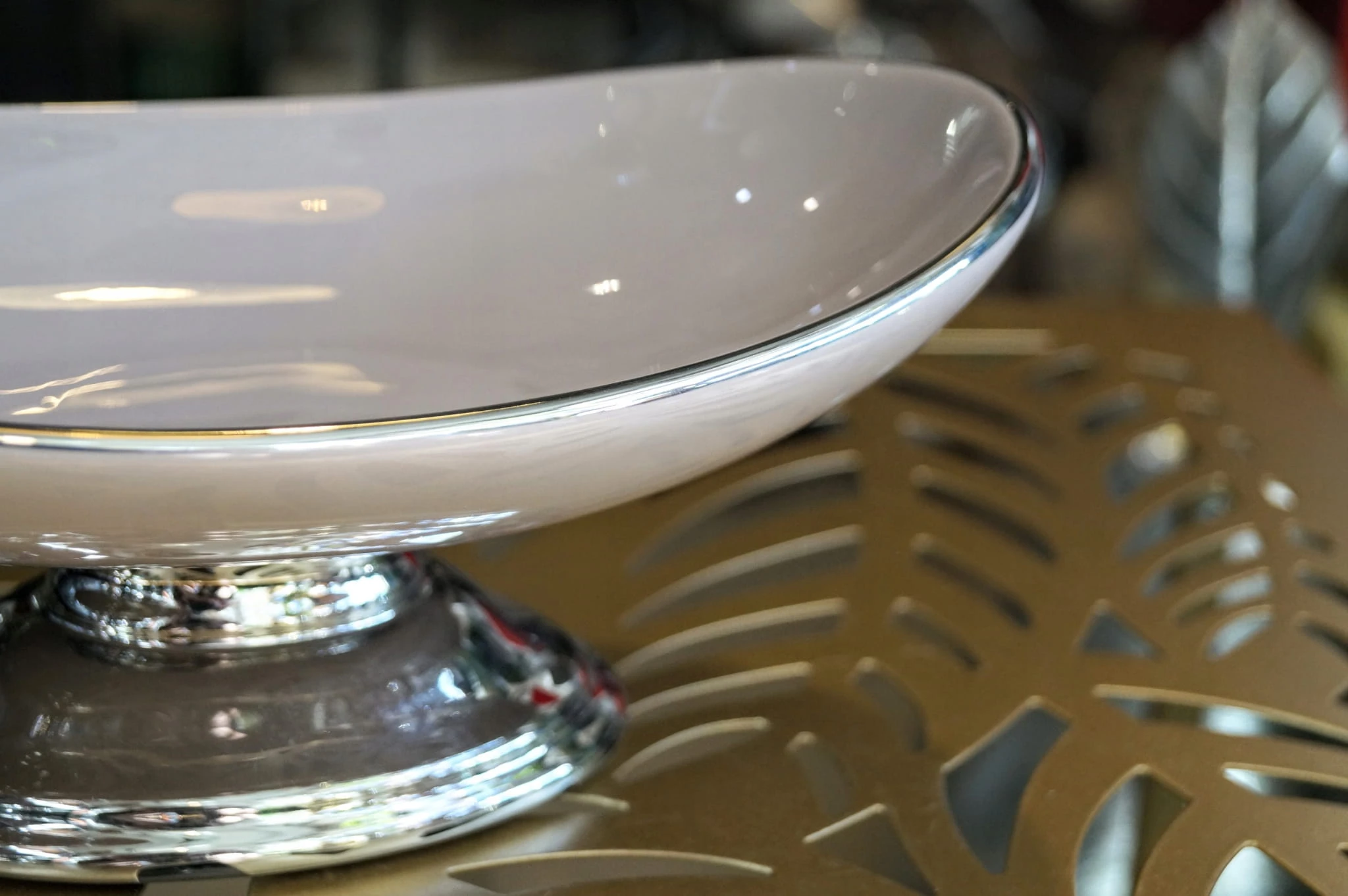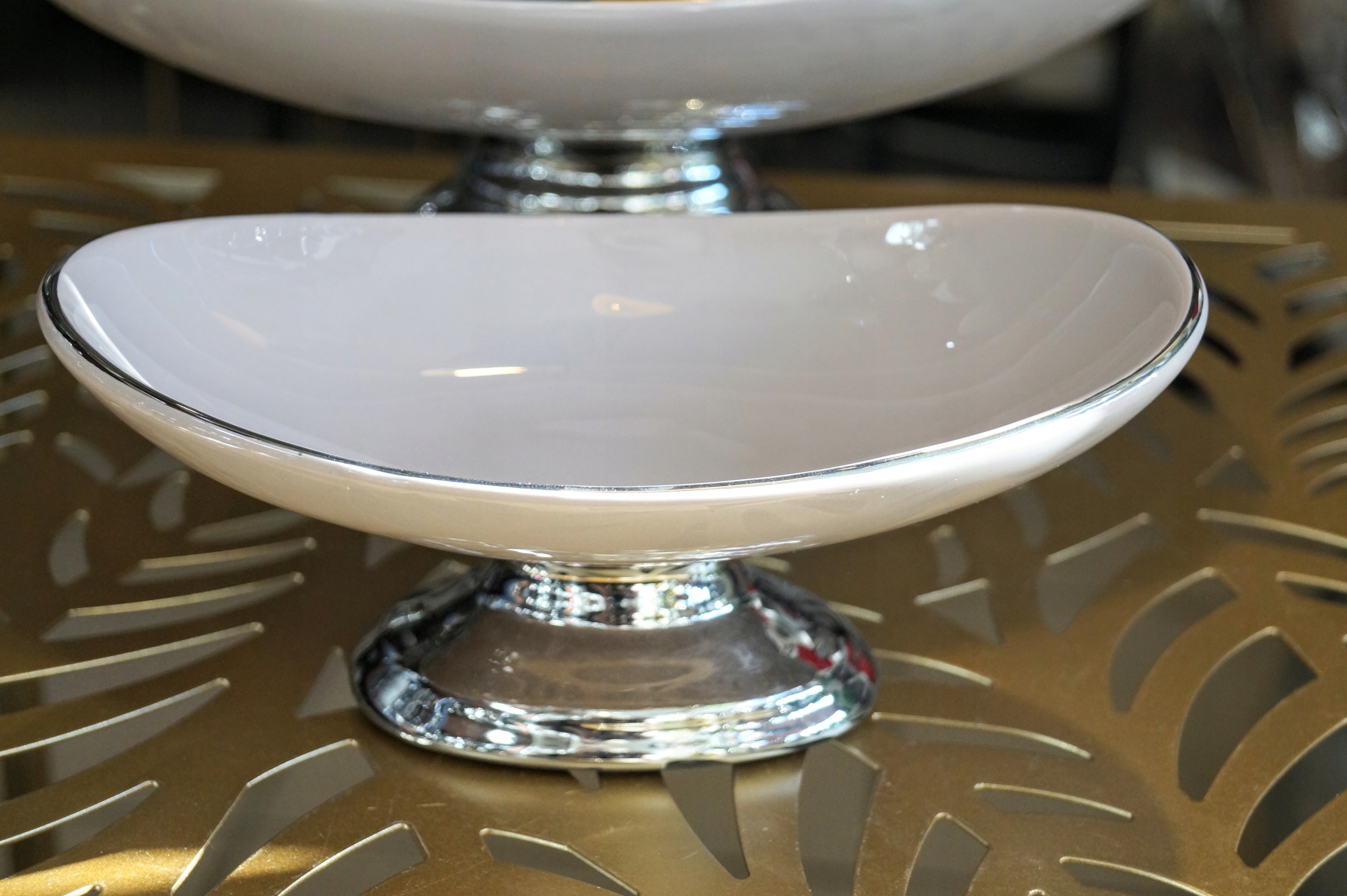 Ceramiczna patera na nóżce w kolorze srebrnym, z wysokiej jakości ceramiki szlachetnej. Podstawa i brzeg patery w kolorze srebra.