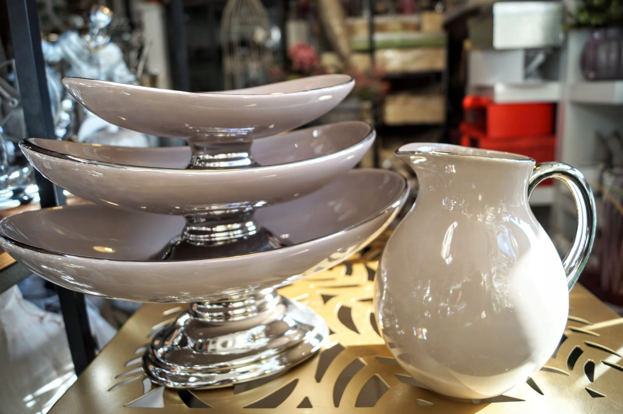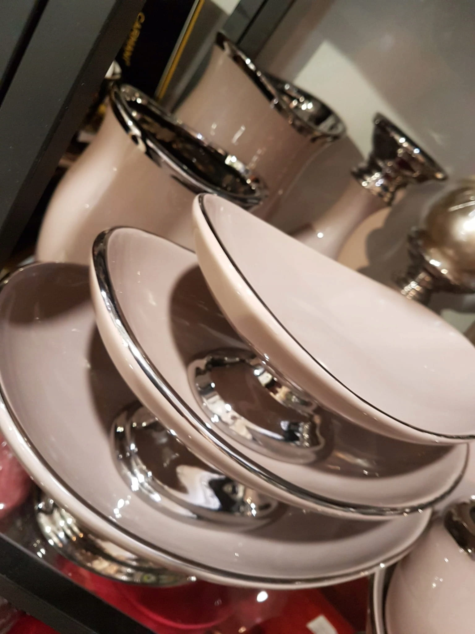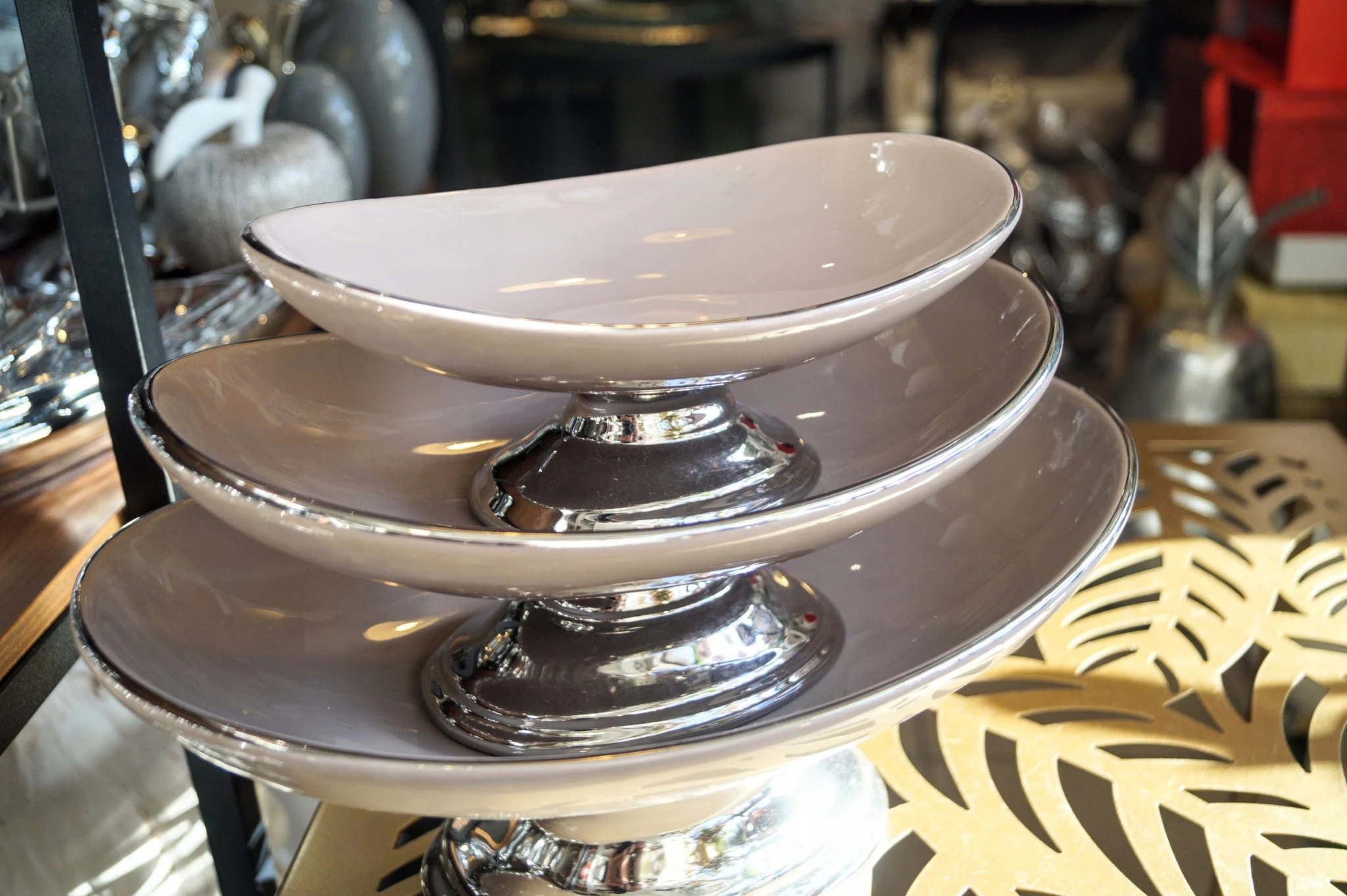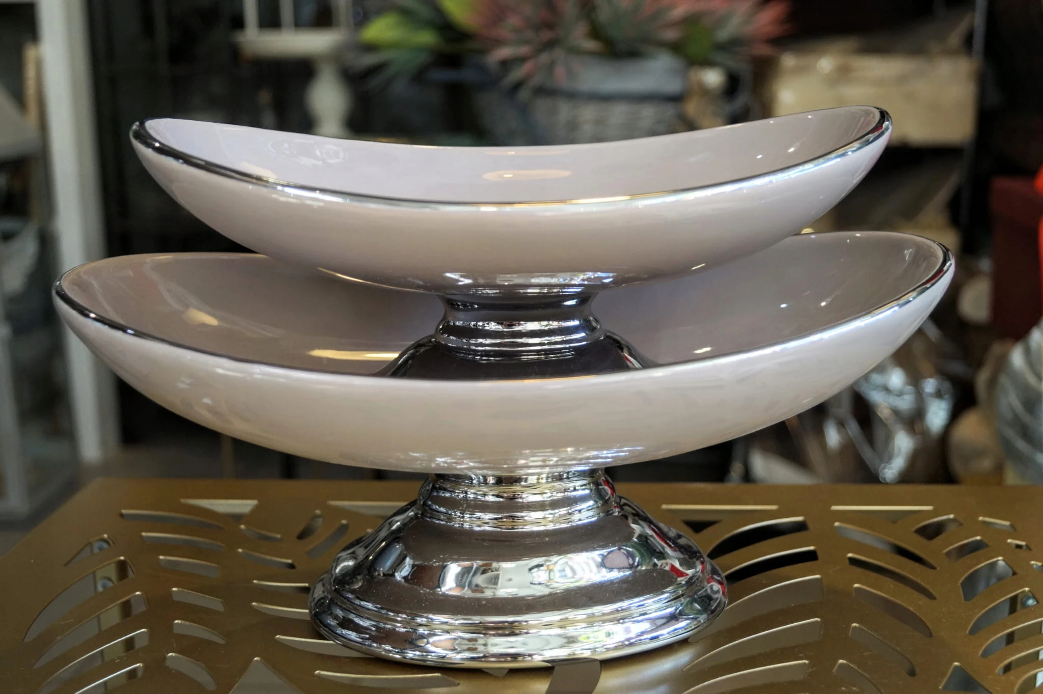 Ceramiczna patera na nóżce w kolorze srebrnym, z wysokiej jakości ceramiki szlachetnej. Podstawa i brzeg patery w kolorze srebra.