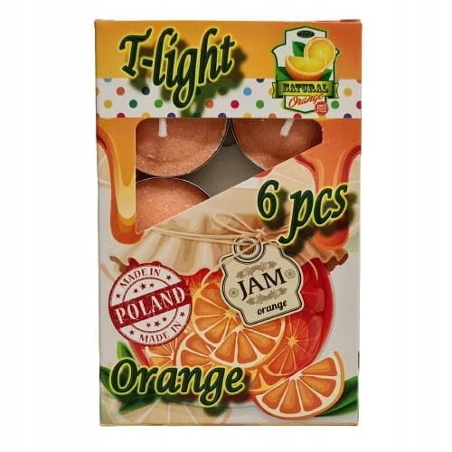 Klasyczne podgrzewacze o wspaniałym zapachu pomarańczy, zapakowane w tekturowe opakowanie.
