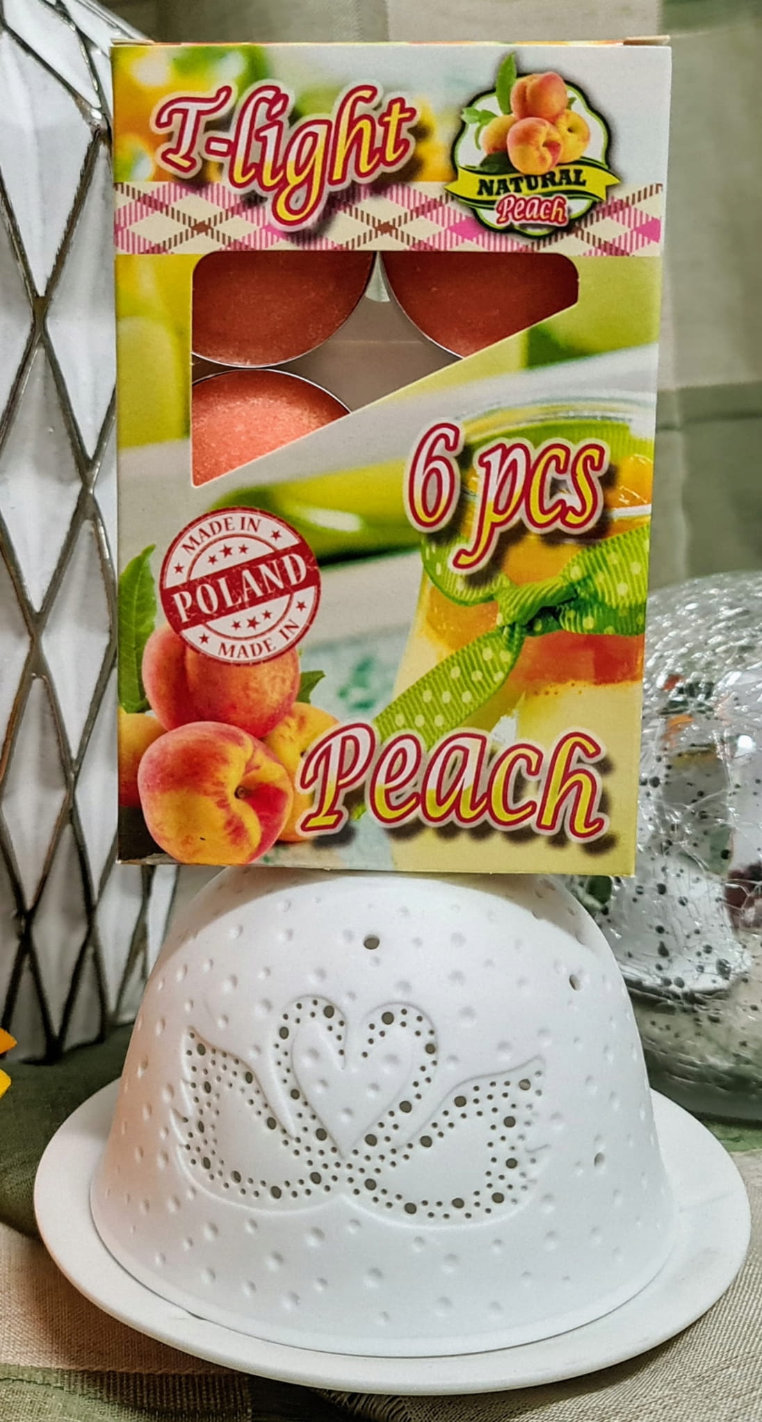 Klasyczne podgrzewacze o wspaniałym zapachu brzoskwini, zapakowane w tekturowe opakowanie.