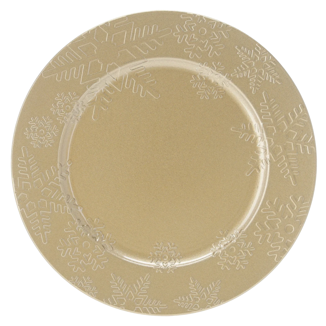 Złoty, okrągły talerz z polipropylenu o średnicy 33 cm i głębokości 2 cm ze wzorem śnieżynek.