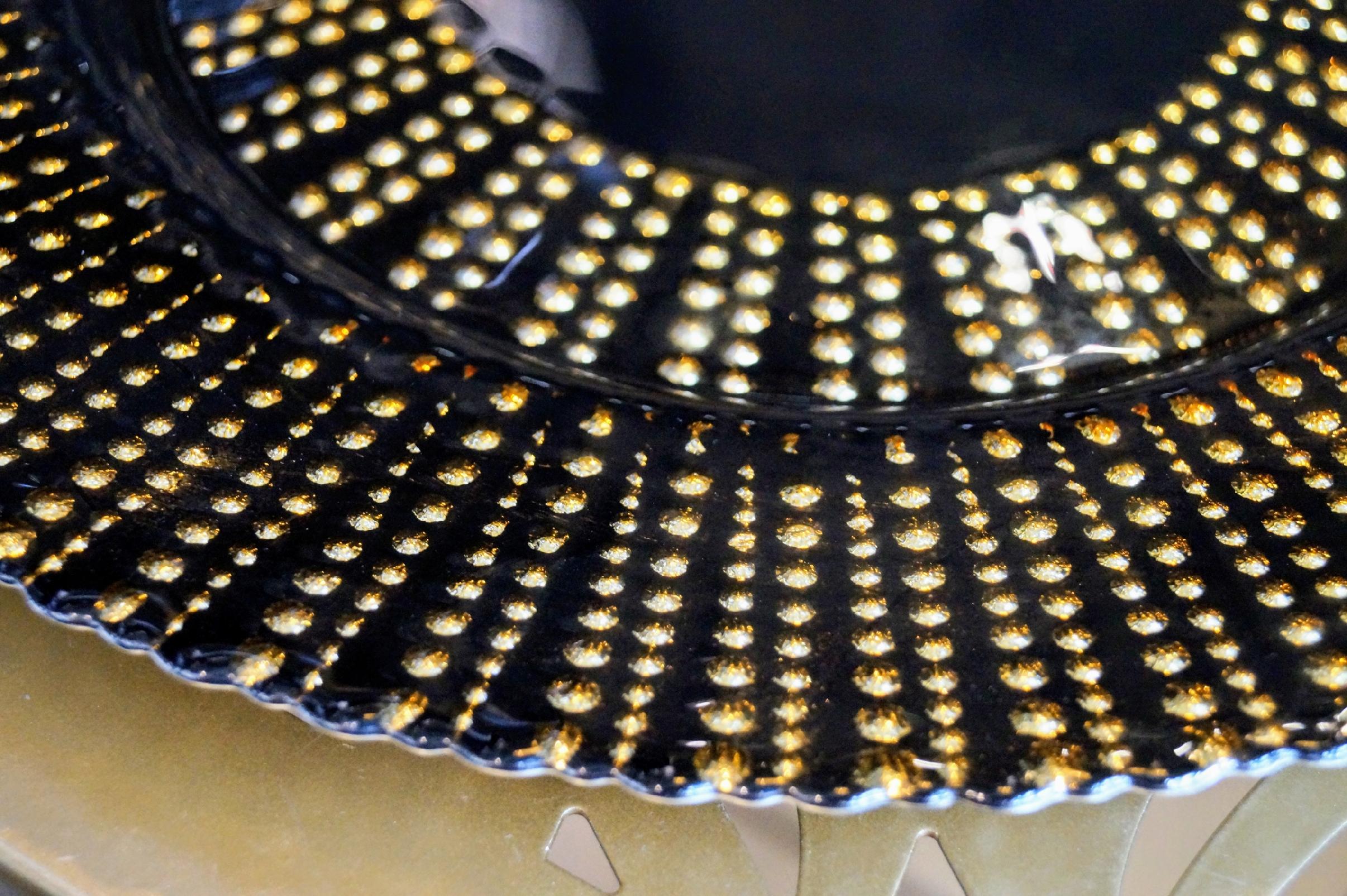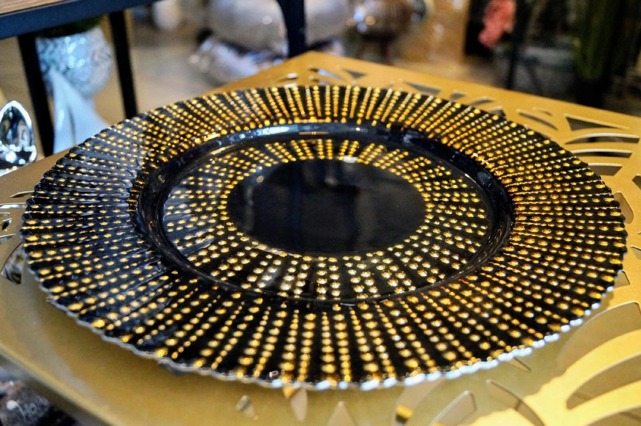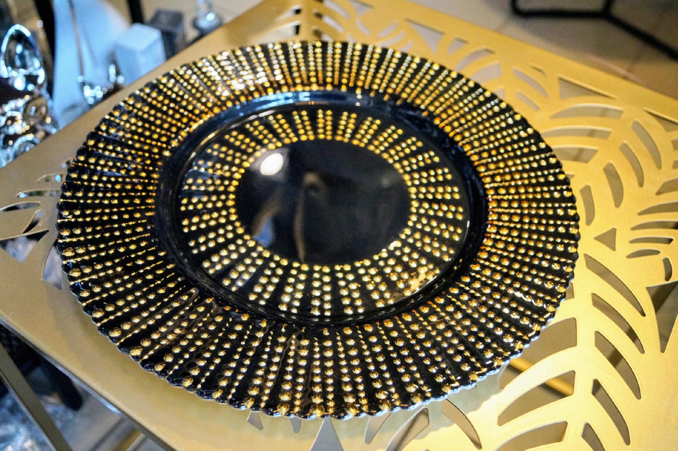 Podtalerz lub talerz na cukierki w kolorze czarnym, zdobiony złotym wzorem.