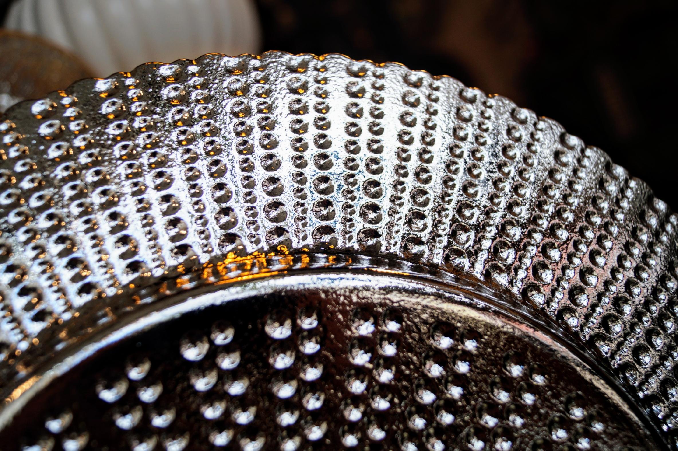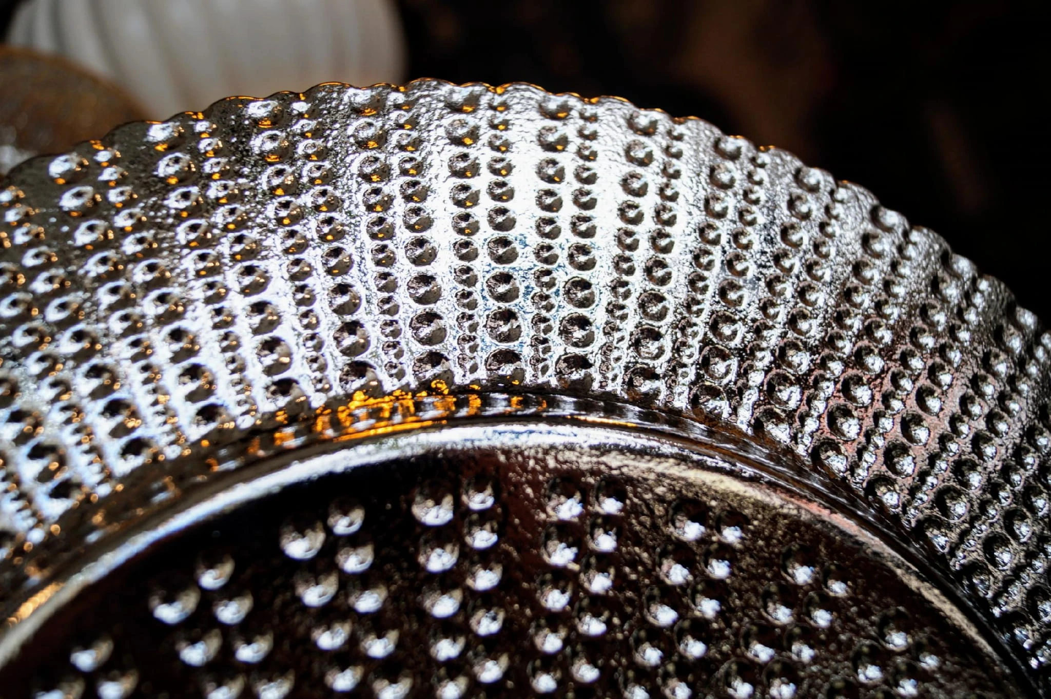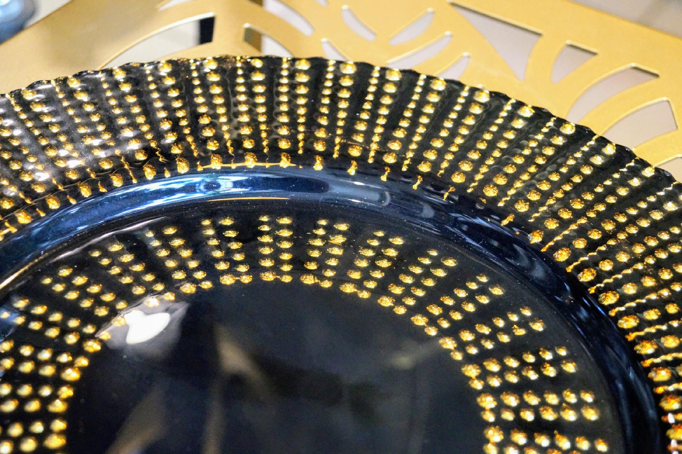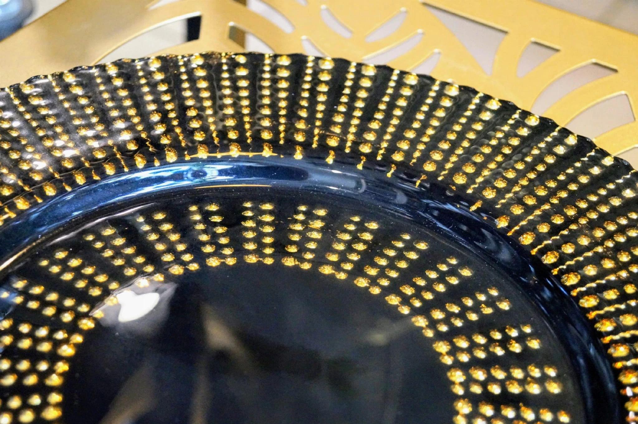 Podtalerz lub talerz na cukierki w kolorze czarnym, zdobiony złotym wzorem.