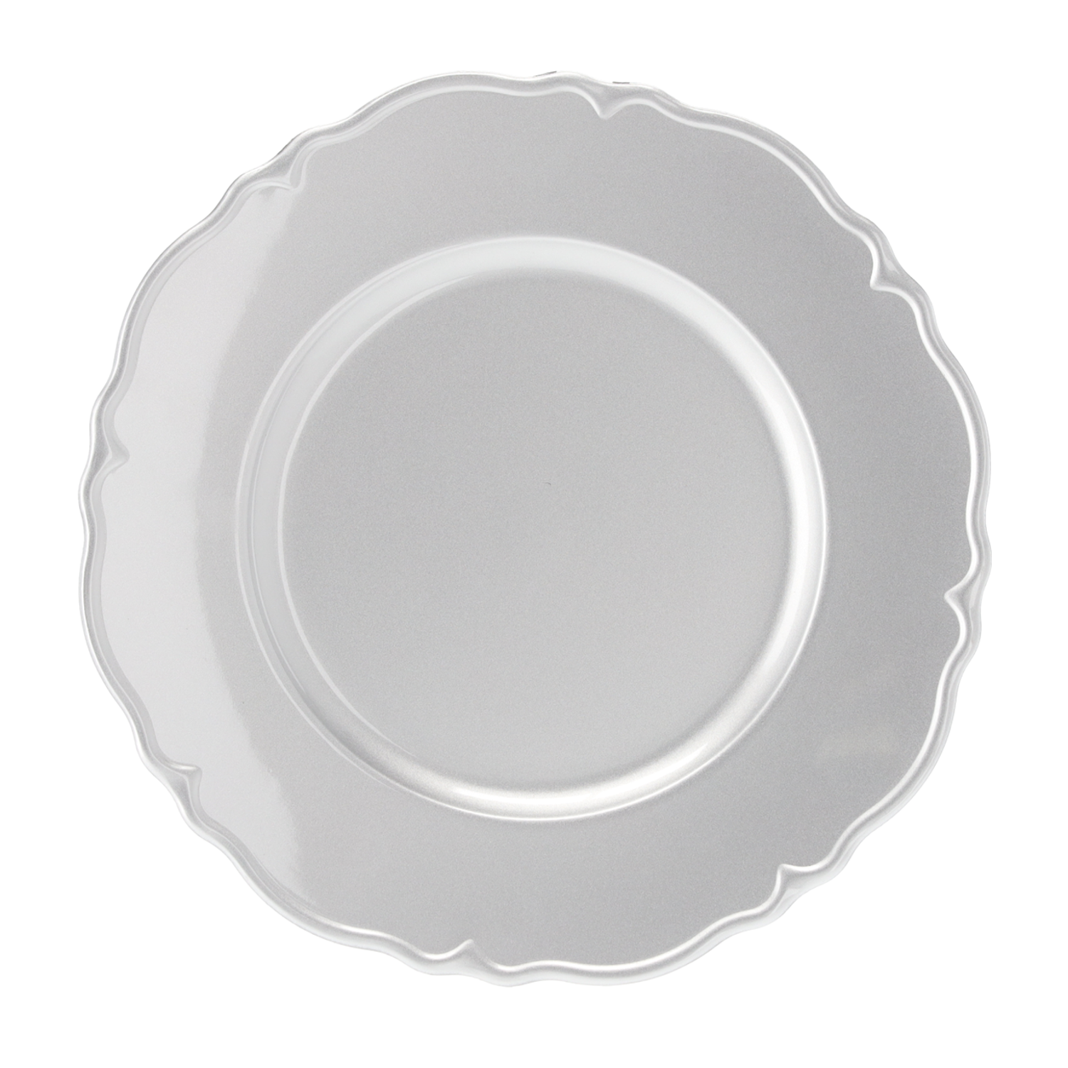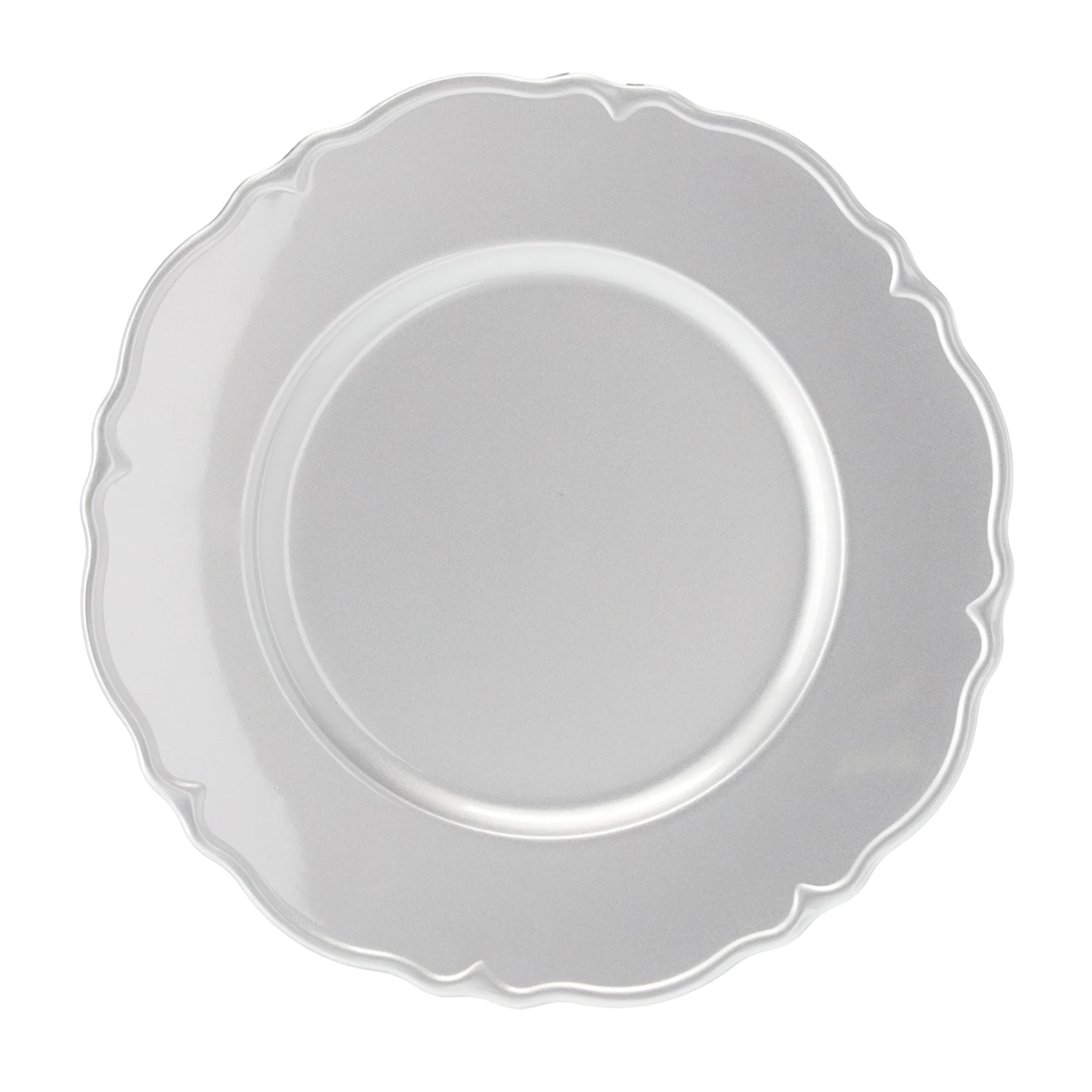 Srebrny, okrągły talerz z polipropylenu o średnicy 33 cm i głębokości 2 cm.