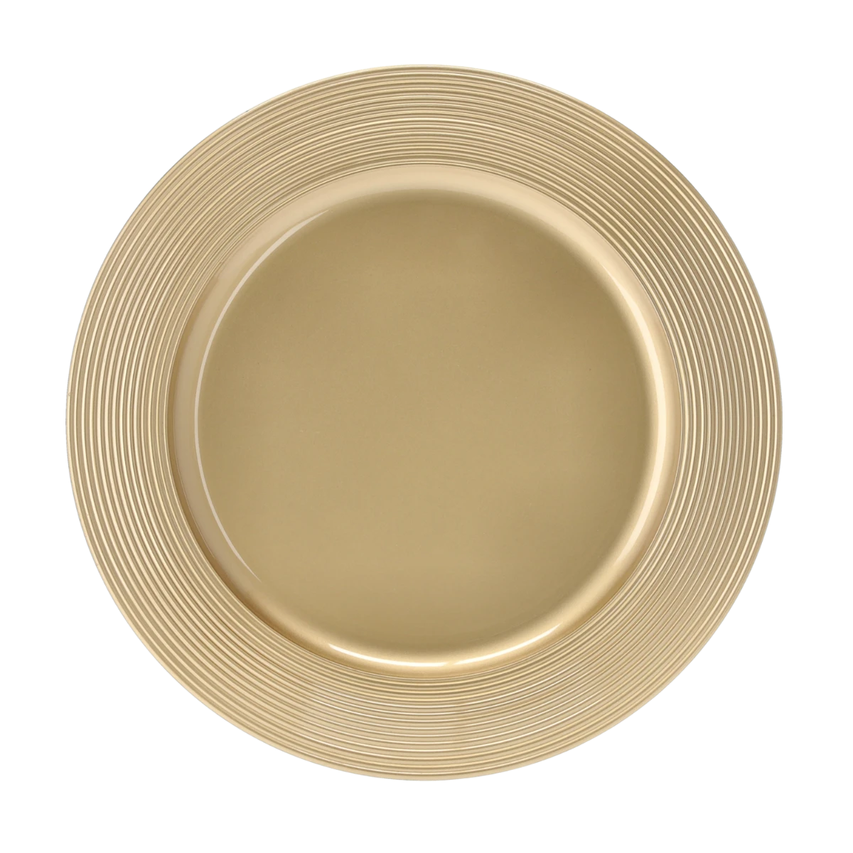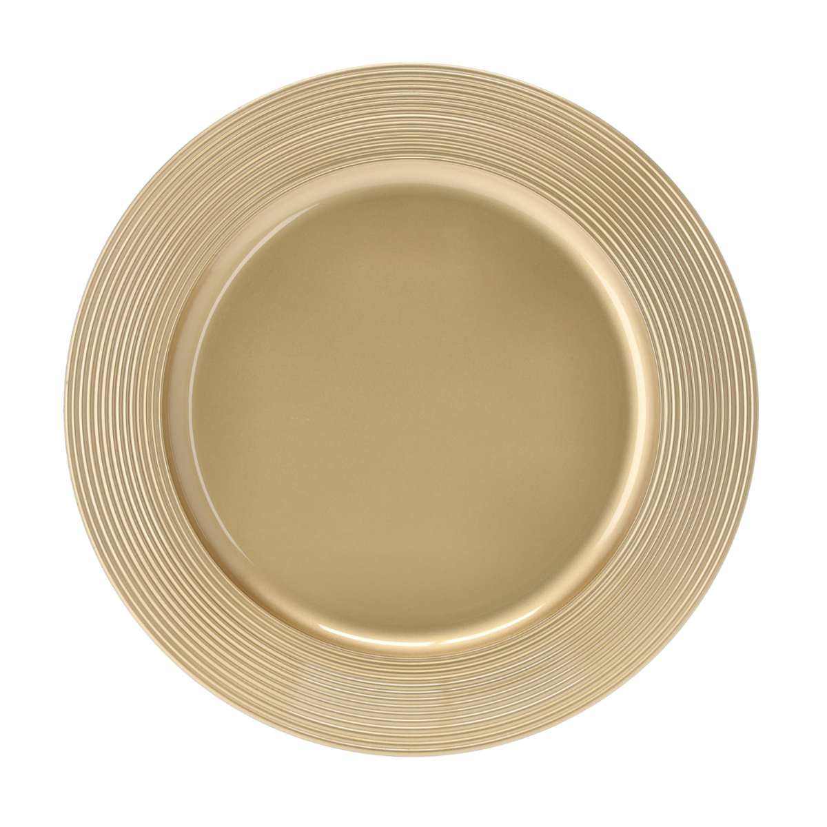 Złoty, okrągły talerz z polipropylenu o średnicy 33 cm i głębokości 2 cm z drobnym żłobieniem.