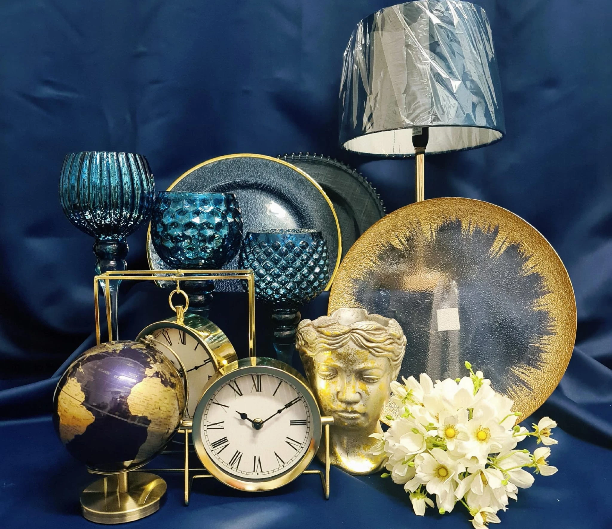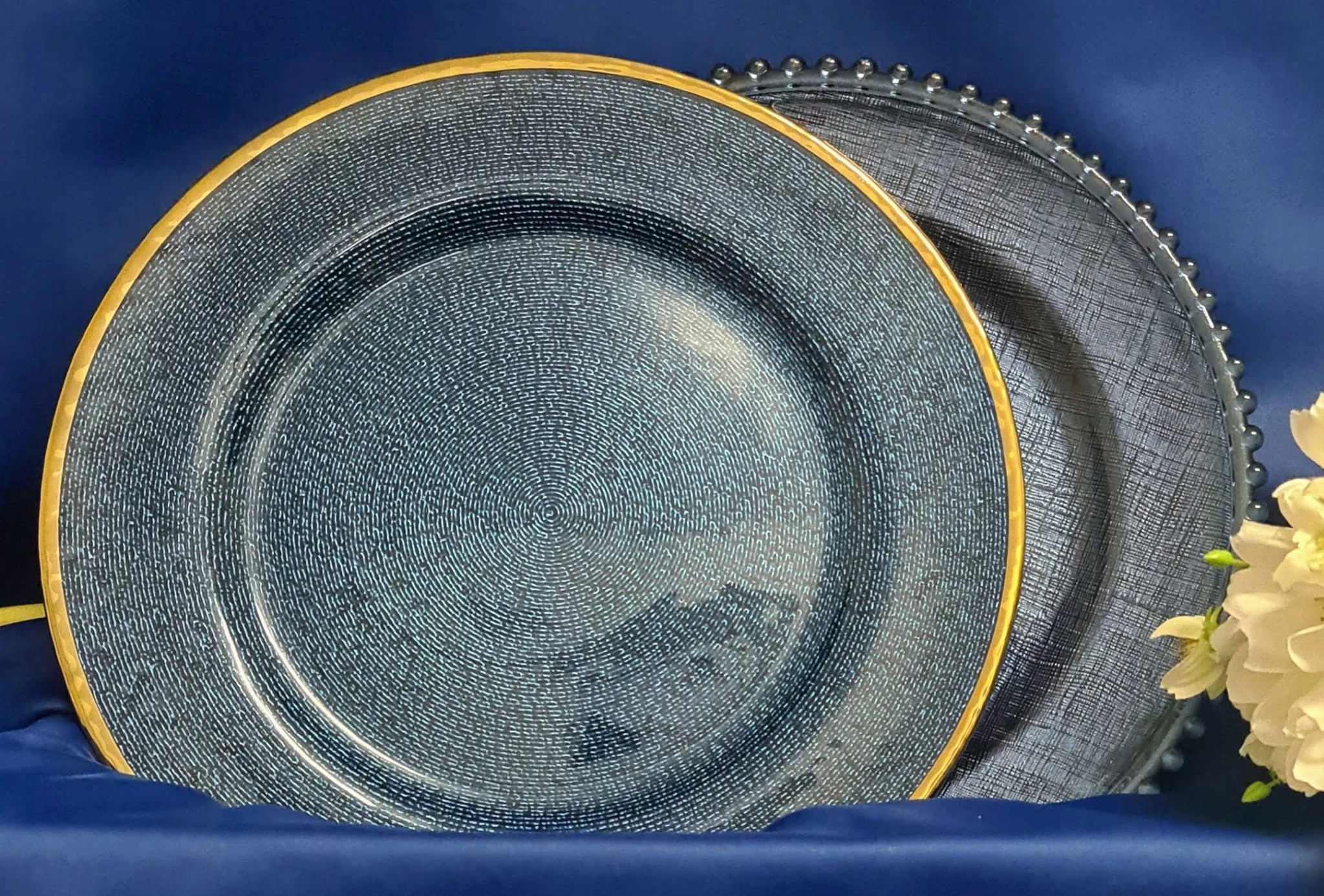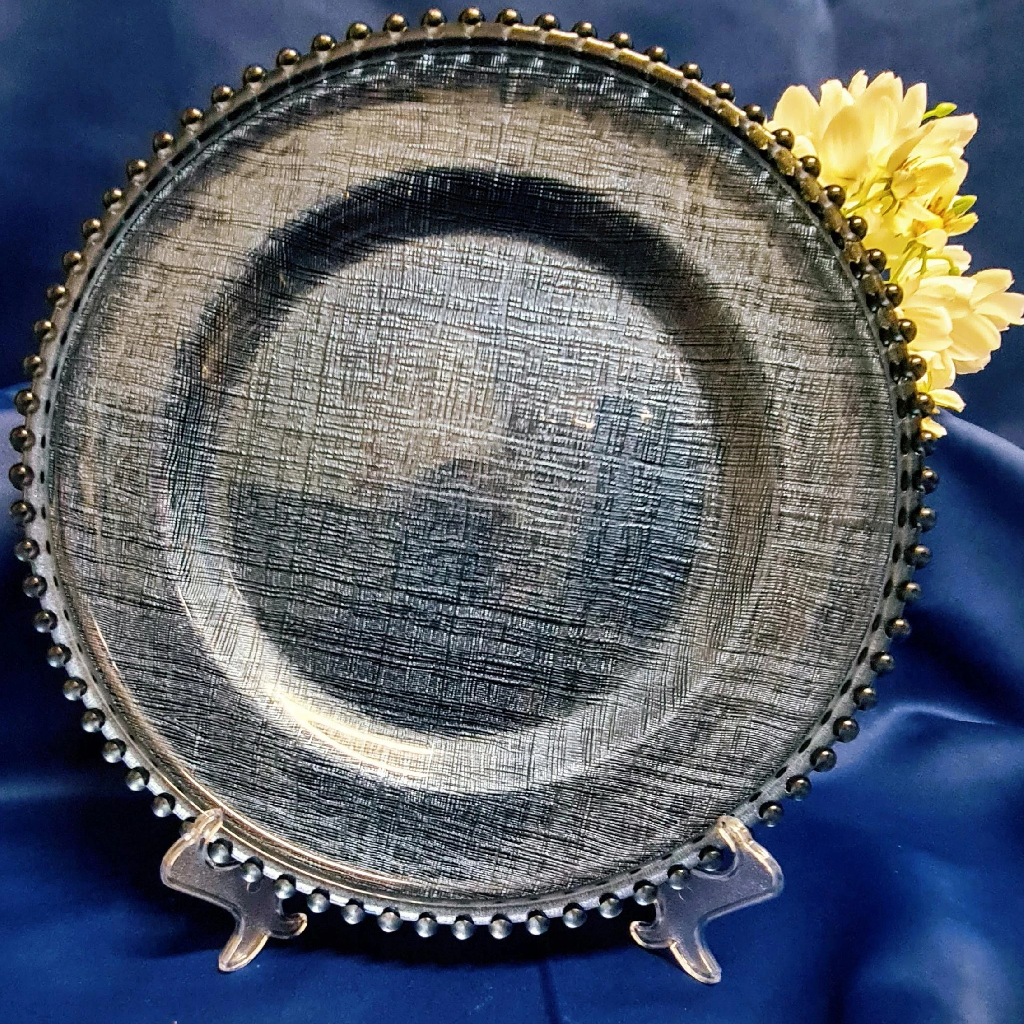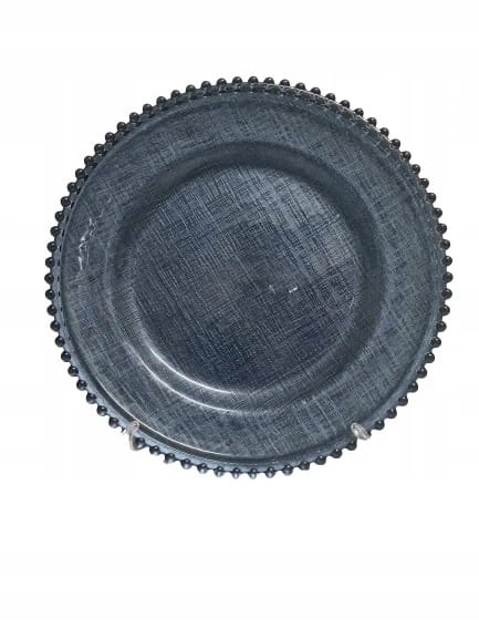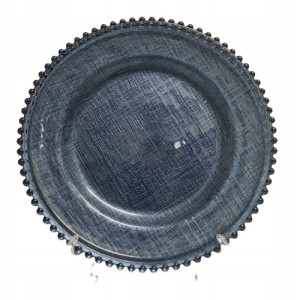 Szklany, ozdobny podtalerz lub talerz na ciasto, owoce jak również na świece w kolorze ciemnoniebieskim z kuleczkami. Nada niepowtarzalnego charakteru wnętrzu.