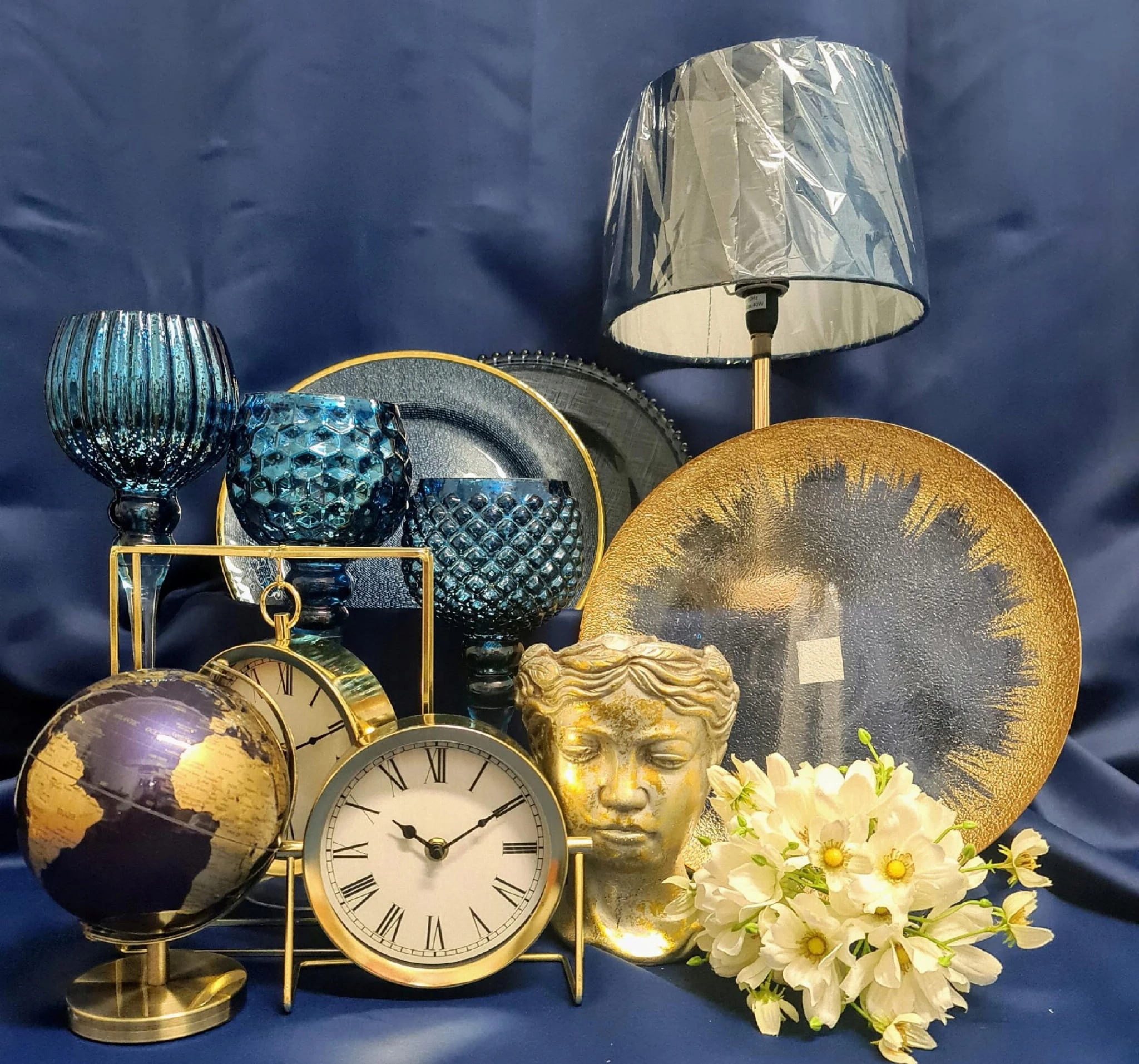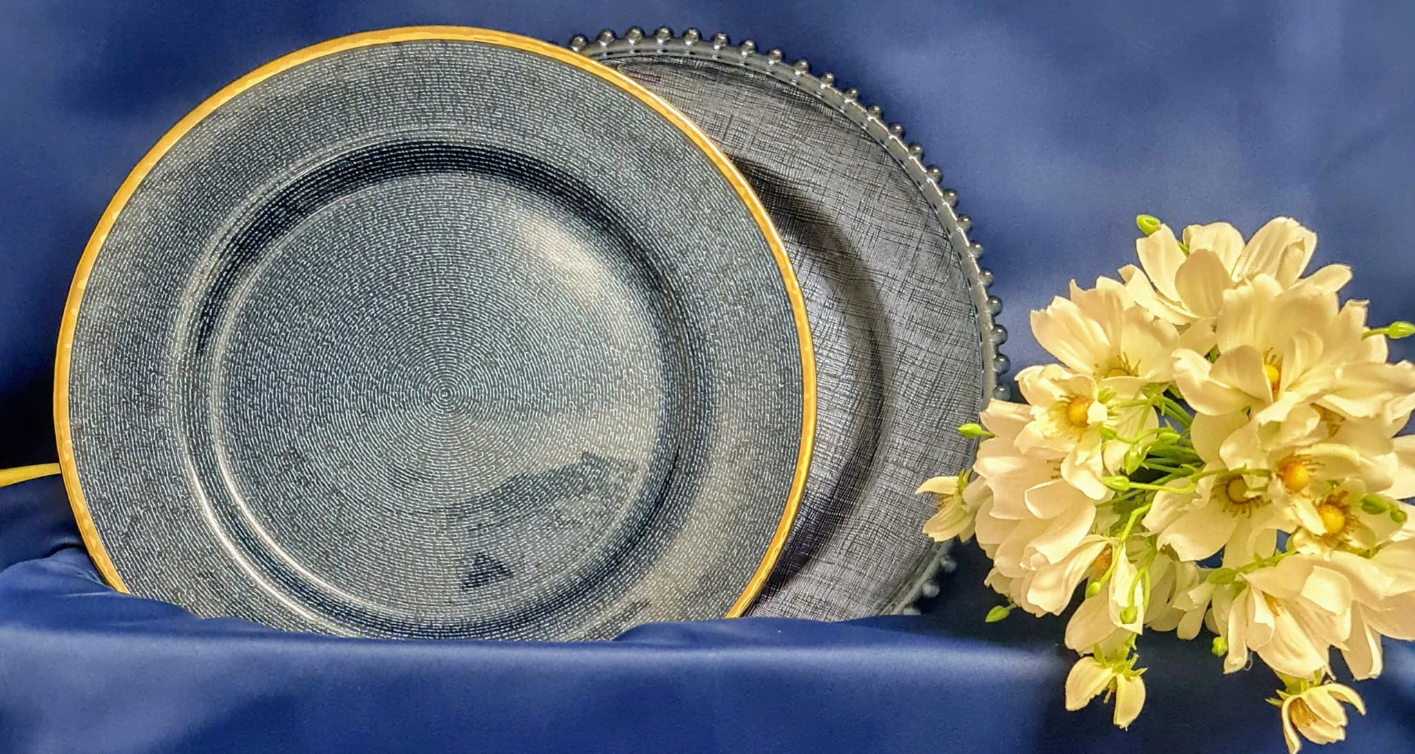 Szklany, ozdobny podtalerz lub talerz na ciasto, owoce jak i również na świece w kolorze granatowym, ze złotym brzegiem. Nada niepowtarzalnego charakteru i klimatu wnętrzu.