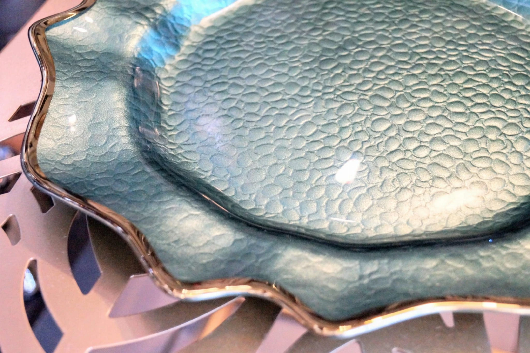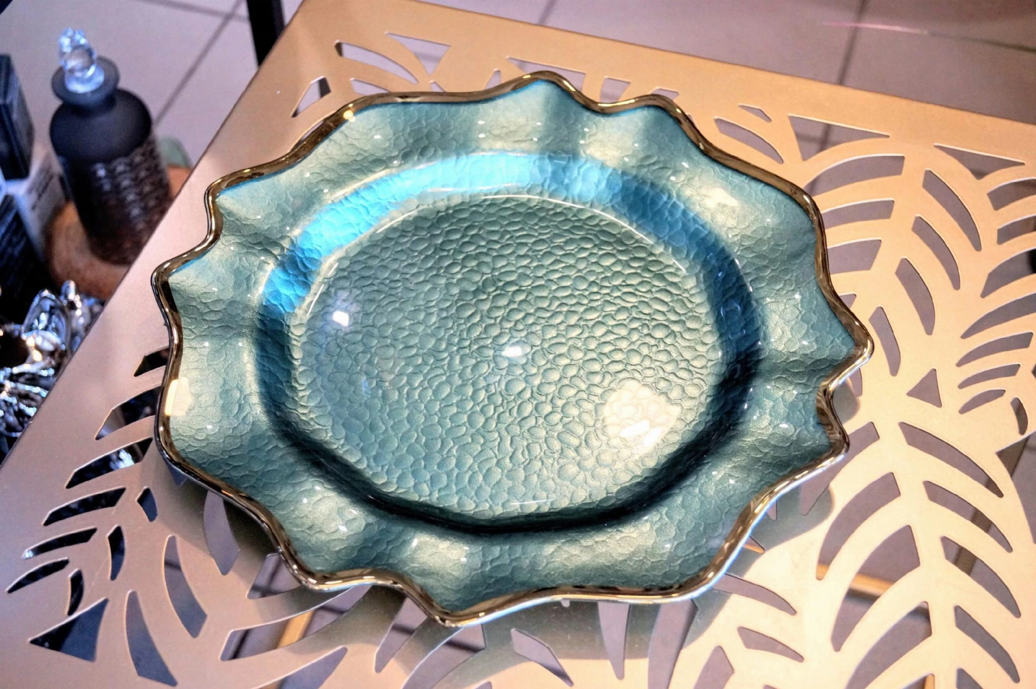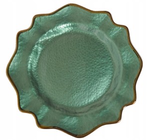 Szklany, ozdobny podtalerz lub talerz na ciasto, w kolorze miętowym, z nieregularnym brzegiem w złotym wykończeniu.