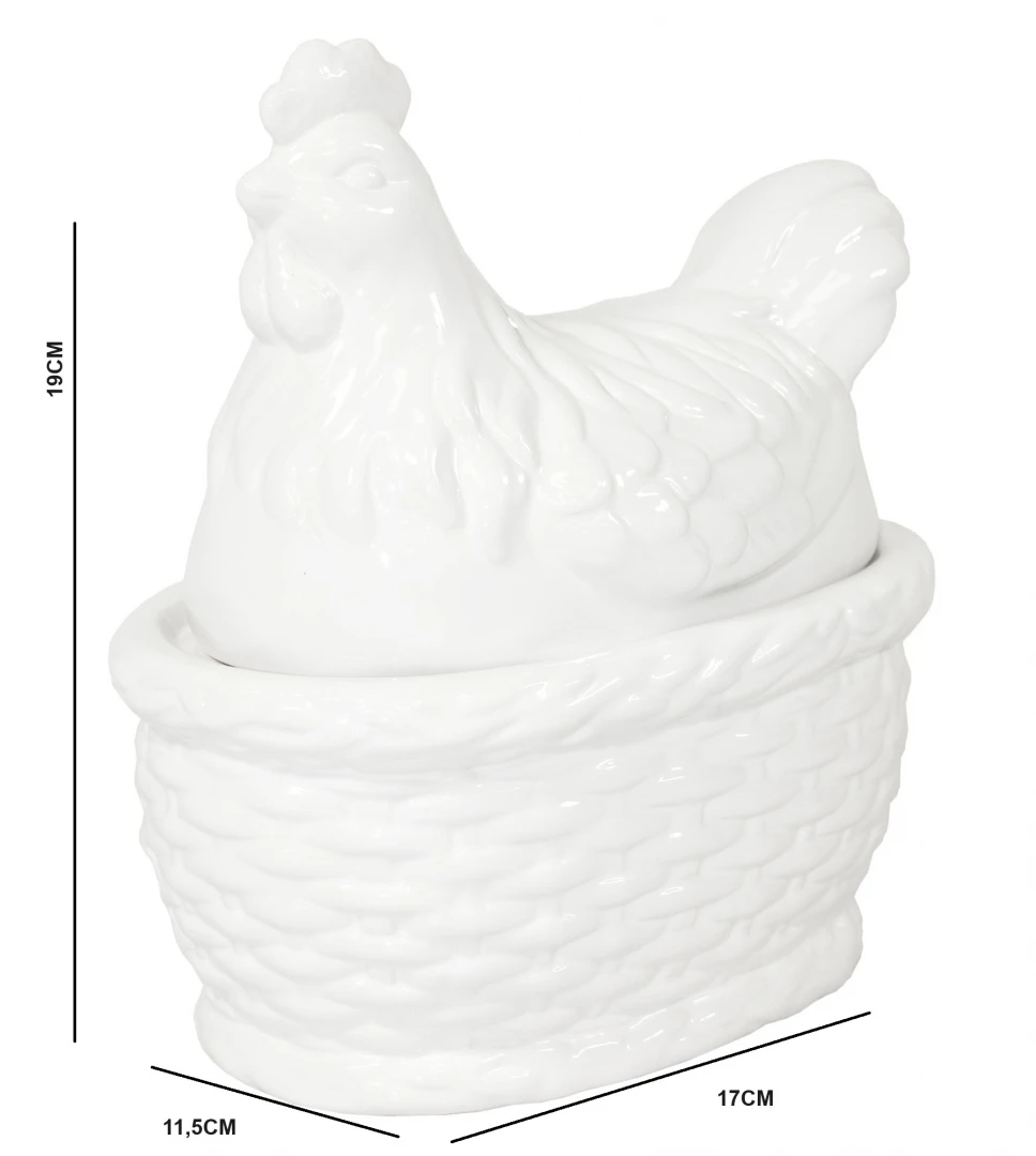 Dodaj swojej kuchni lub jadalni wyjątkowego charakteru dzięki stylowemu pojemnikowi w kształcie kury. Wykonany z białej ceramiki szlachetnej o wysokim połysku, pojemnik łączy w sobie tradycyjny motyw wiejski z nowoczesną, minimalistyczną formą. Lśniąca powierzchnia sprawia, że naczynie prezentuje się niezwykle elegancko i higienicznie.
