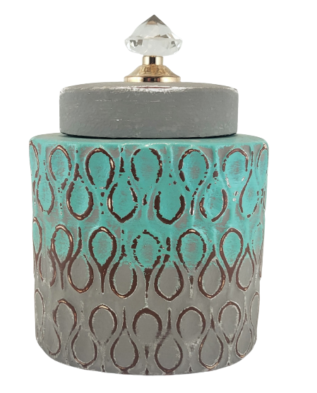 Pojemnik wykonany jest z ceramiki. Piękne denko zdobi miętowo-szare ombre tłoczonych zdobień. Atrakcyjny uchwyt w formie kryształu dodaje zadziornego charakteru całości.