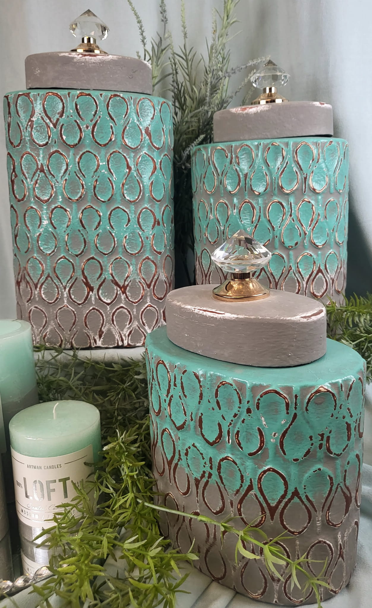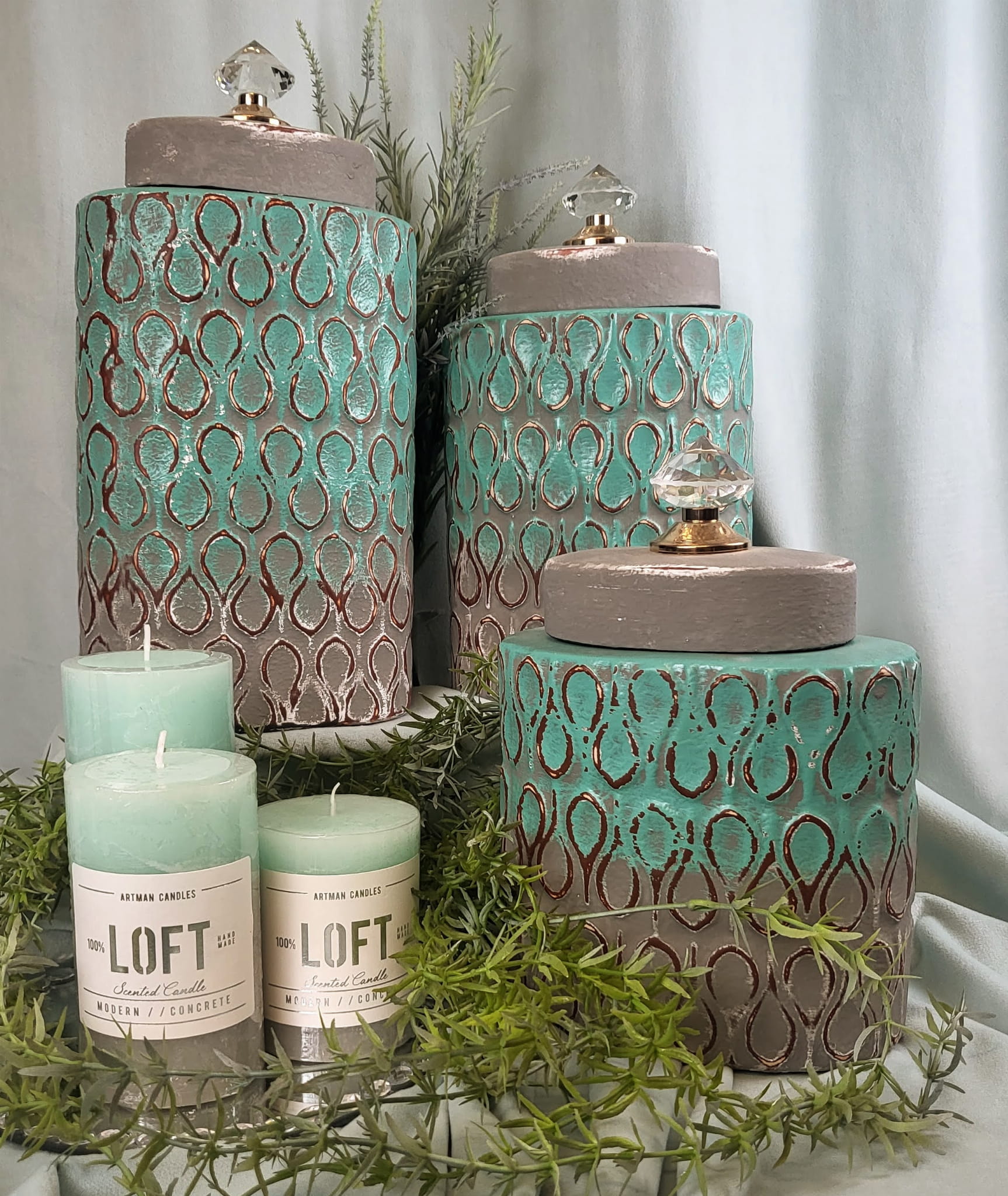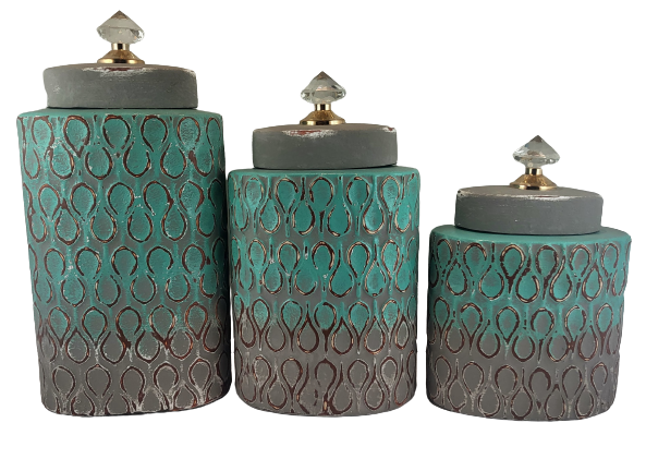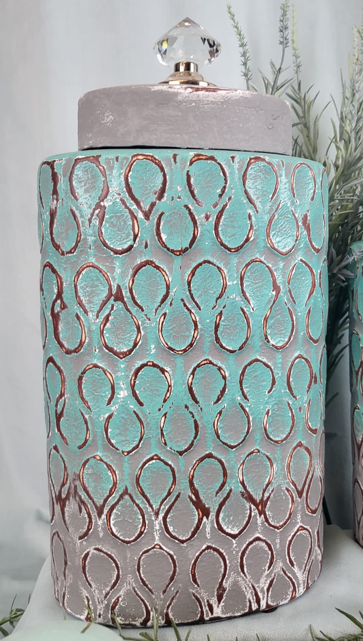 Pojemnik wykonany jest z ceramiki. Piękne denko zdobi miętowo-szare ombre tłoczonych zdobień. Atrakcyjny uchwyt w formie kryształu dodaje zadziornego charakteru całości.