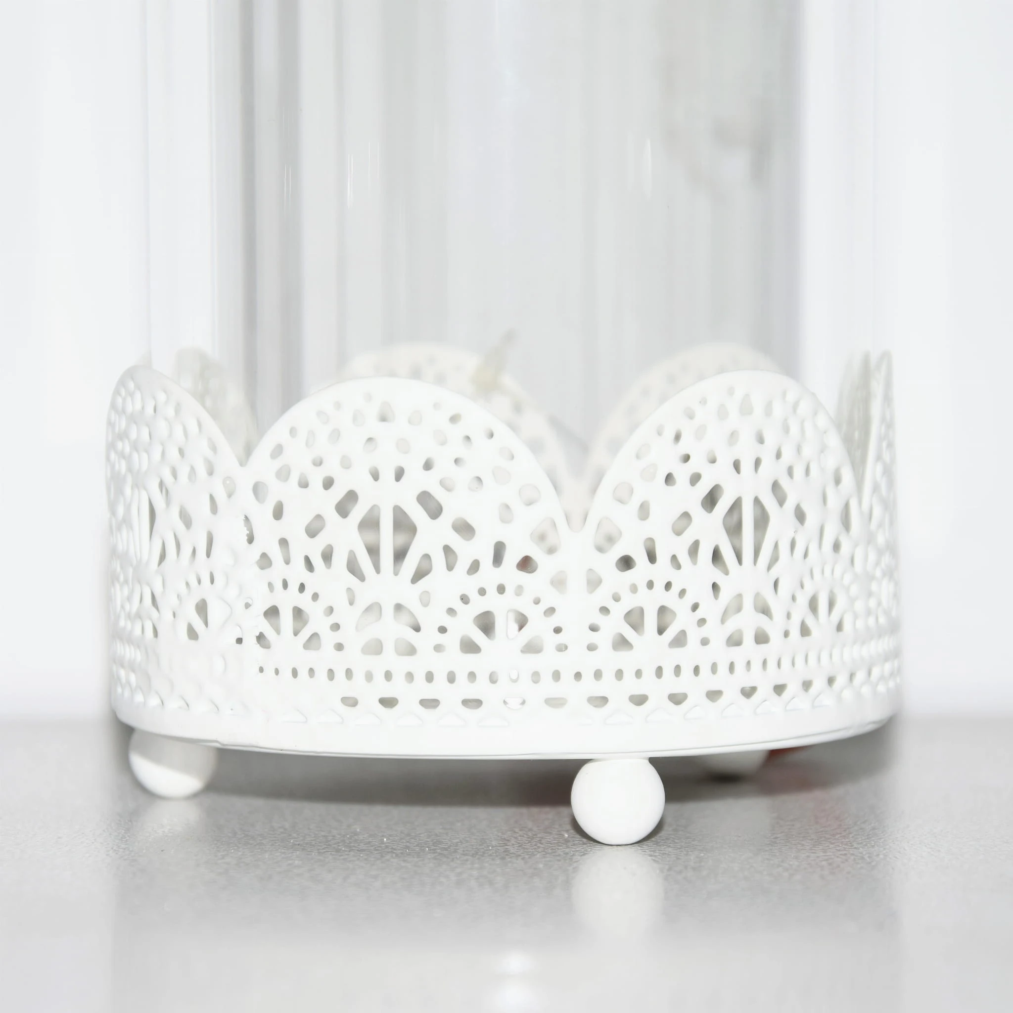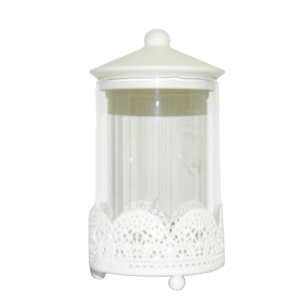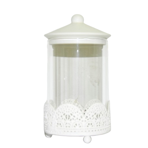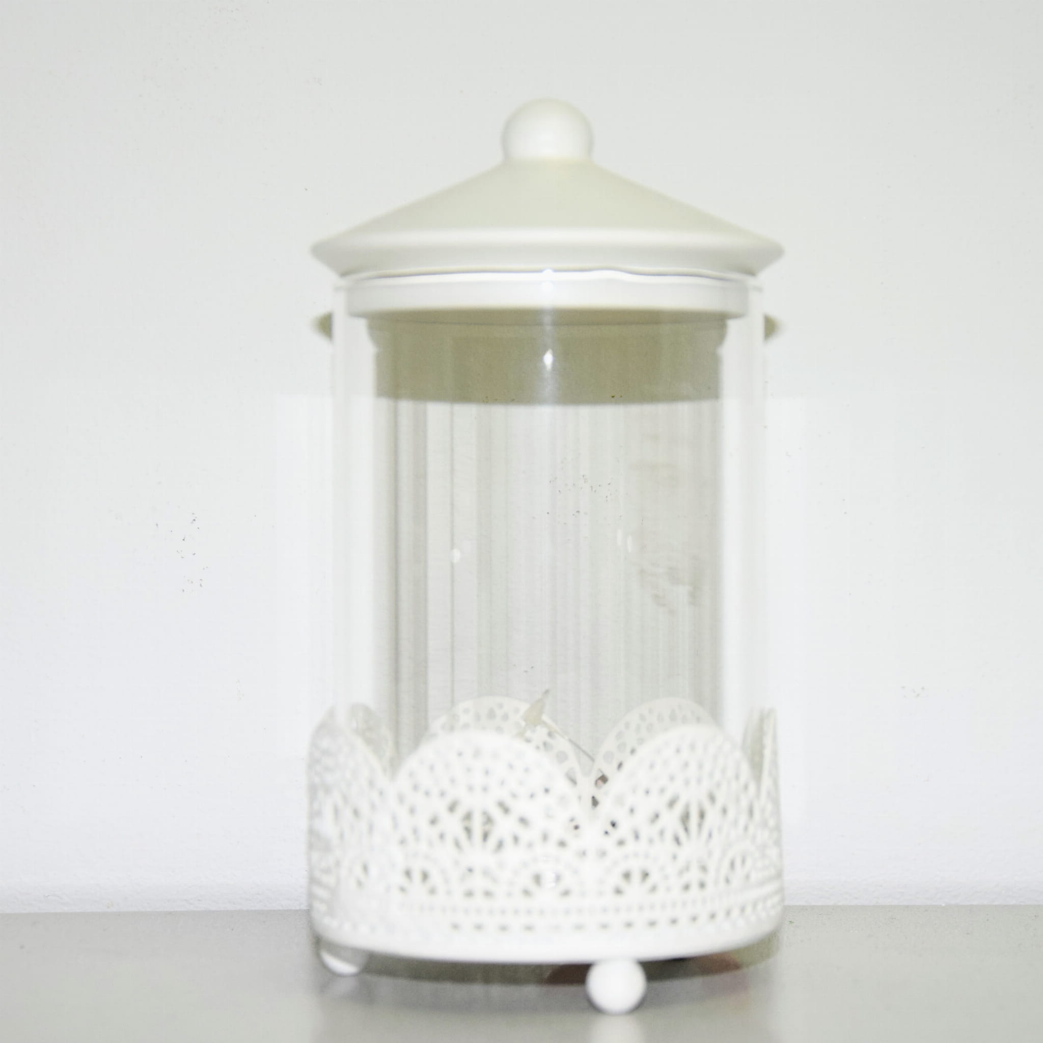 Szklany pojemnik z ażurowym metalowym spodem i przykrywką.