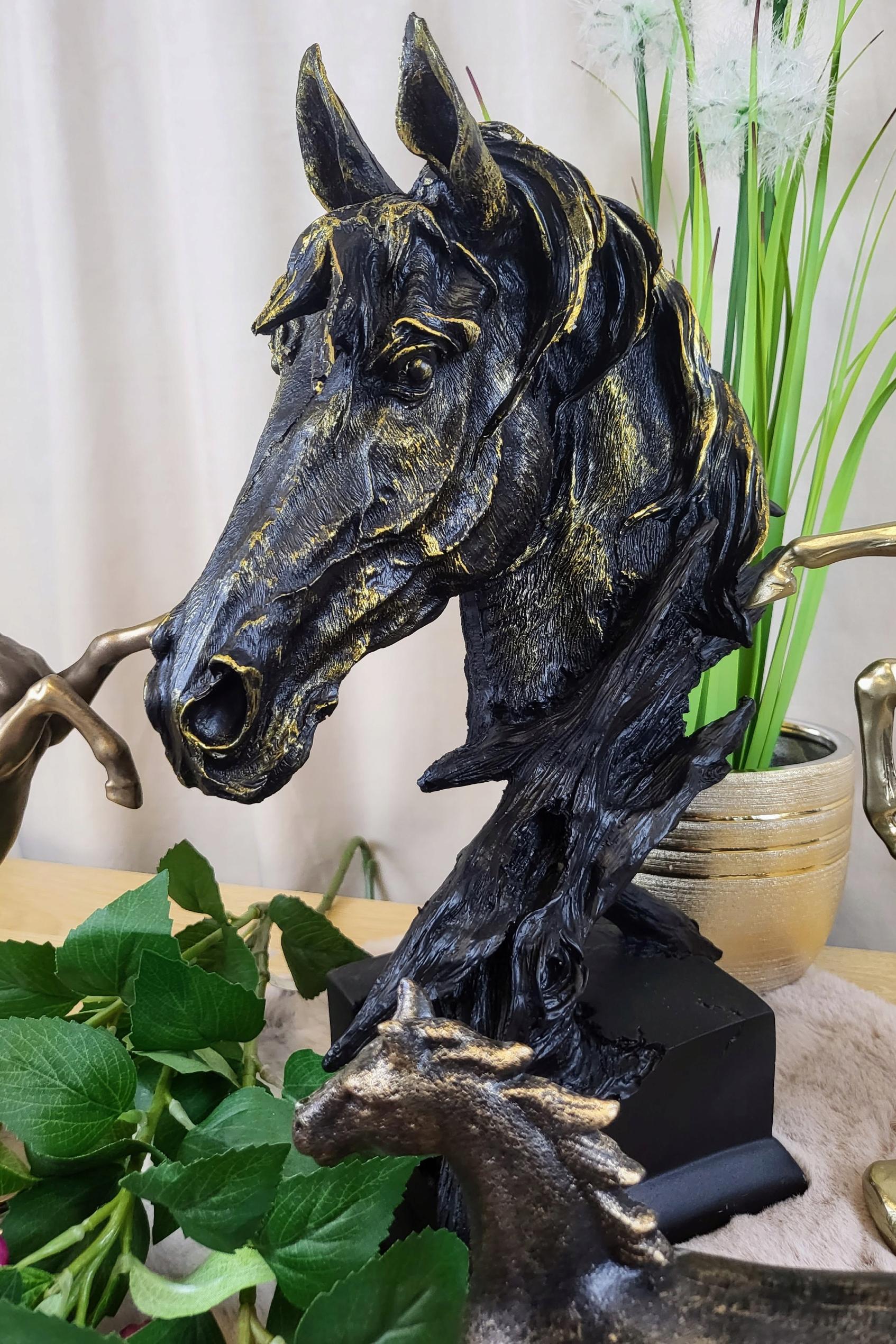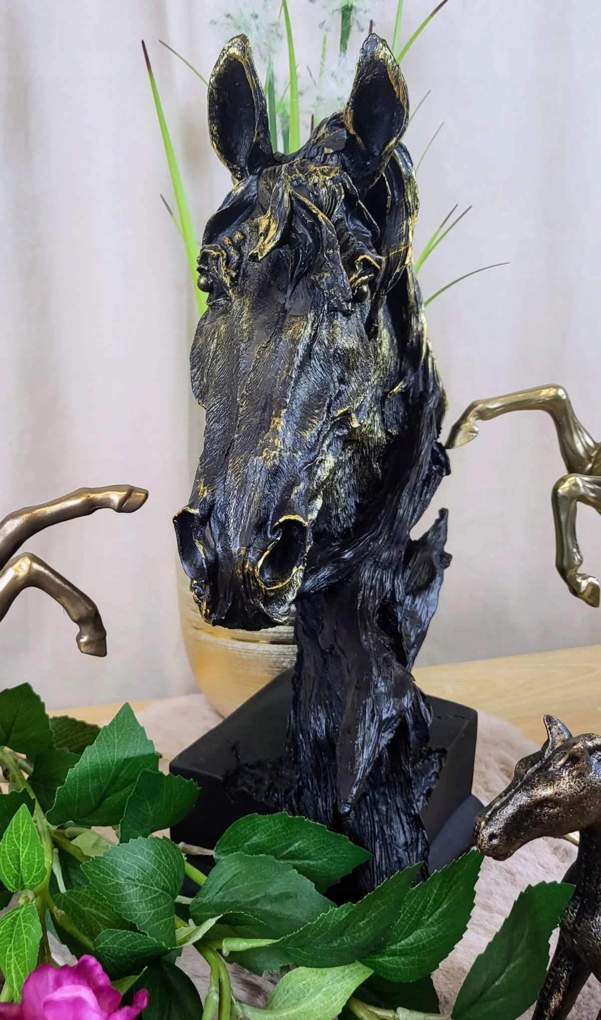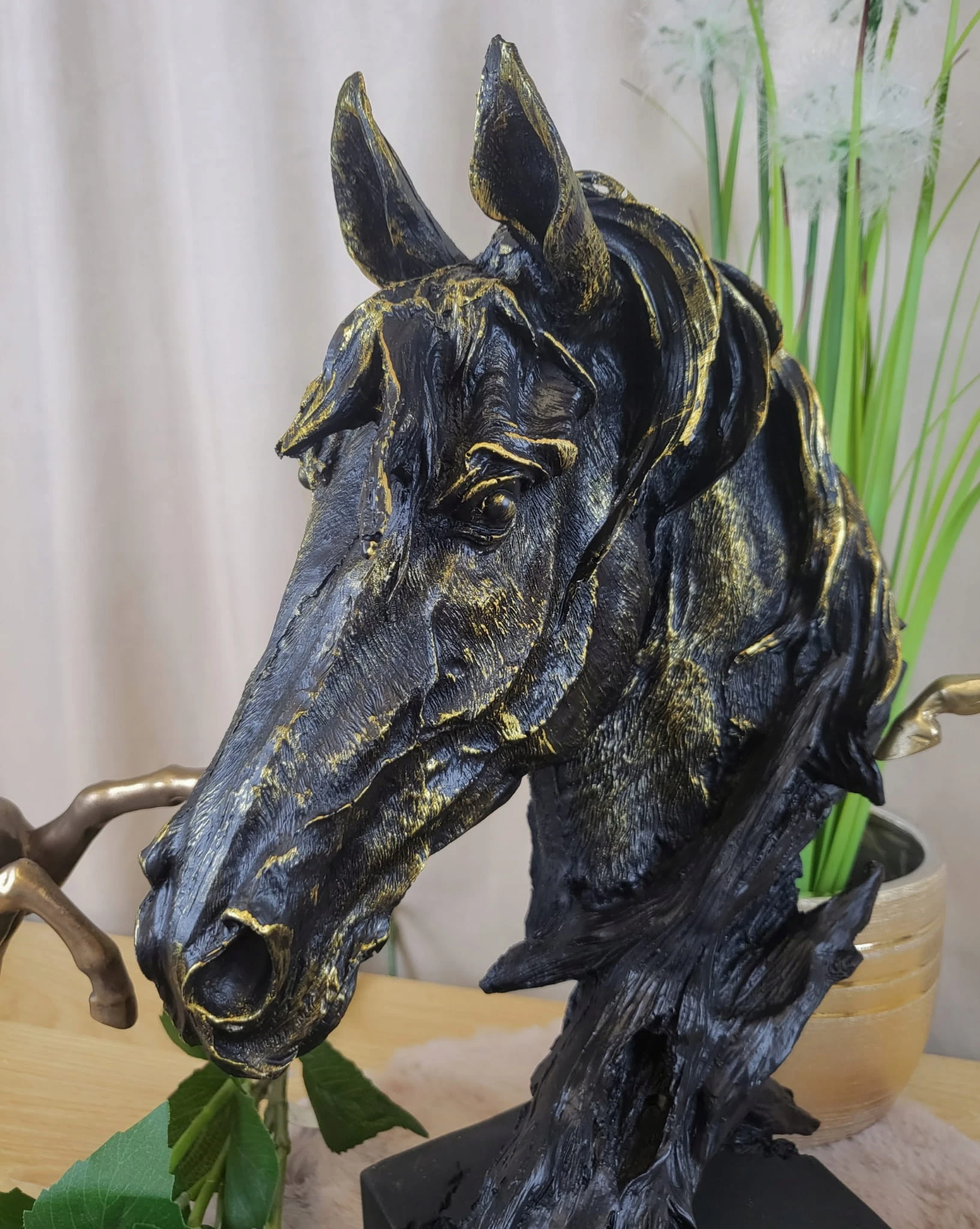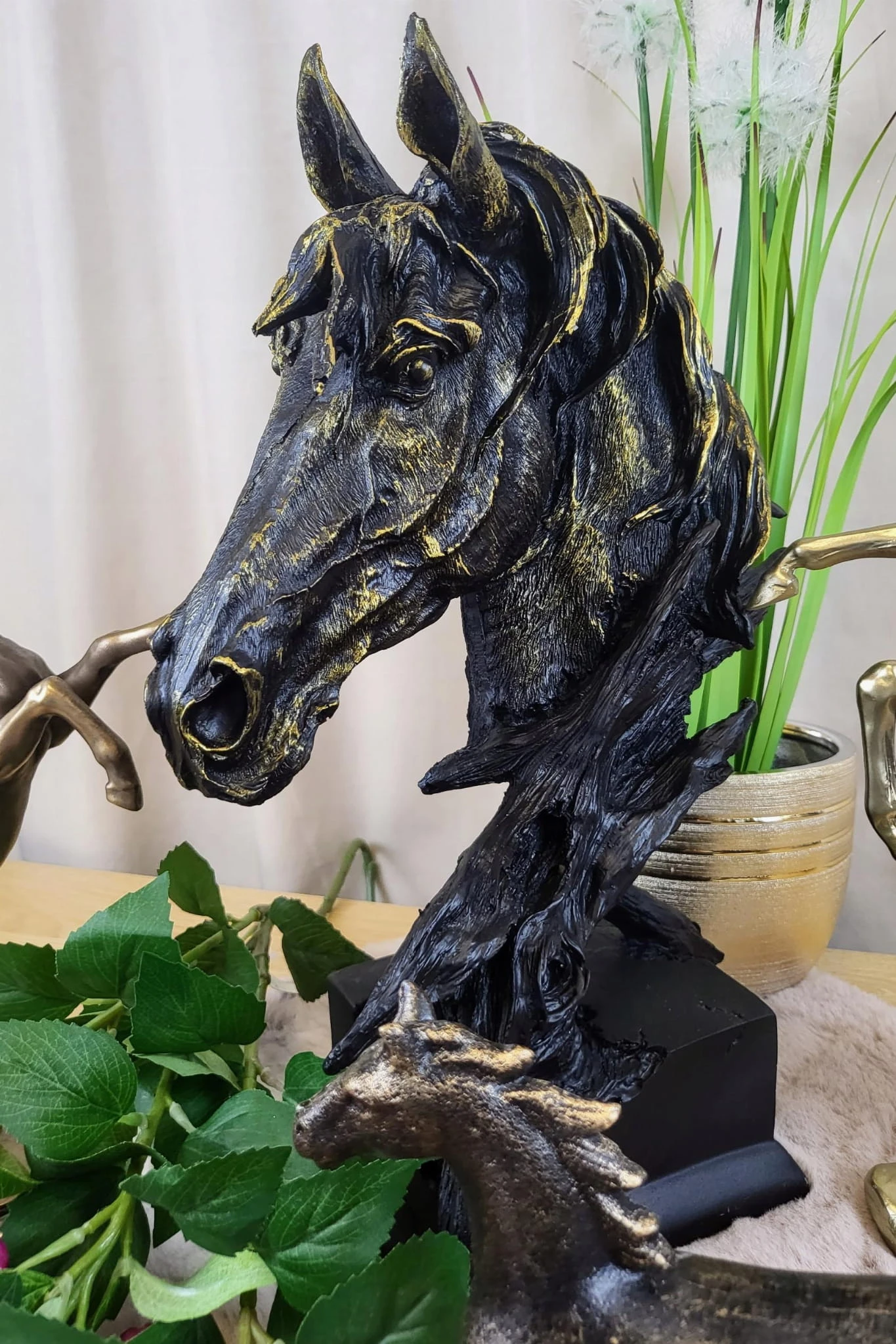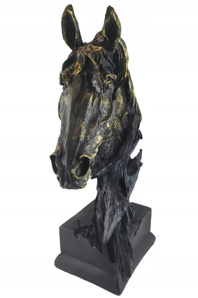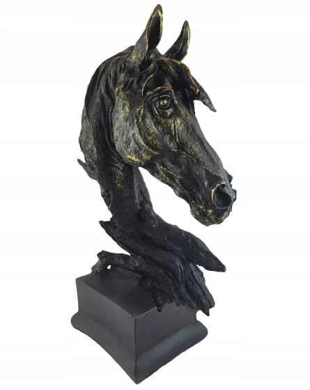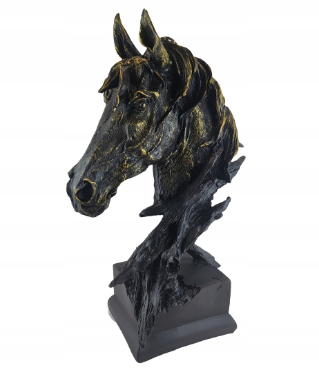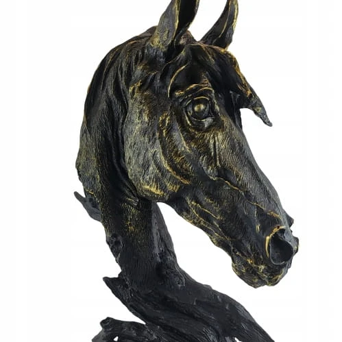 Złoto-czarna figurka na masywnej podstawie przedstawiająca popiersie konia. Postarzana rzeźba z efektem patyny, miękko odbija światło.