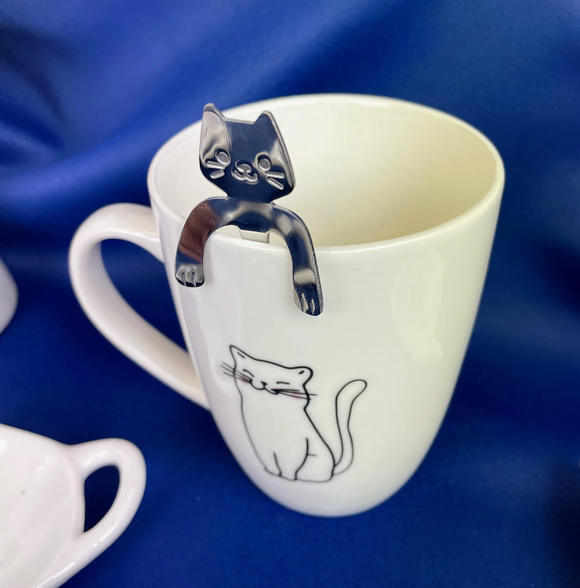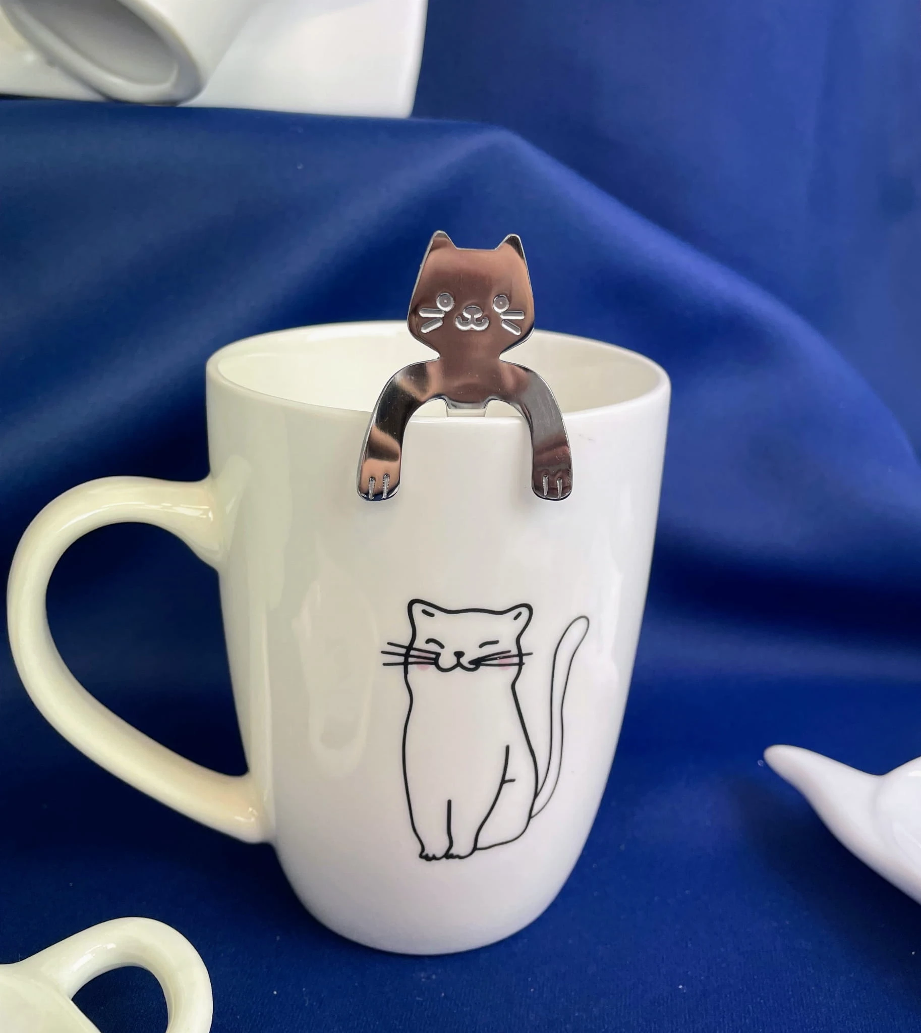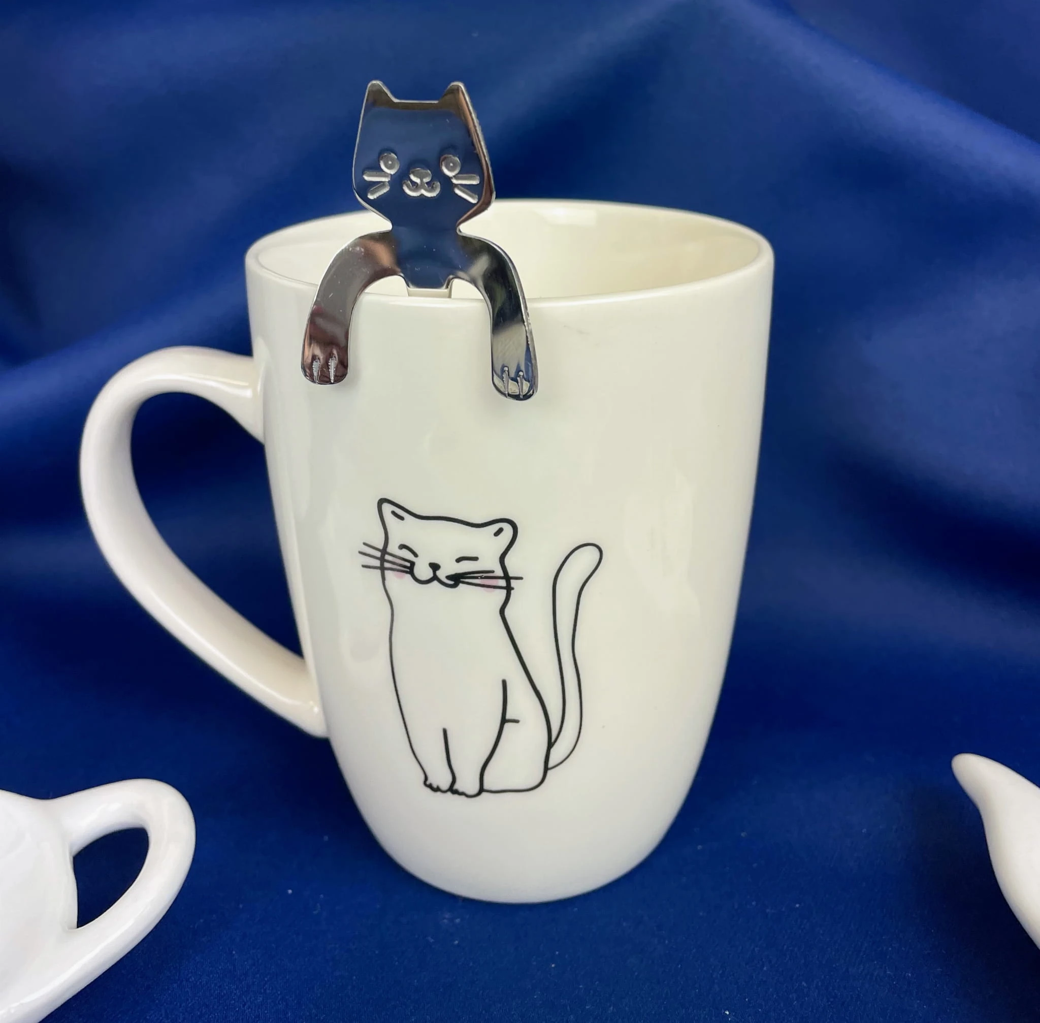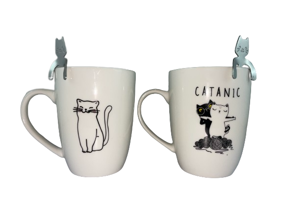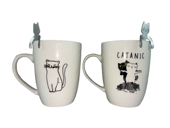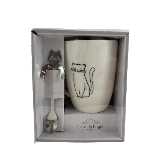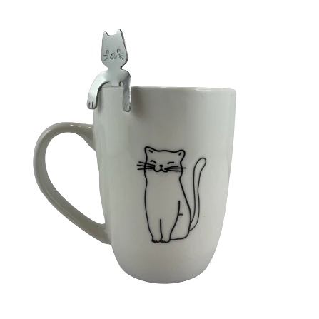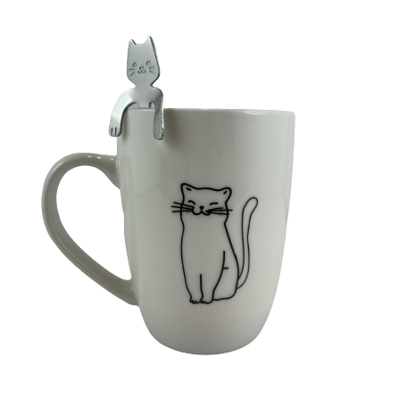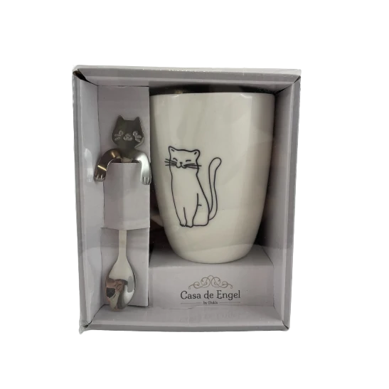 Kubek w komplecie z metalową łyżeczką. Łyżeczka w kształcie kota, zawieszana na kubku. Po obu stronach kubka widnieje rysunek kota. Kubek i łyżeczka spakowane są w ozdobne pudełko.