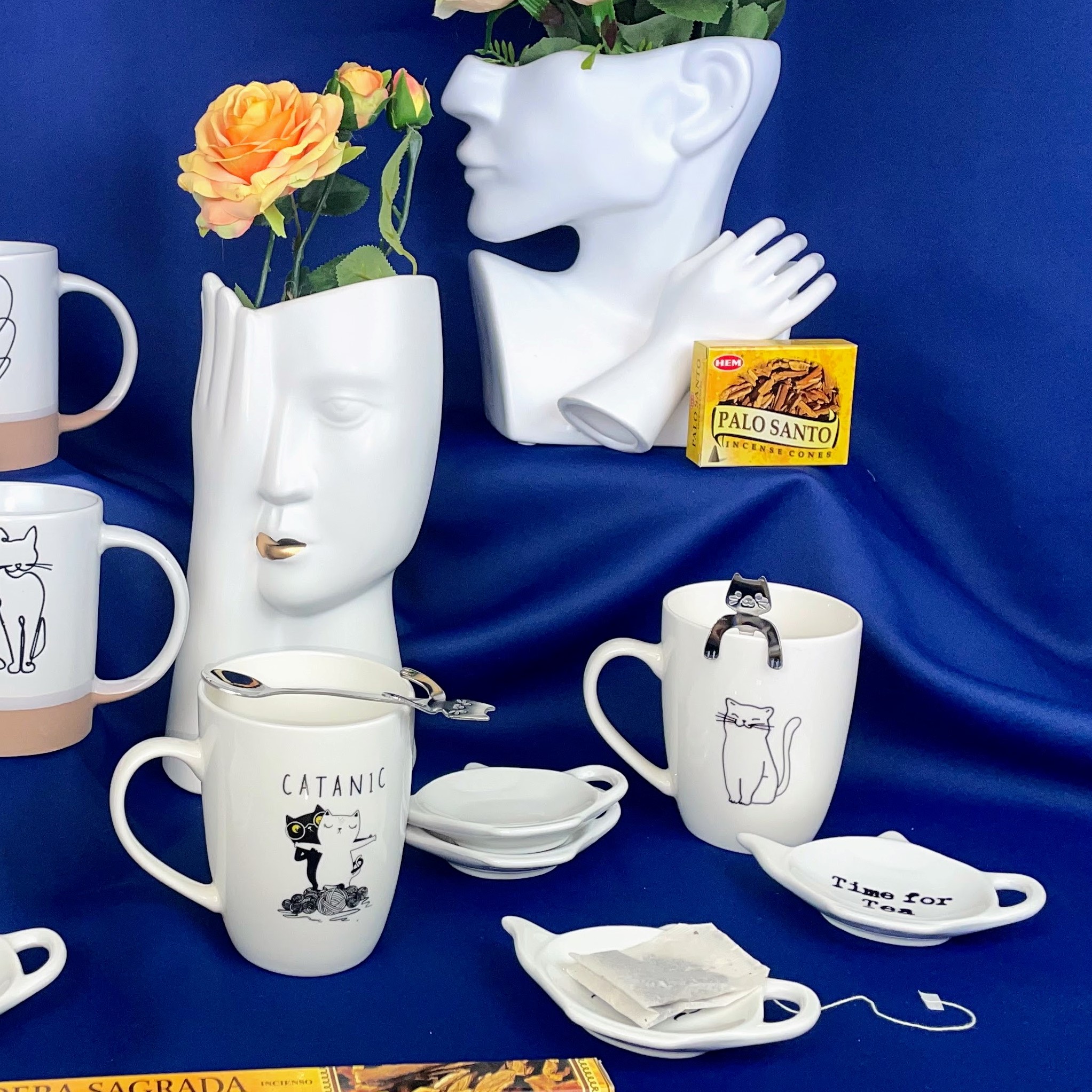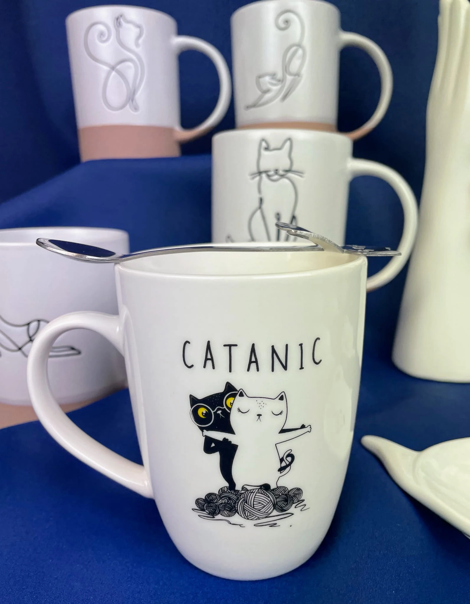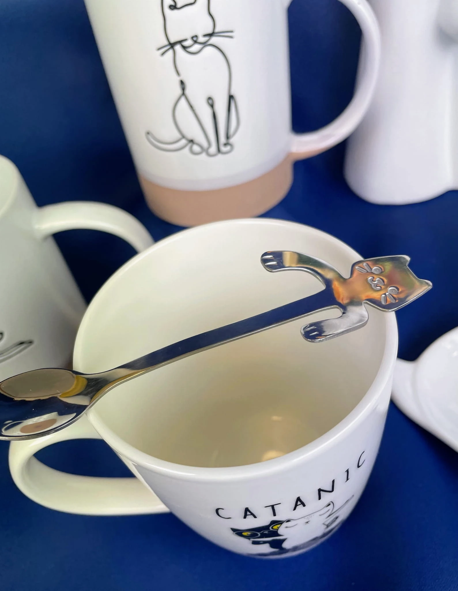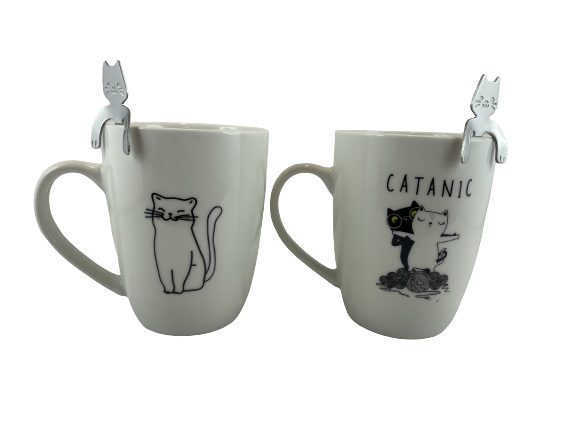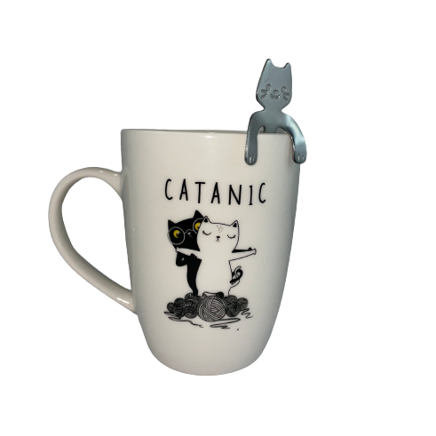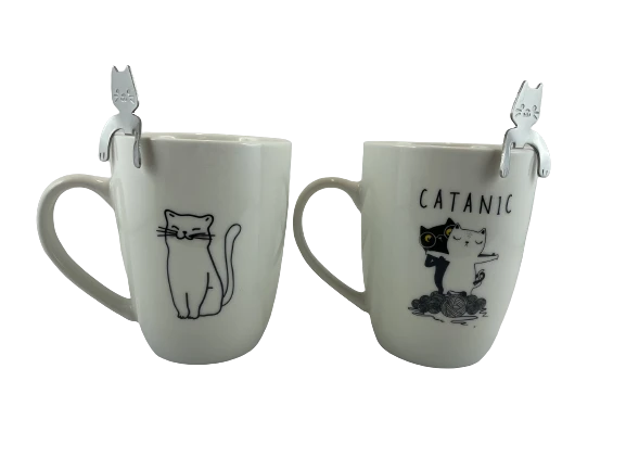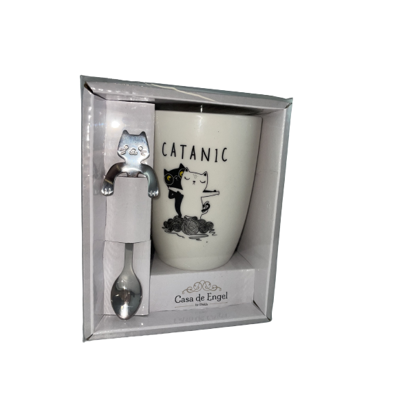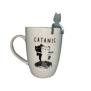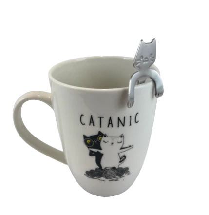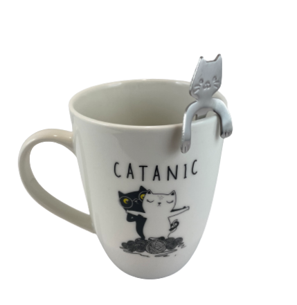 Kubek w komplecie z metalową łyżeczką. Łyżeczka w kształcie kota, zawieszana na kubku. Po obu stronach kubka widnieje rysunek kota. Kubek i łyżeczka spakowane są w ozdobne pudełko.