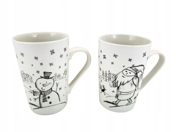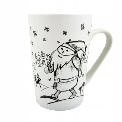 Kubek z uśmiechniętym Mikołajem dziarsko przechadzającym się w padającym śniegu, rysunek wyglądający jak narysowany ołówkiem na pewno uprzyjemni spożywanie ciepłych napojów w zimowe wieczory.