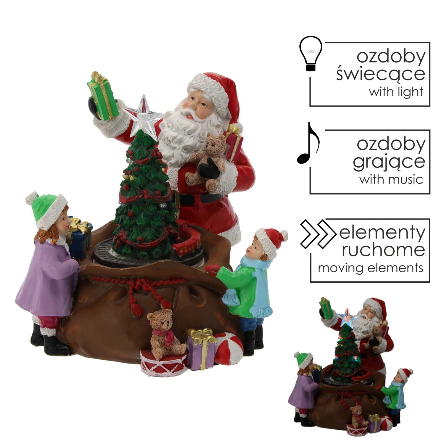 To idealna dekoracja dla całej rodziny – pełna kolorów, dźwięków i świątecznego uroku Dwa tryby działania pozwolą Ci dostosować klimat do każdej chwili – z muzyką lub bez