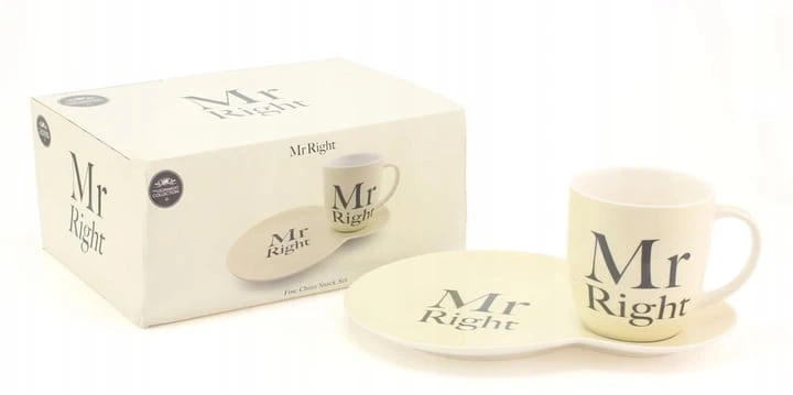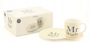 Kubek w zestawie z talerzykiem z napisem Mr Right. Świetnie sprawdzi się jako prezent.