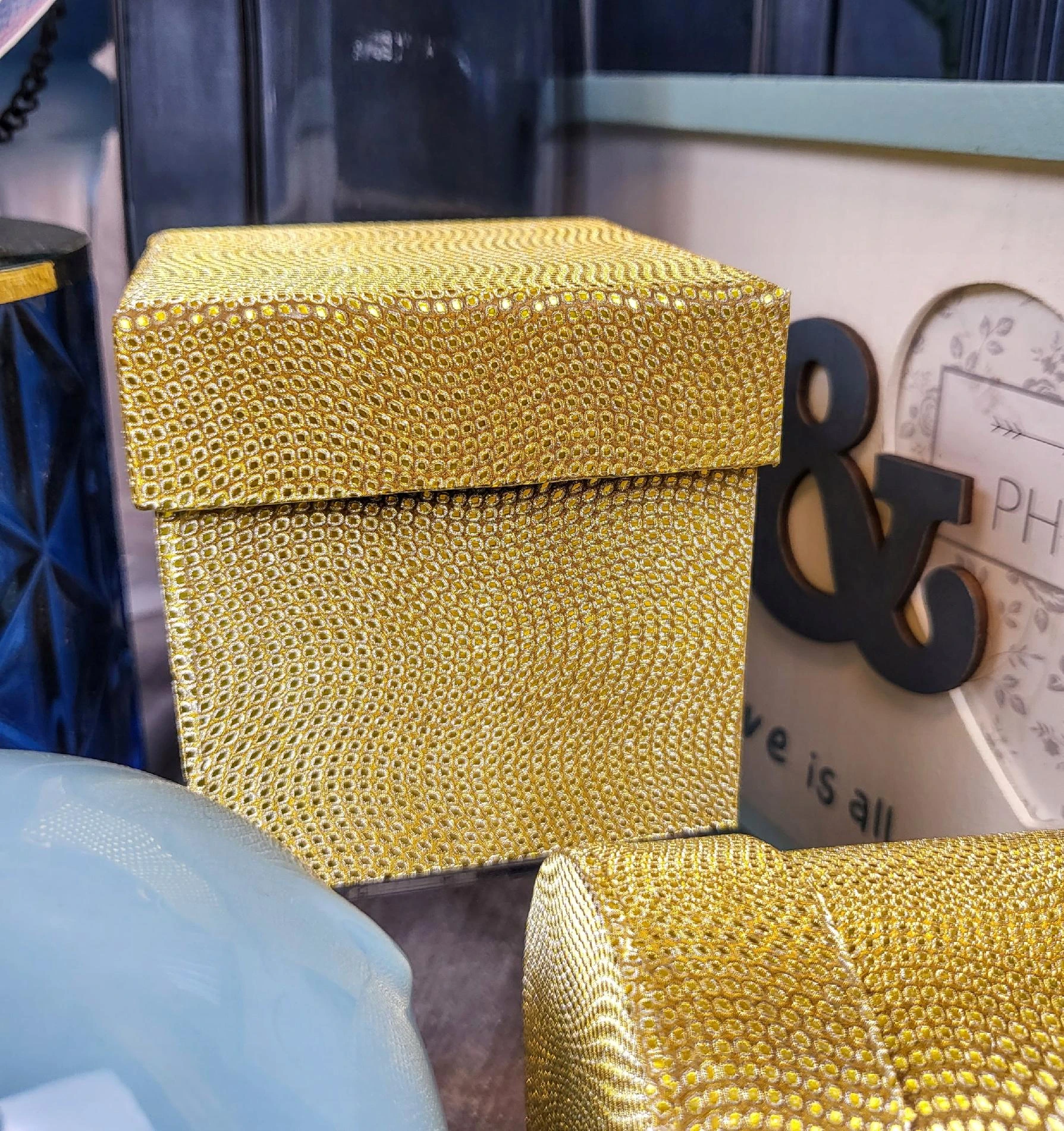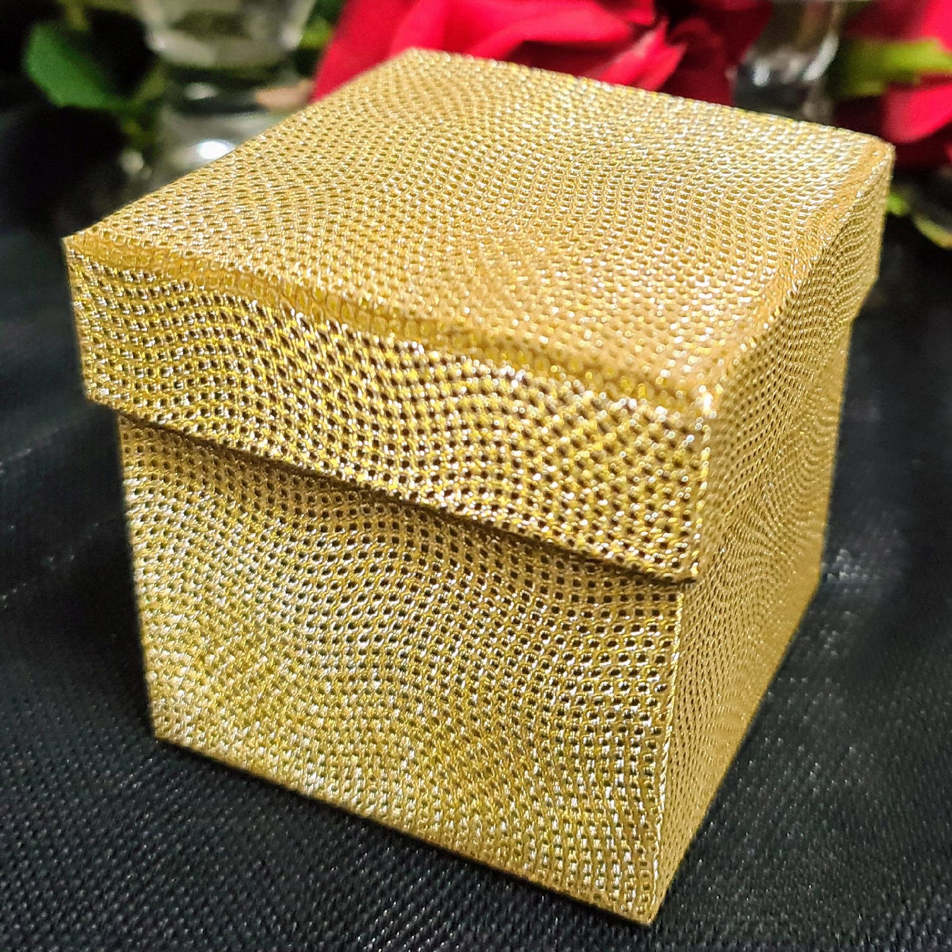 Piękne pudełeczko w złotym kolorze w kształcie prostopadłościanu.