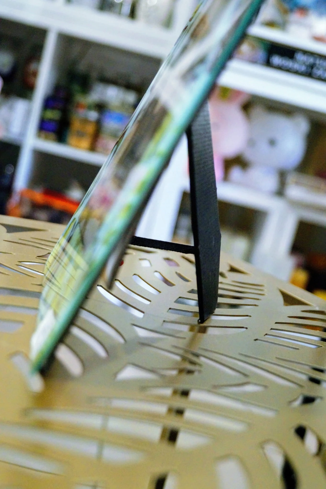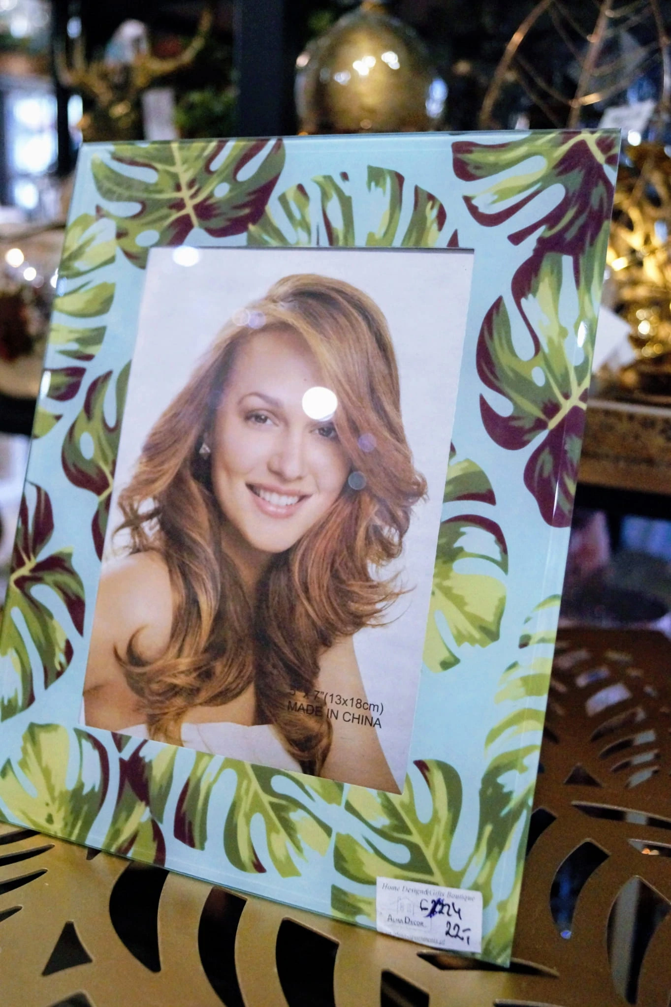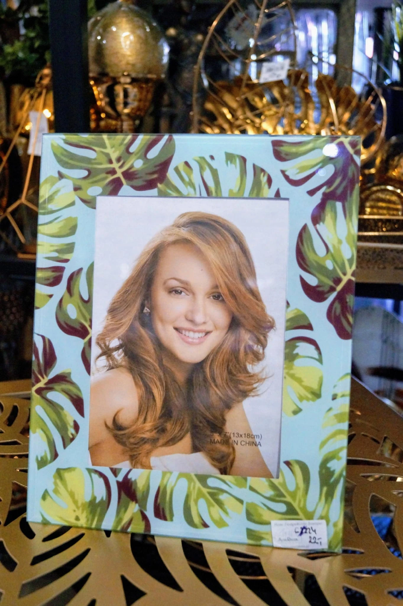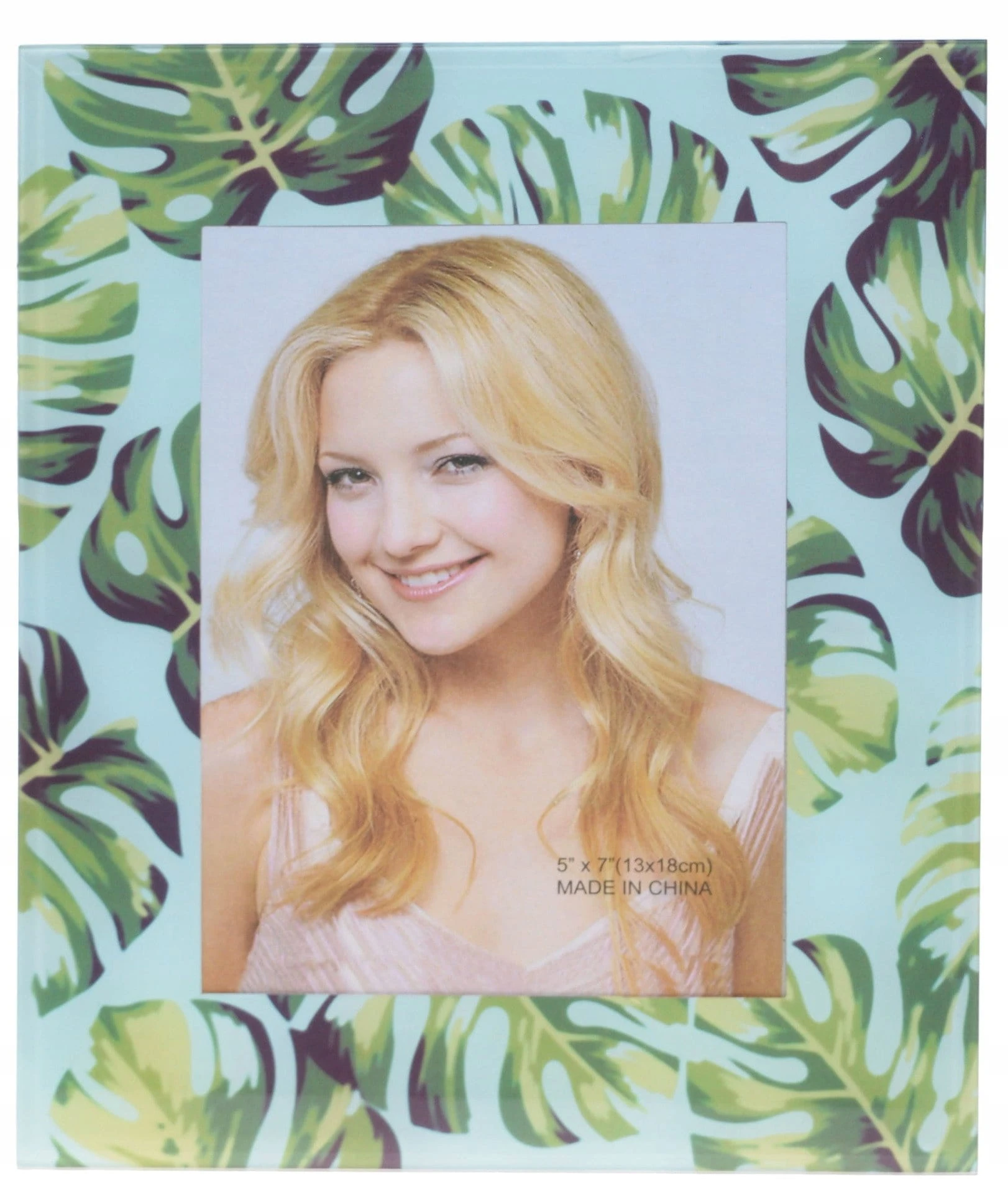 Zielona ramka do zdjęć ze szkła w modny, nowoczesny wzór monstery. Ramkę charakteryzuje wzornictwo przypominające ciepłe tropikalne lasy.