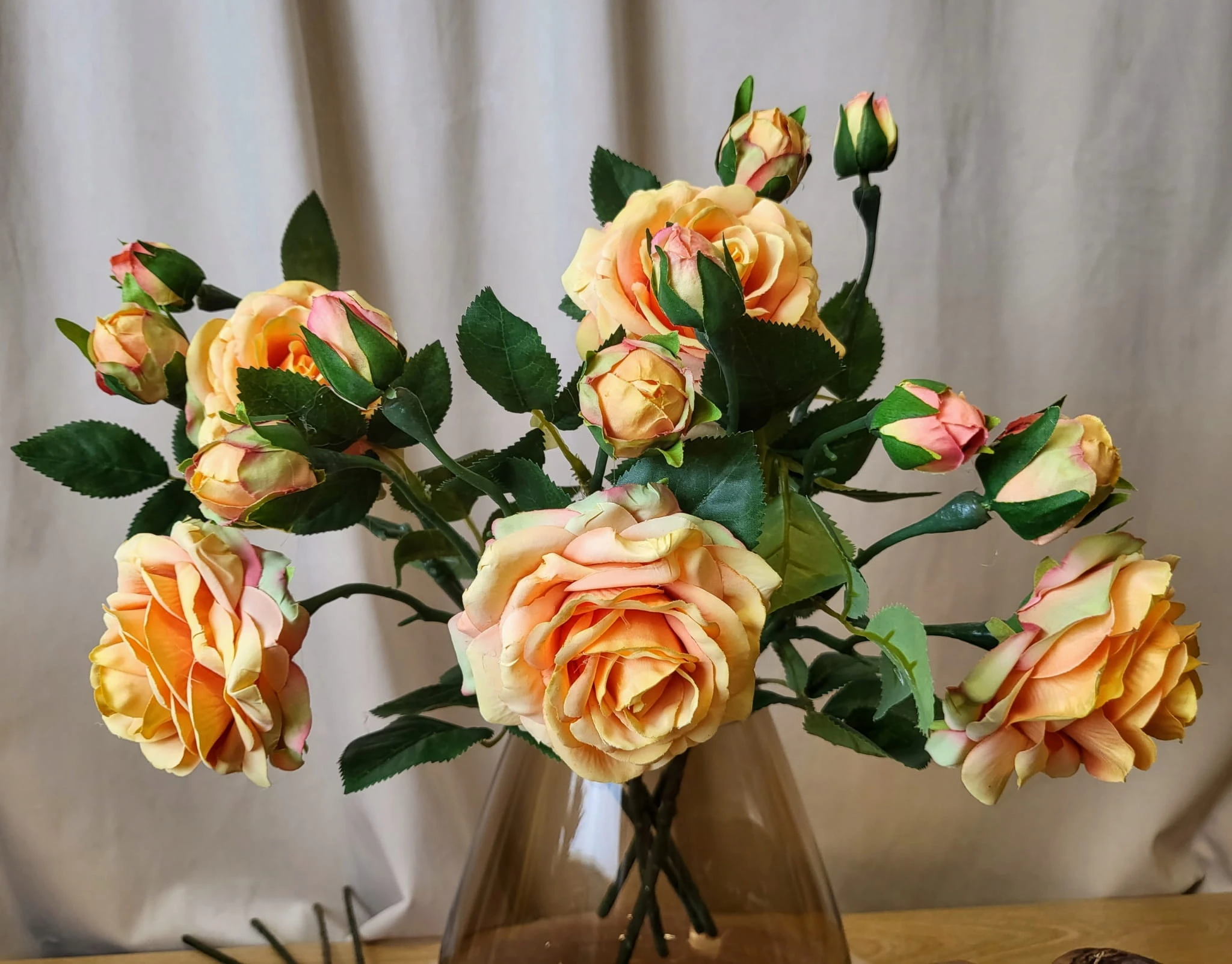 Piękna gałązka różana składająca się z herbacianego kwiatka oraz pąków, która zachwyca swoim wyglądem i upiększa pomieszczenie w którym się znajduje.