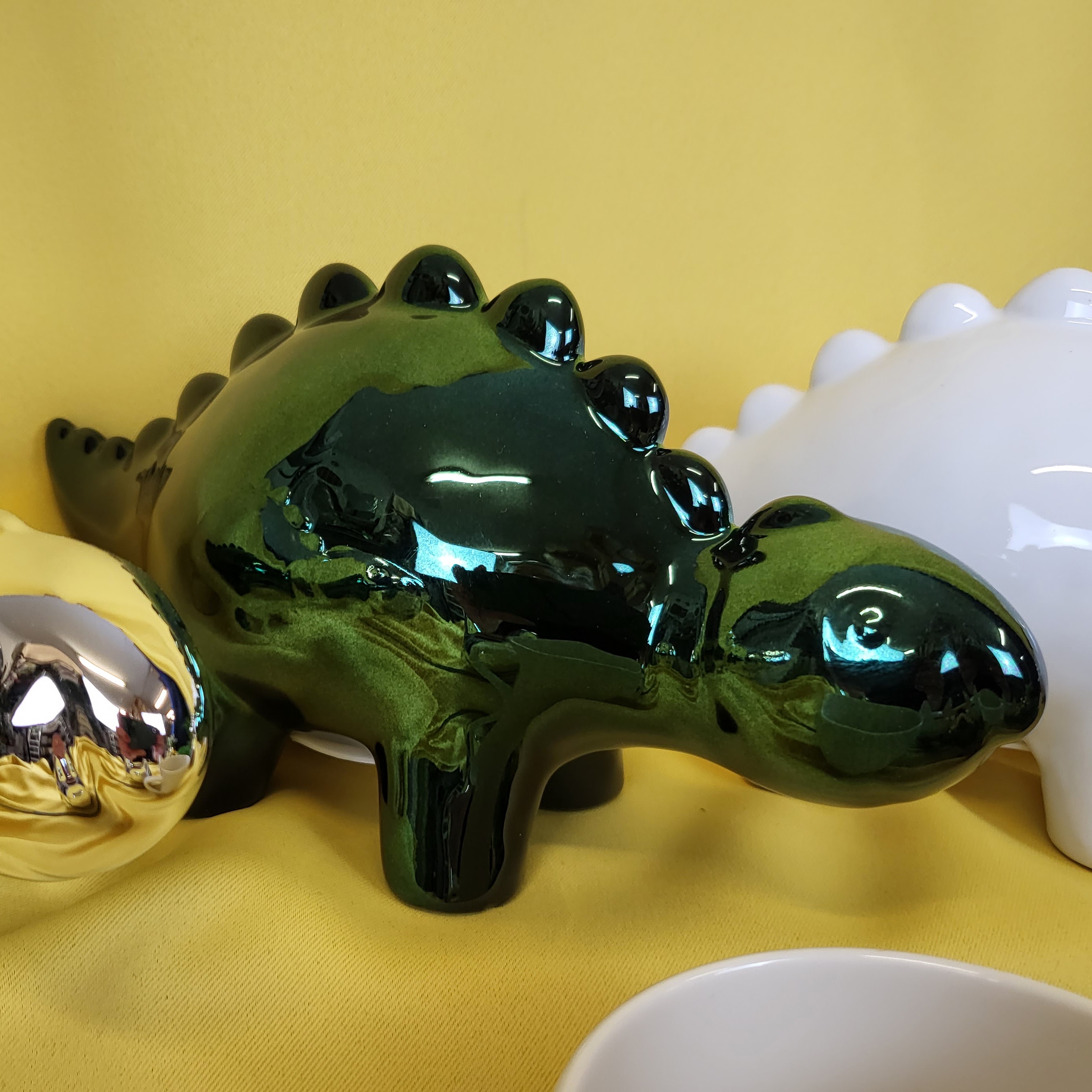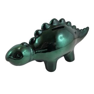Ceramiczna, zielona skarbonka w kształcie dinozaura.