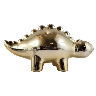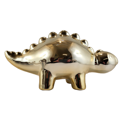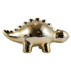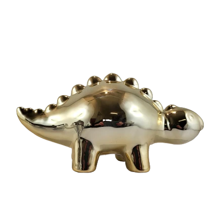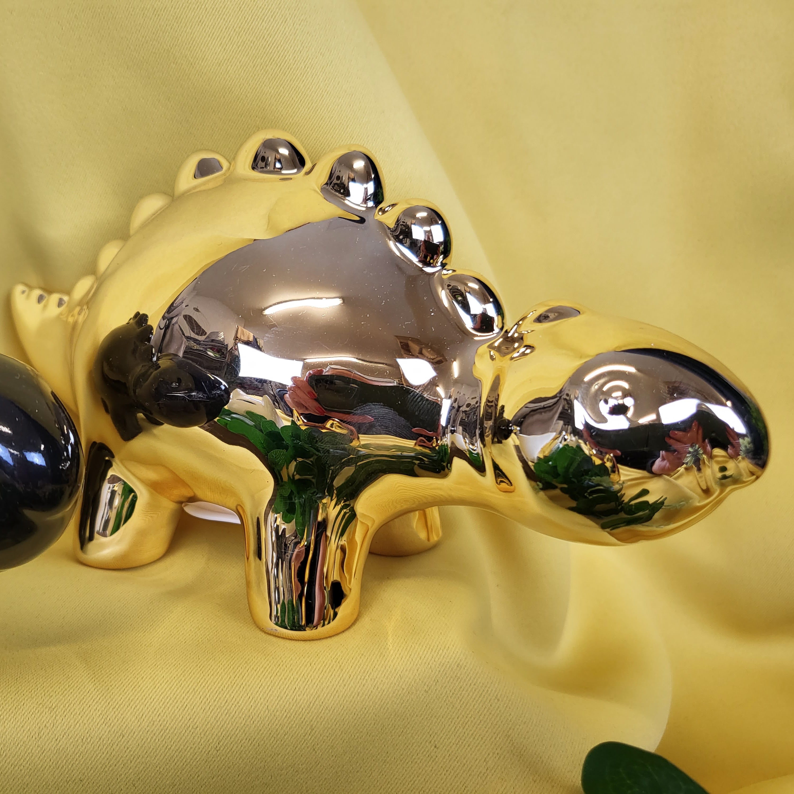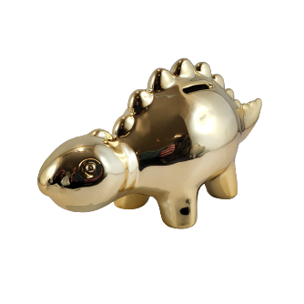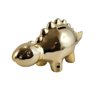 Ceramiczna, złota skarbonka w kształcie dinozaura.