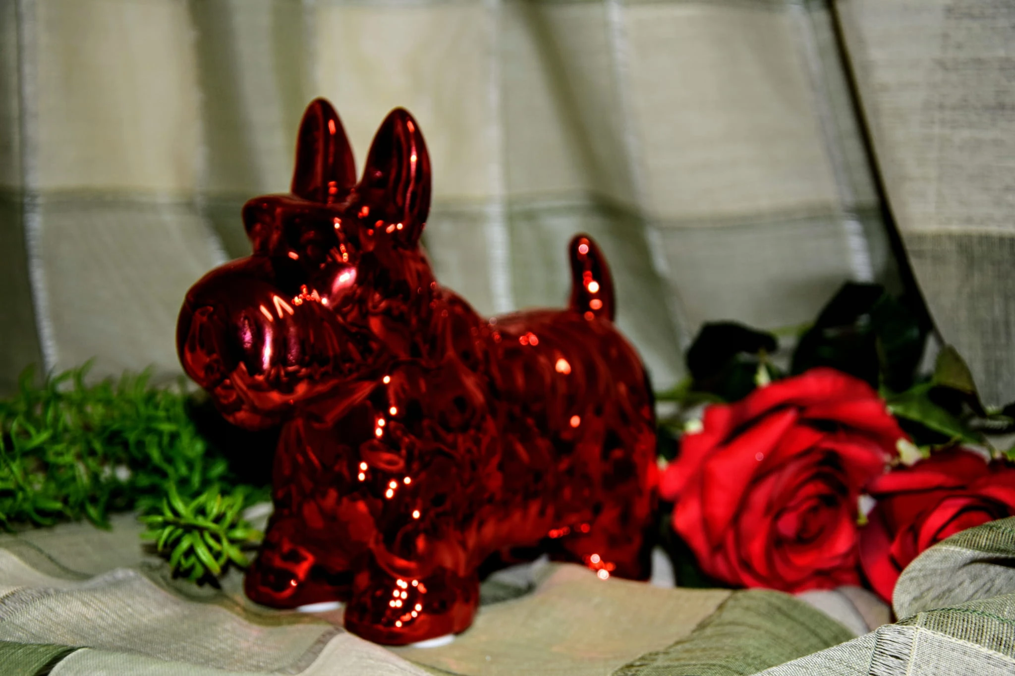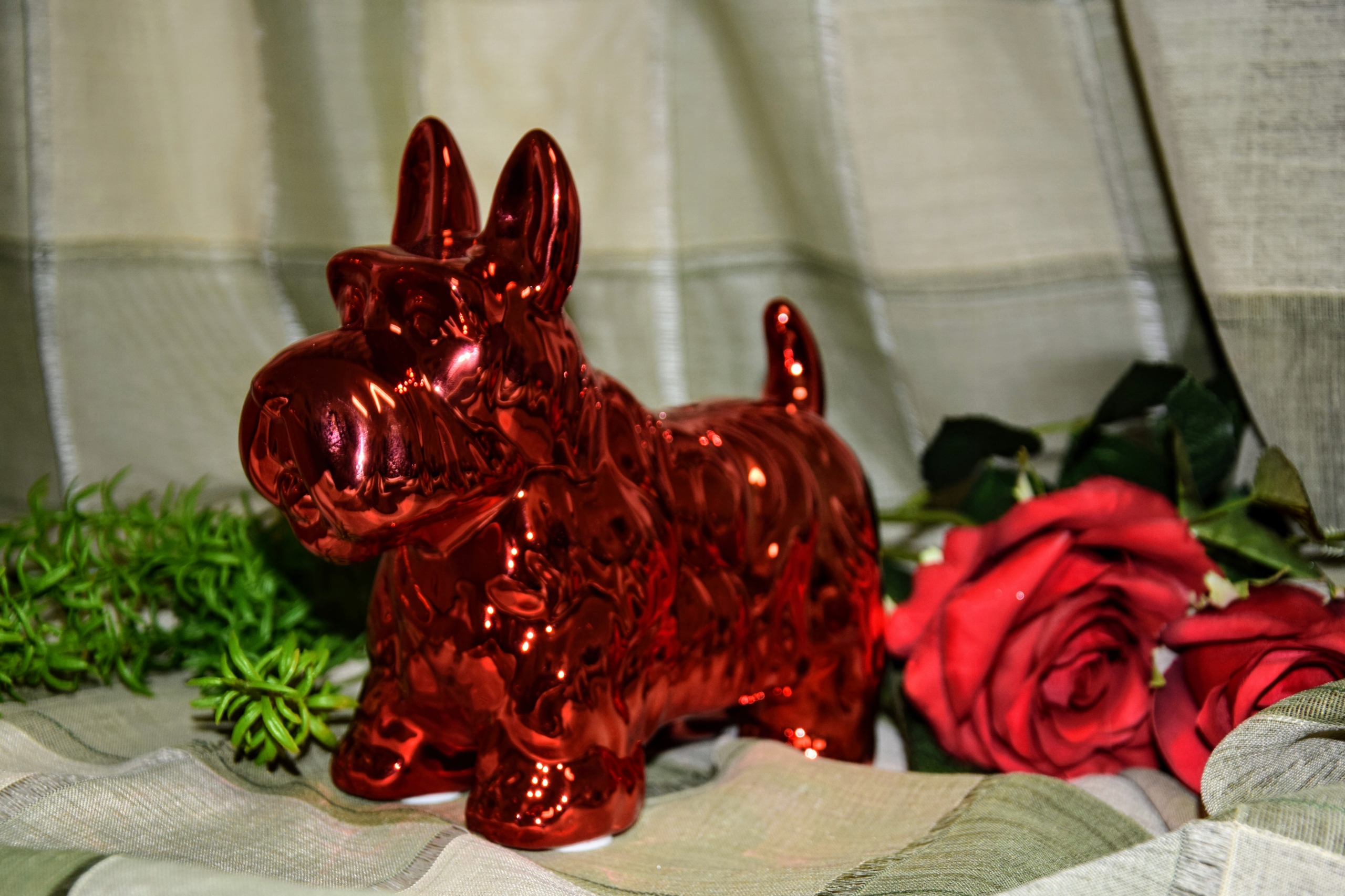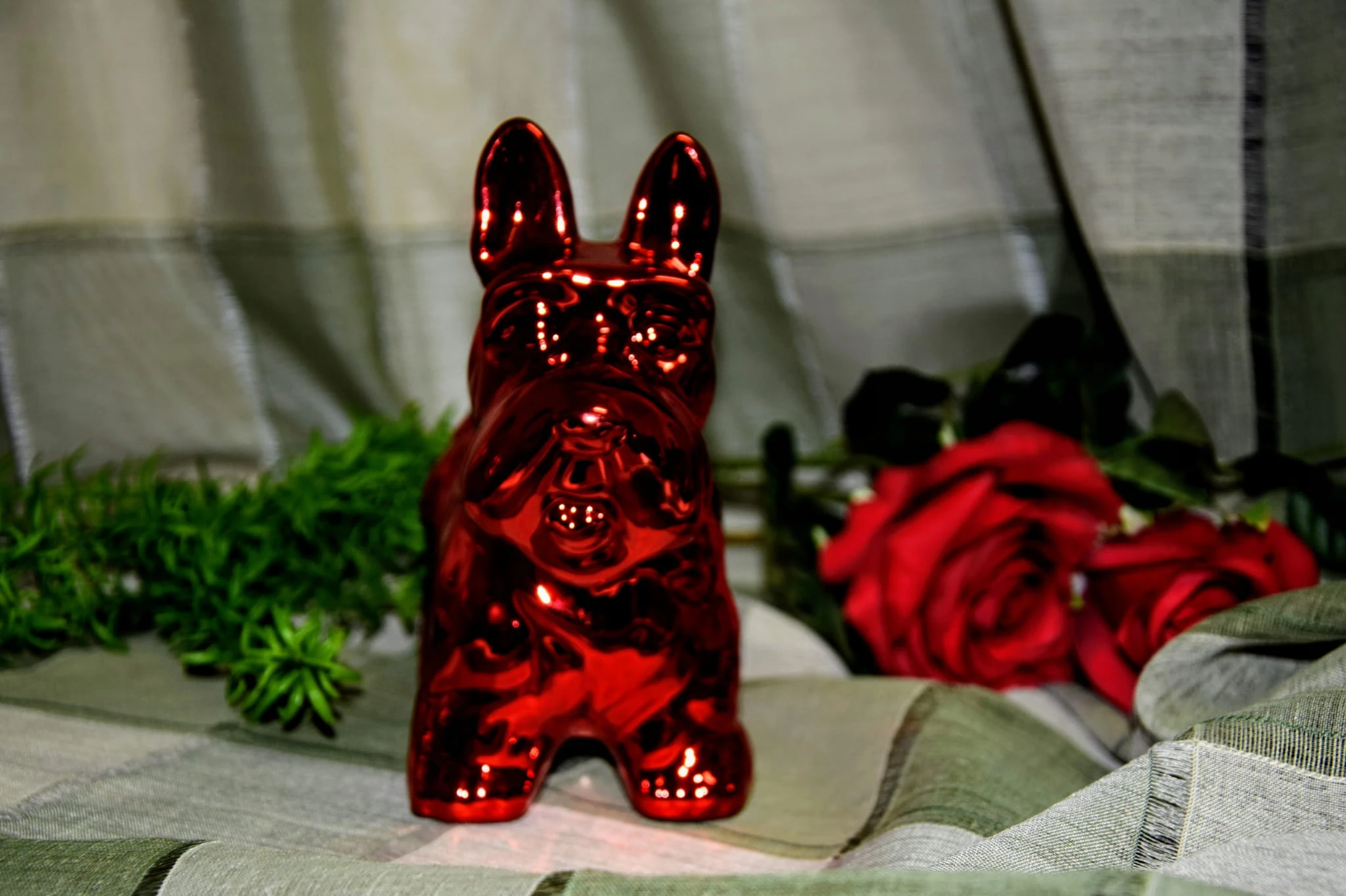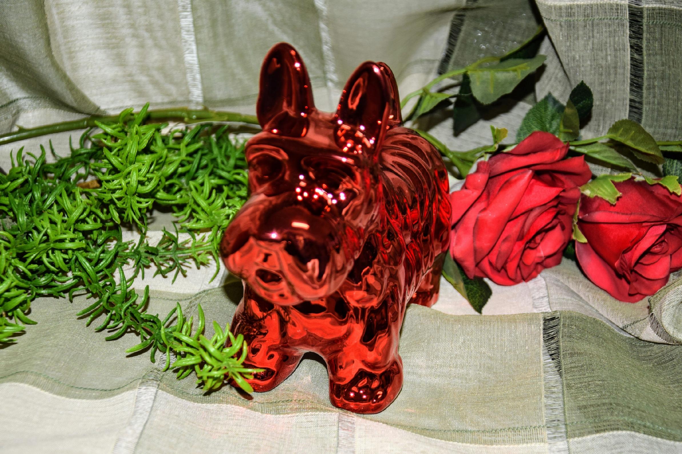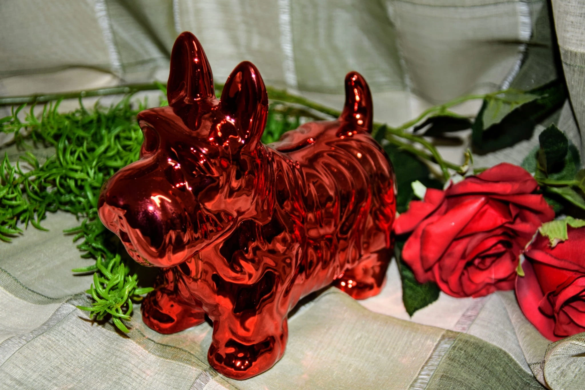 Skarbonka w kształcie psa w czerwonym kolorze.
