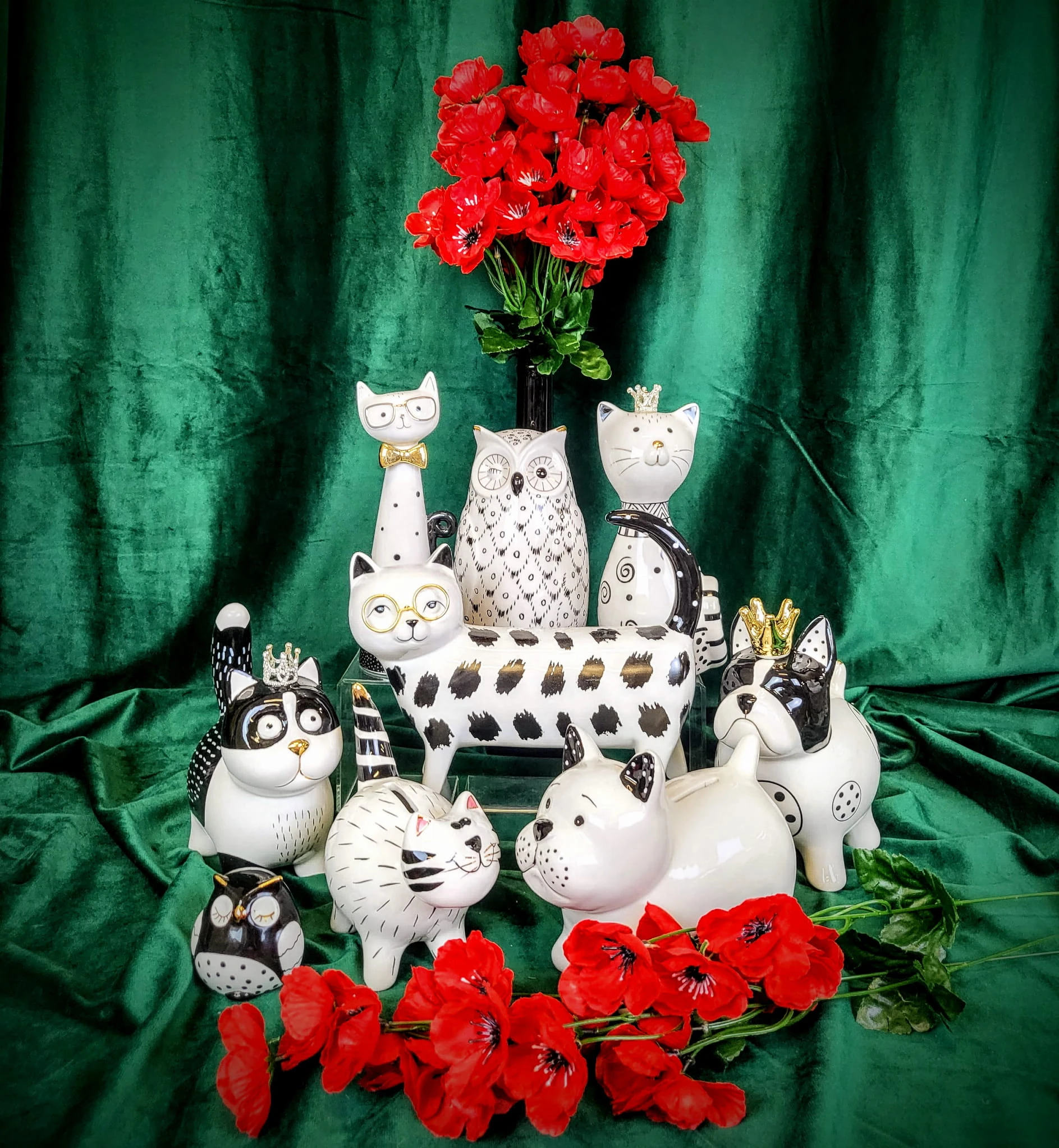 Ceramiczna, czarno-biała skarbonka w kształcie kota ze złotym noskiem.