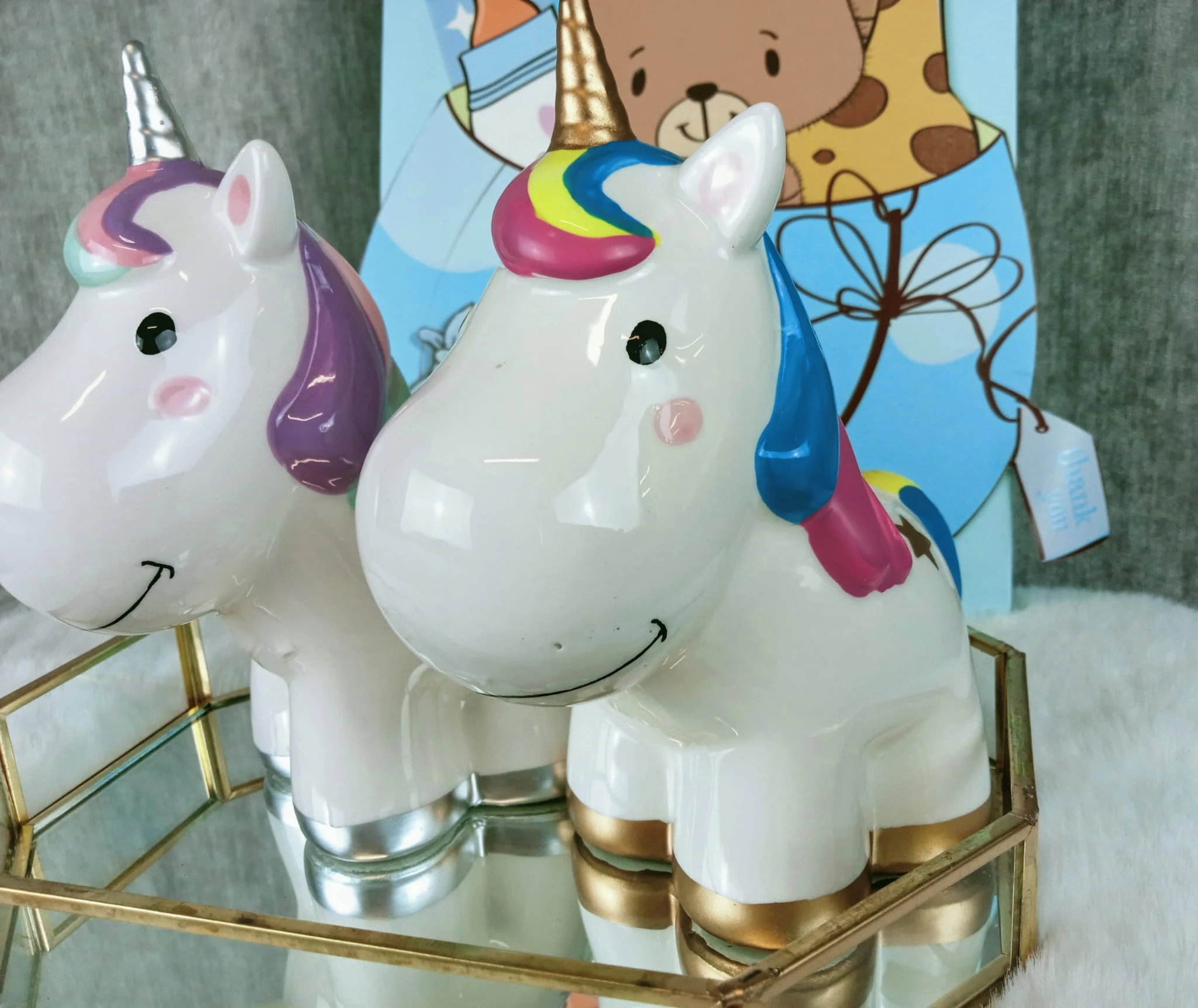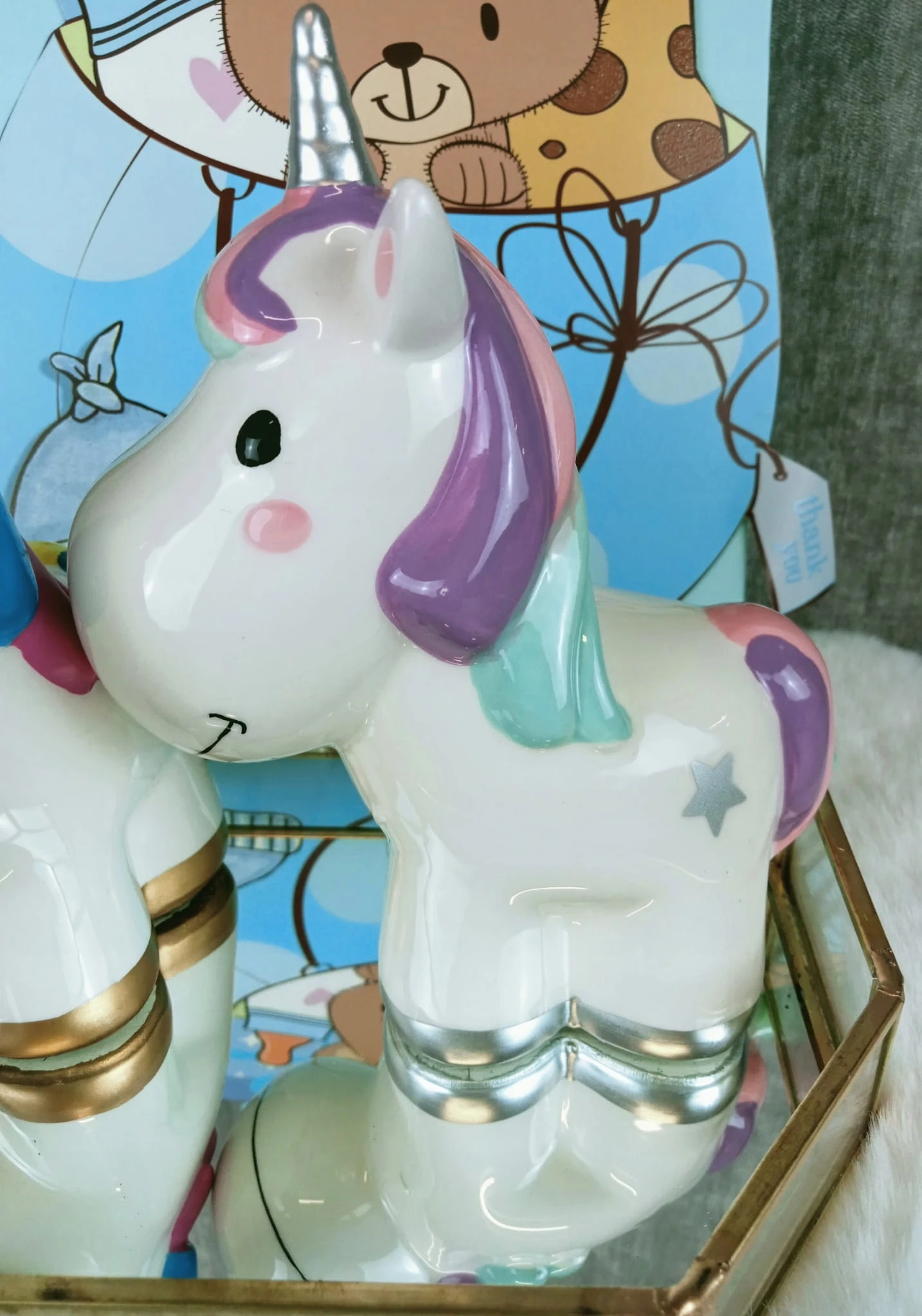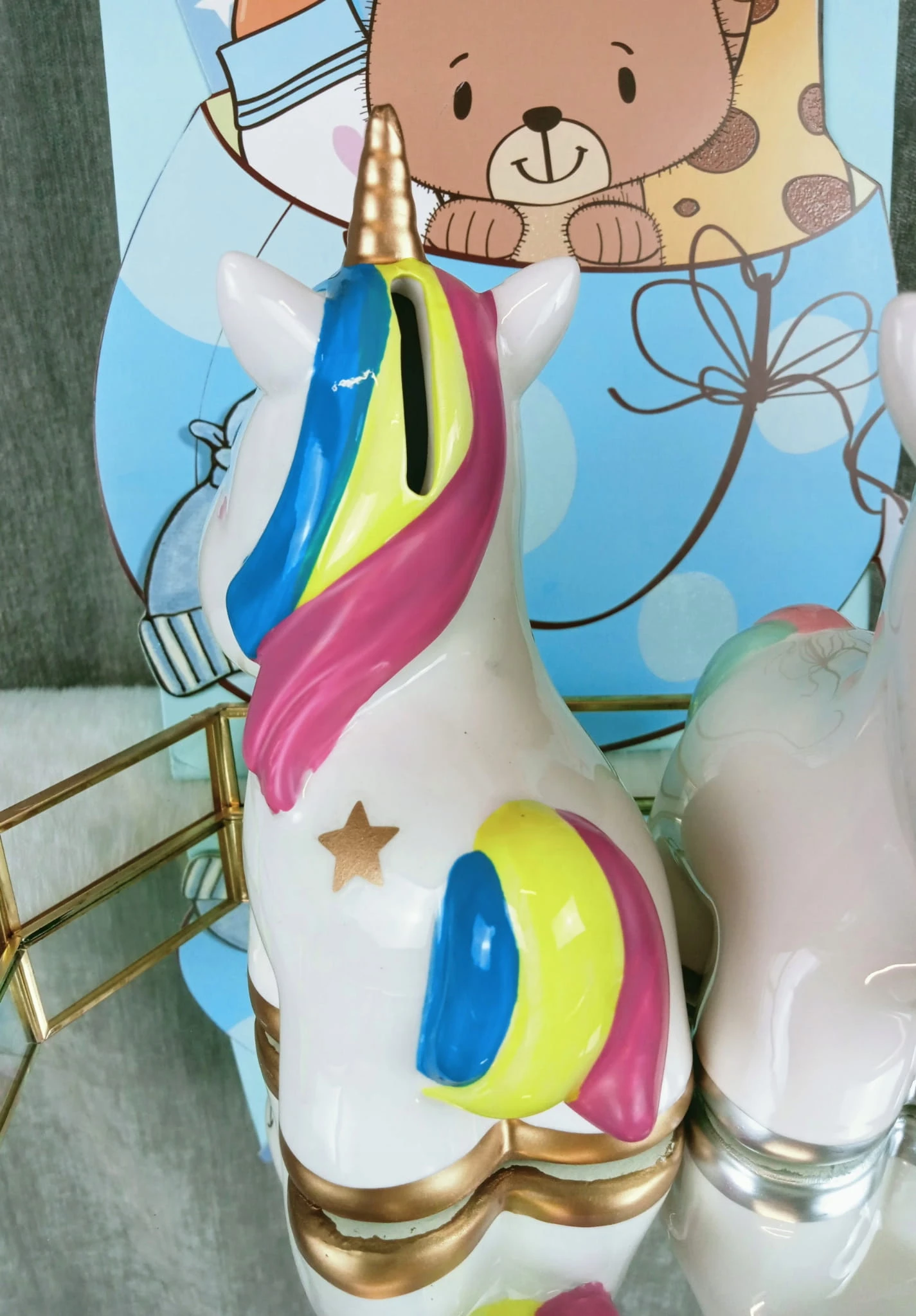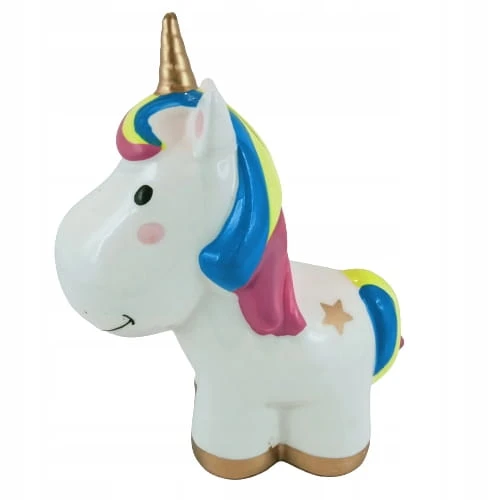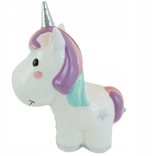 Zabawna skarbonka w kształcie jednorożca z tęczową grzywą.