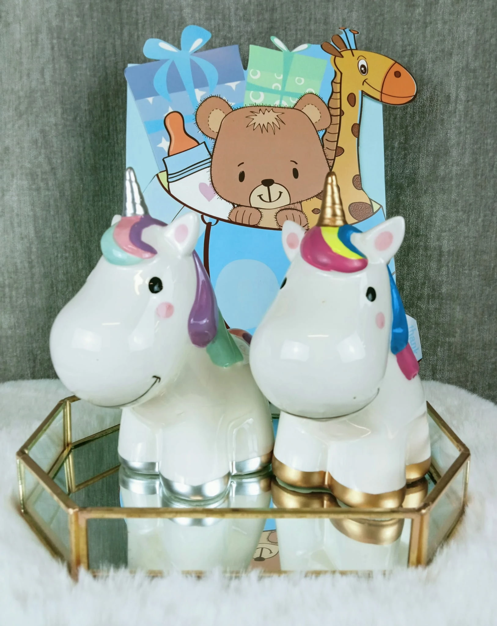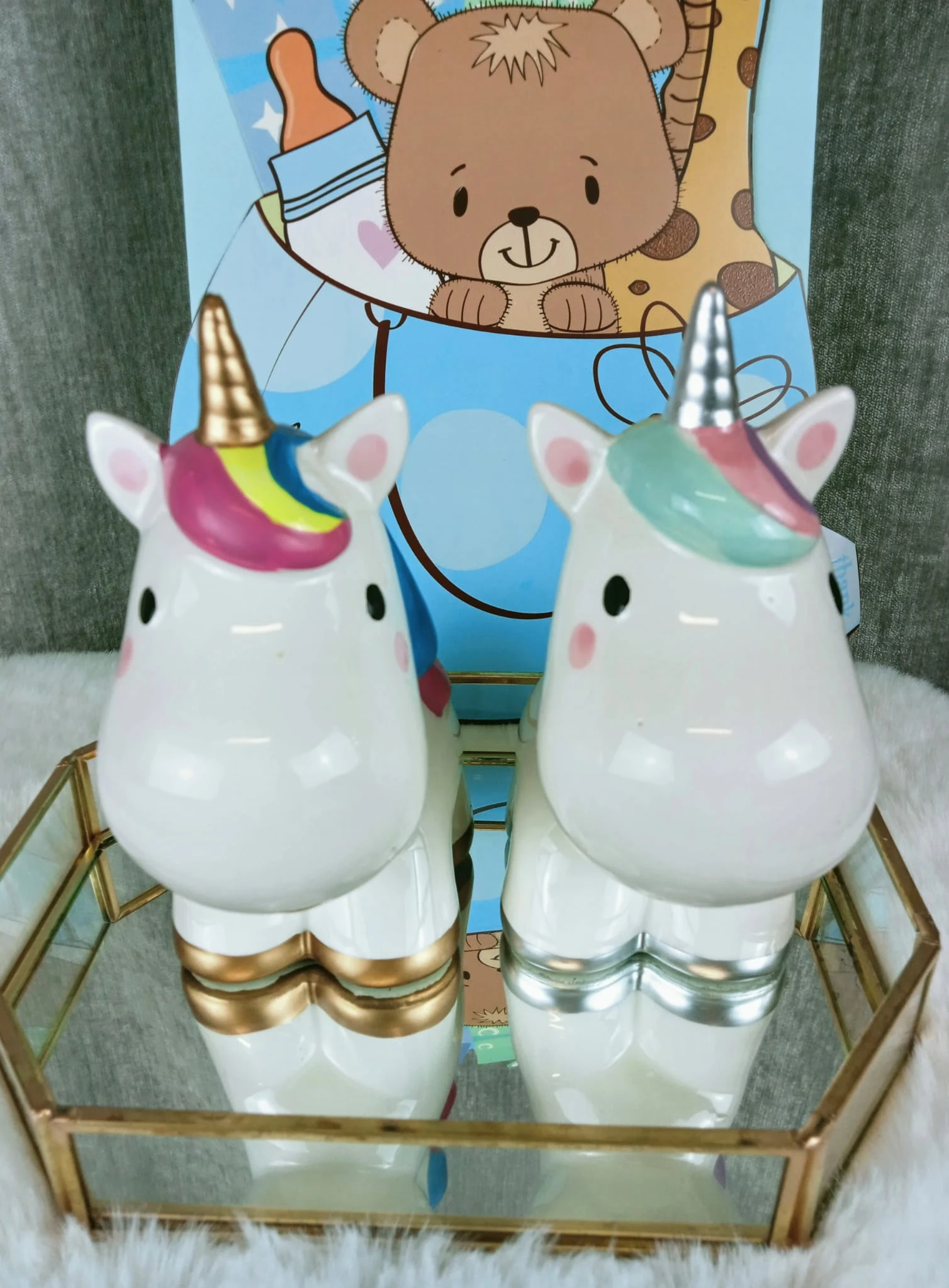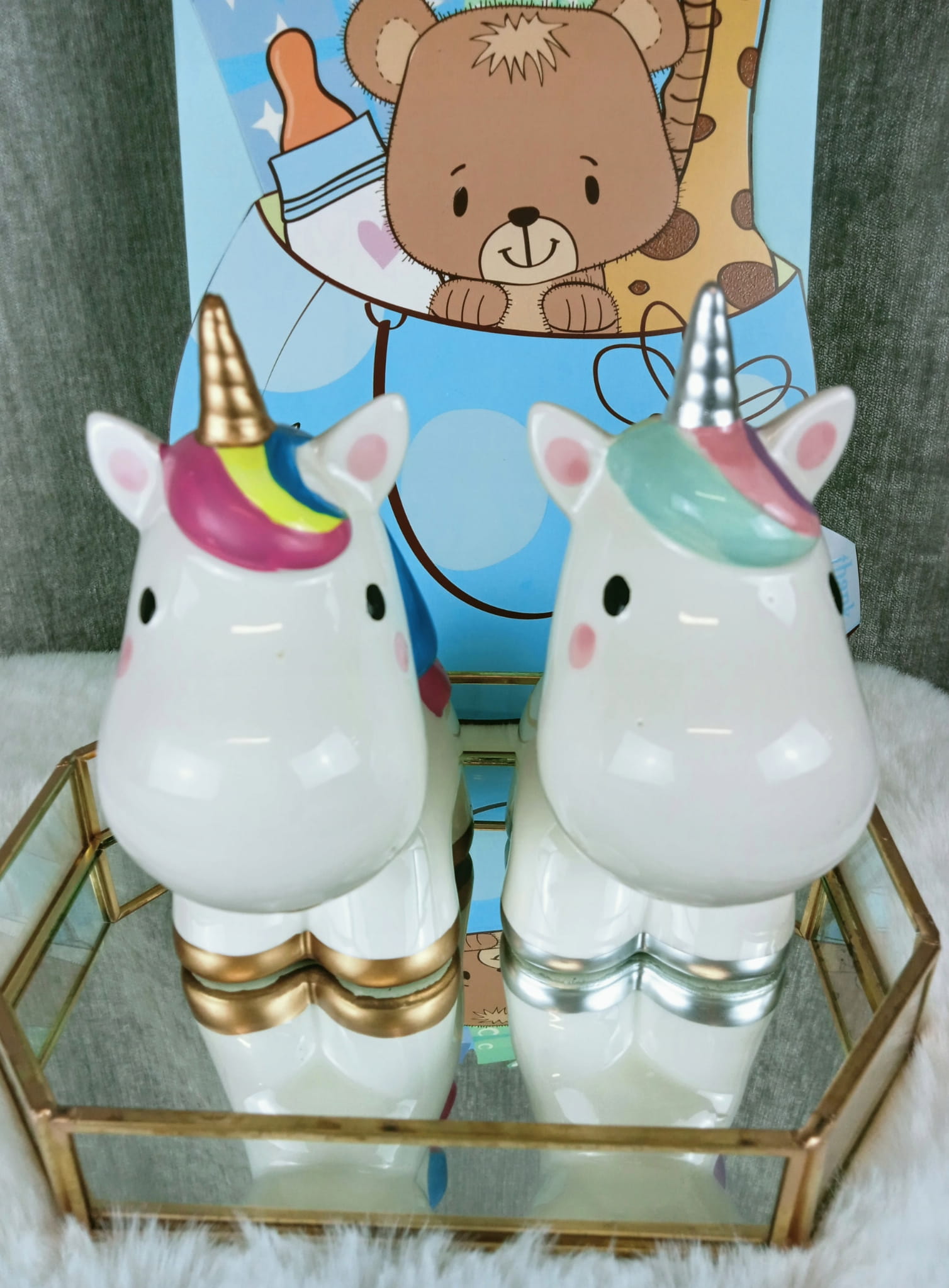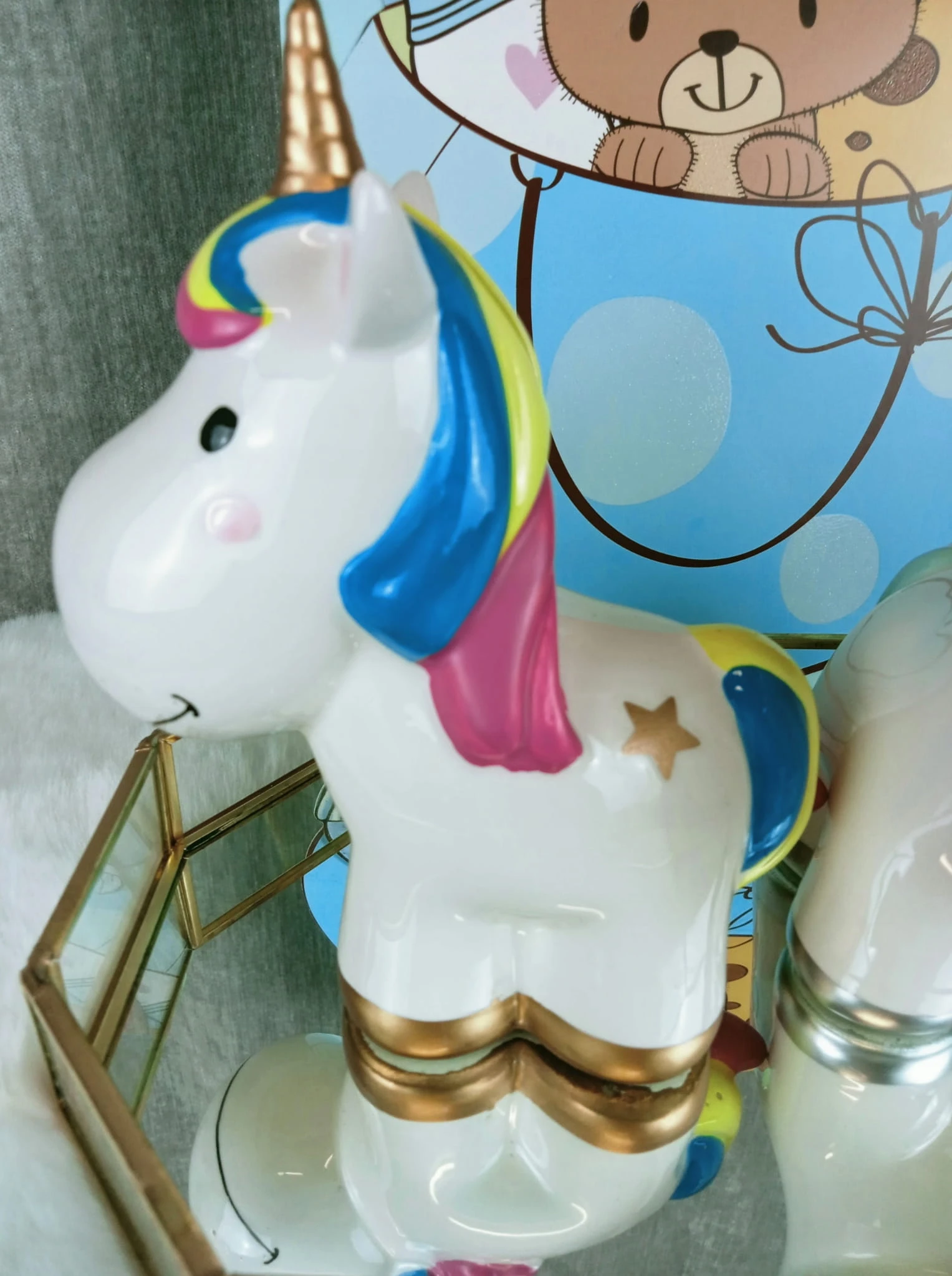 Zabawna skarbonka w kształcie jednorożca z tęczową grzywą.