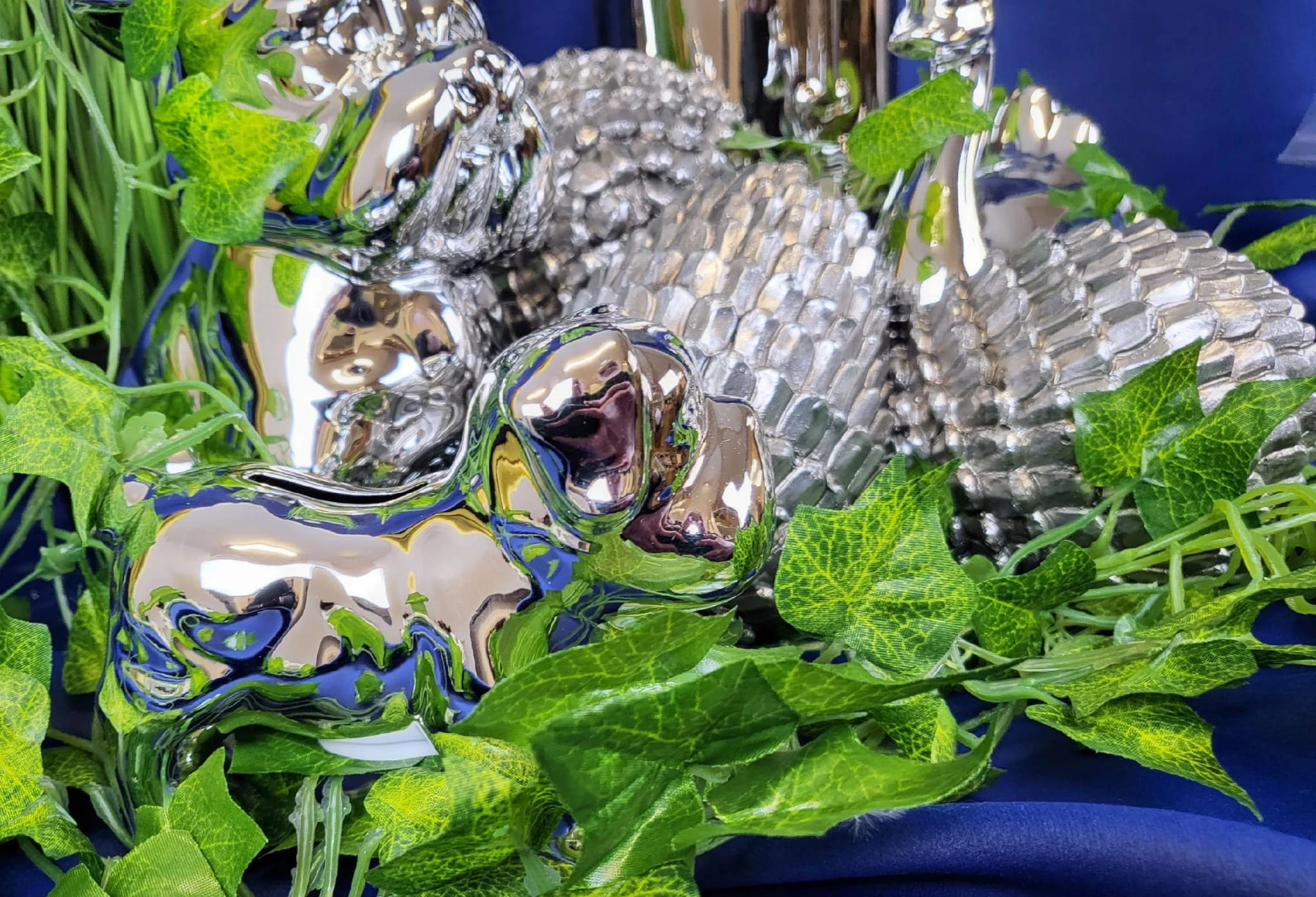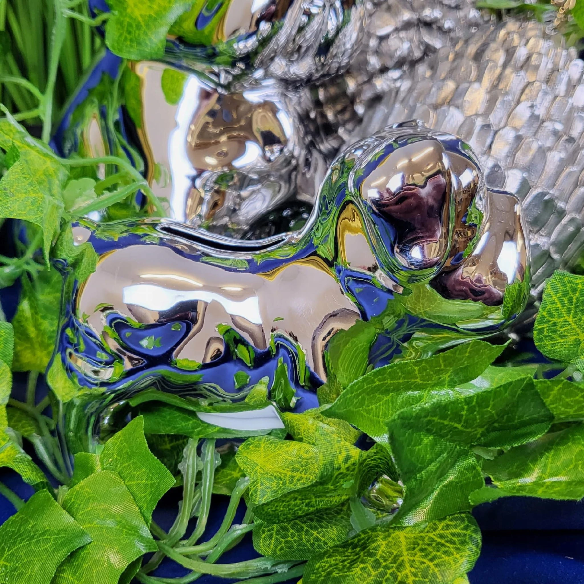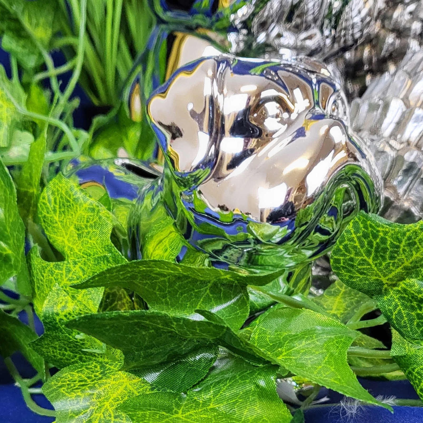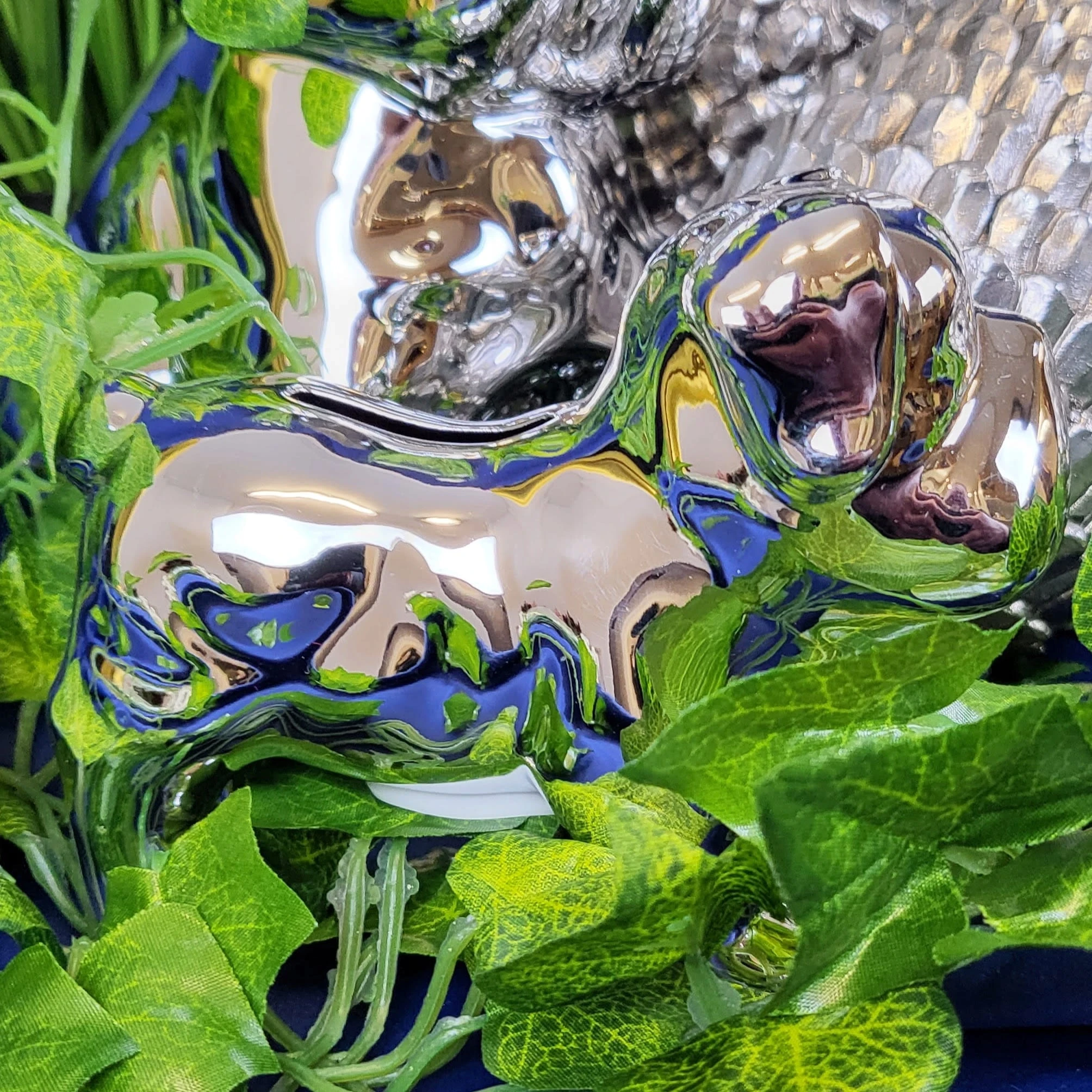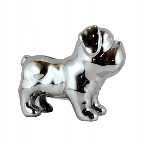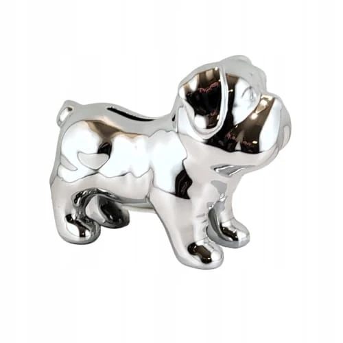 Piękna ceramiczna srebrna skarbonka mops na wysoki połysk. Skarbonka posiada silikonowy dekielek, dzięki czemu nie ma konieczności jej rozbijania, aby dostać się do zawartości.