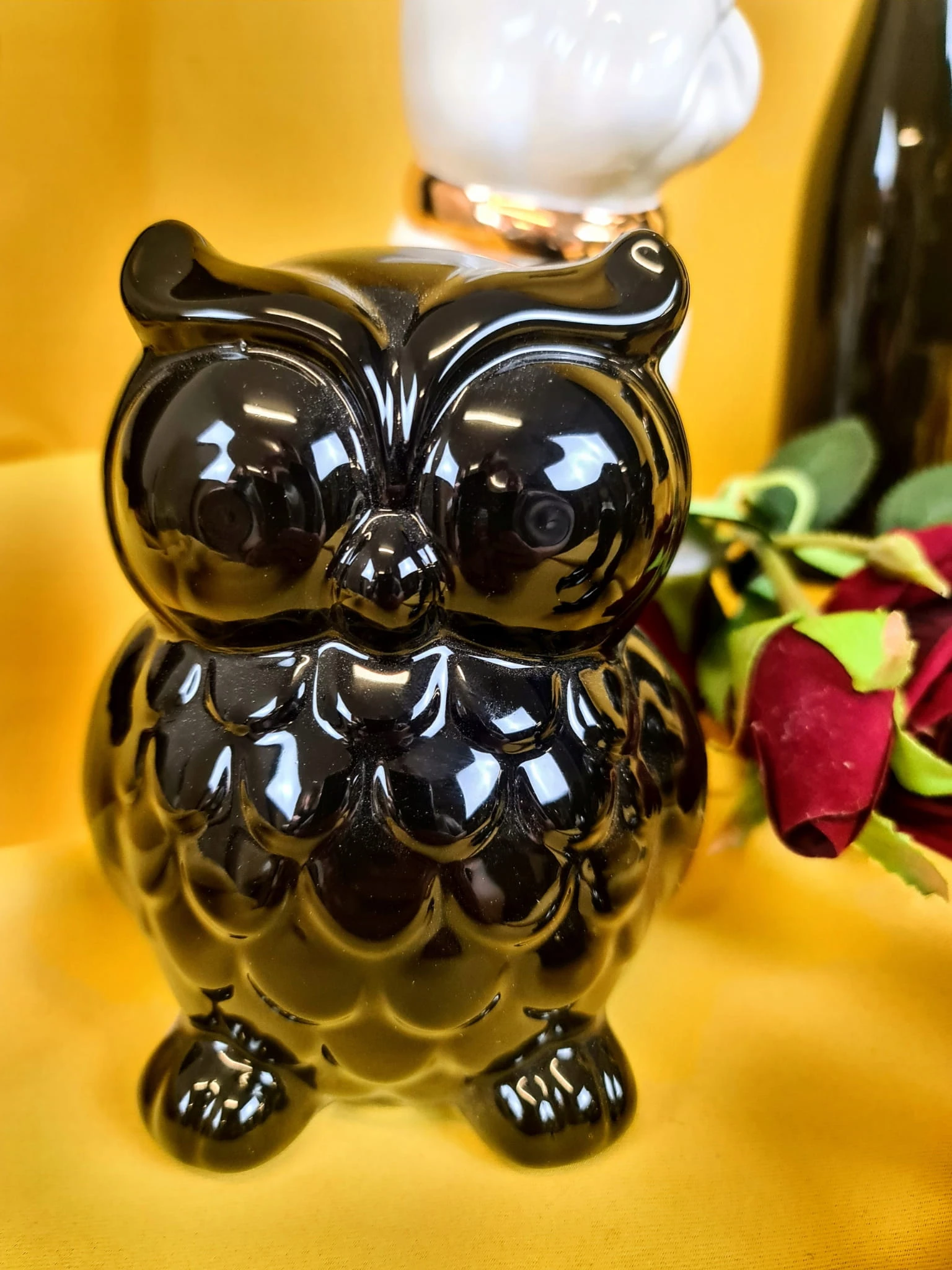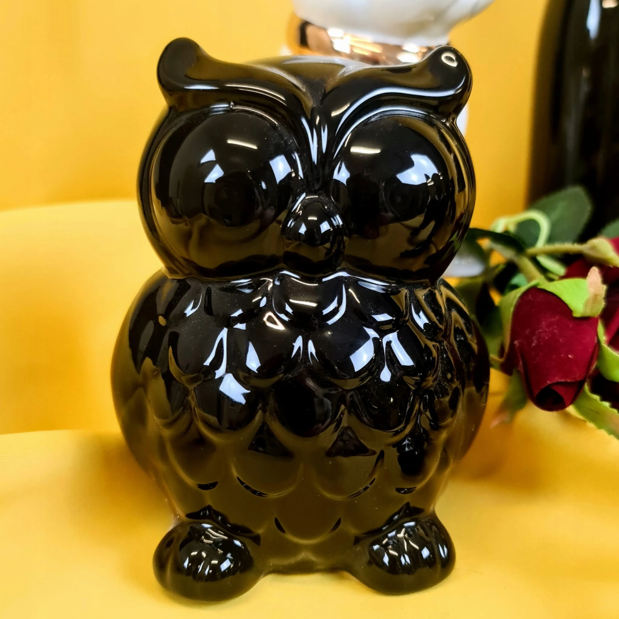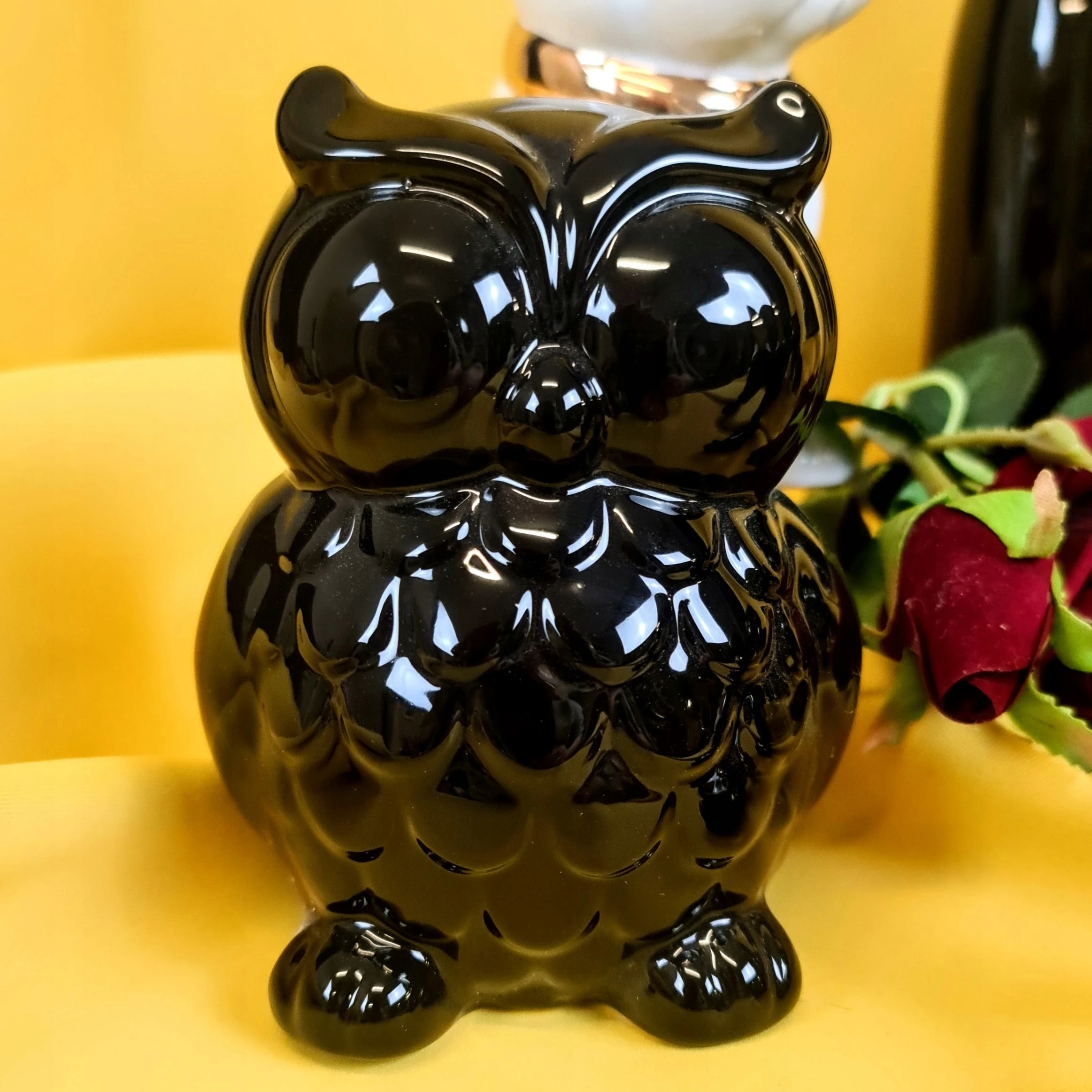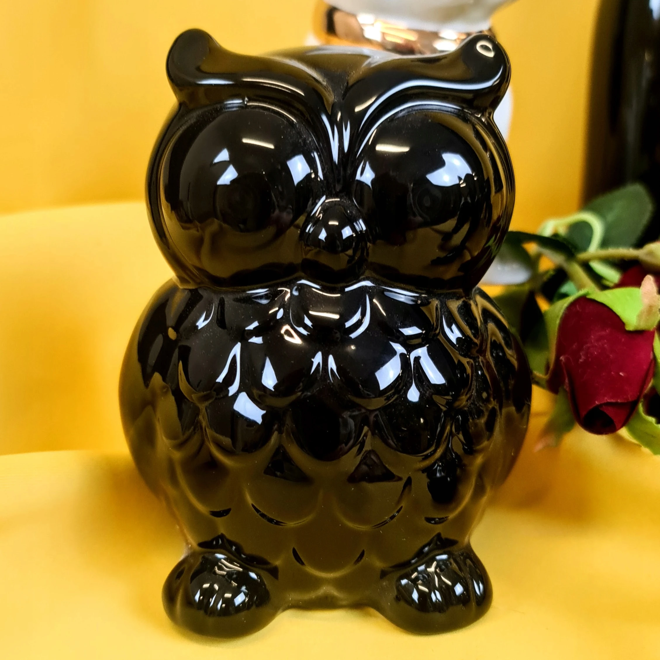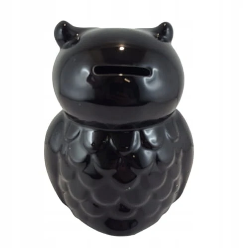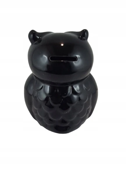 Piękna ceramiczna czarna skarbonka sowa na wysoki połysk. Skarbonka posiada silikonowy dekielek, dzięki czemu nie ma konieczności jej rozbijania, aby dostać się do zawartości.