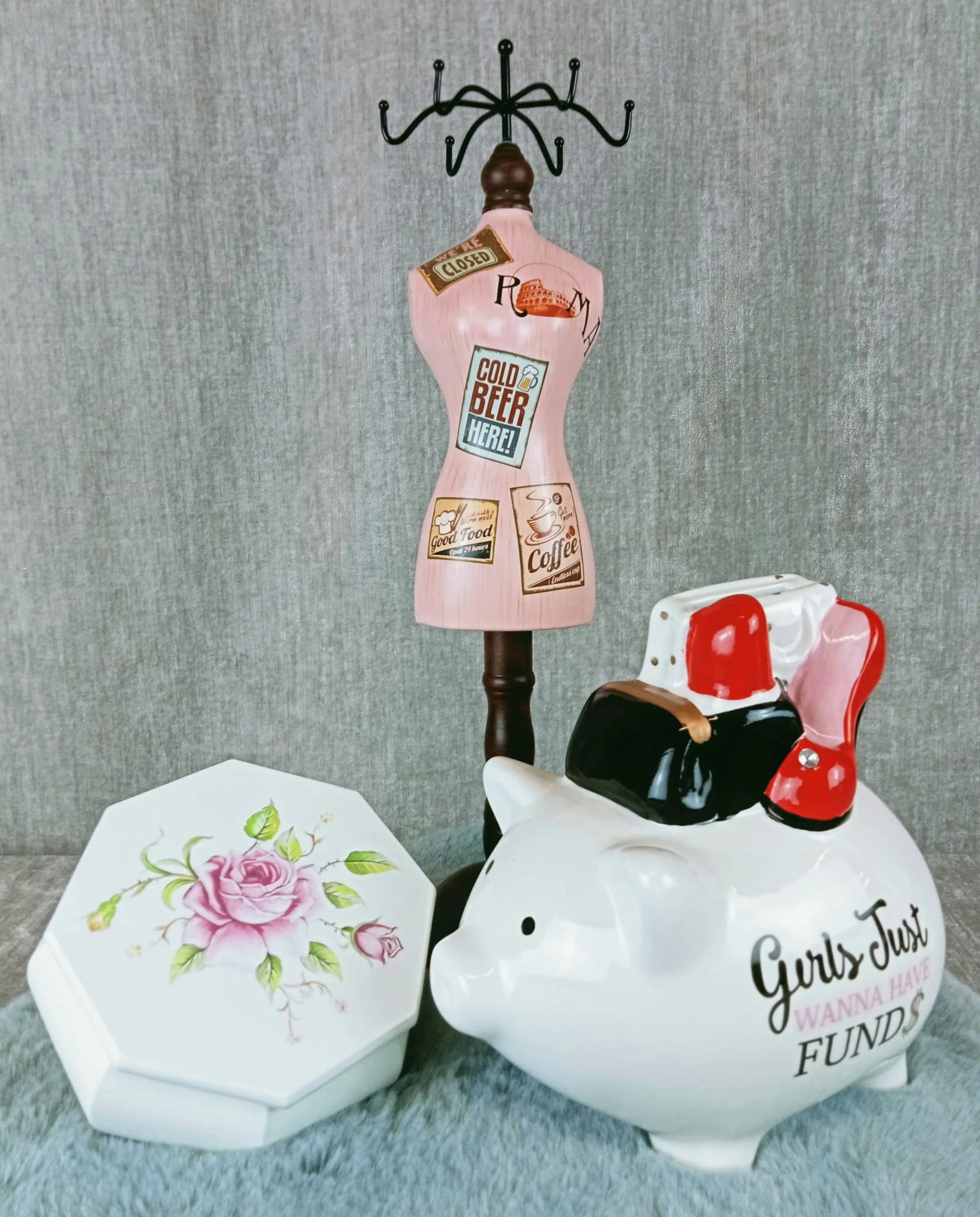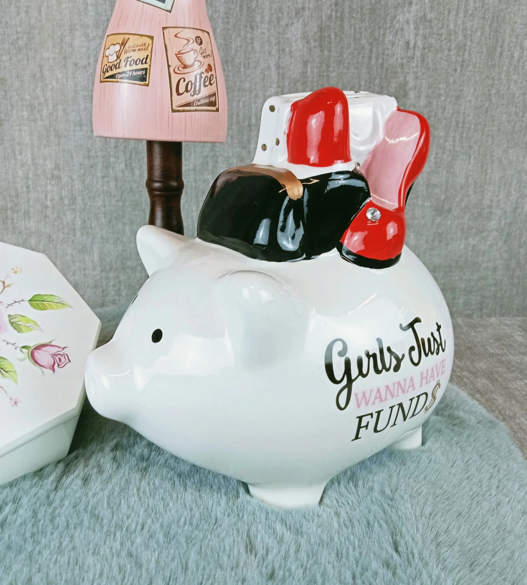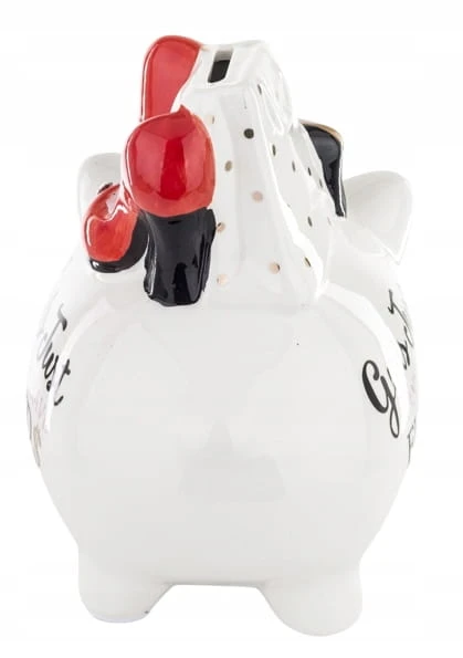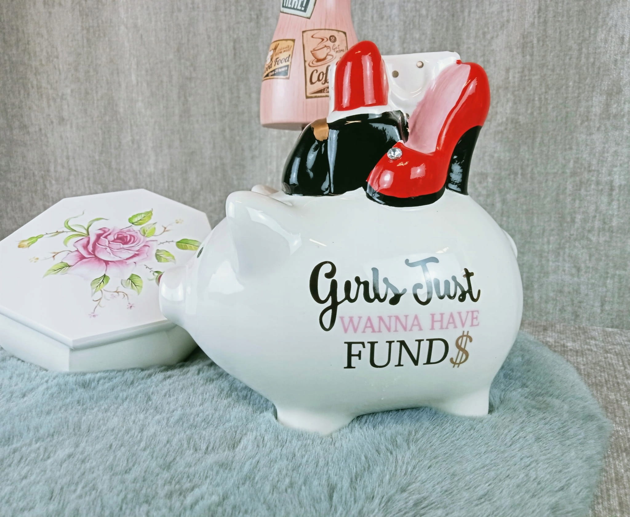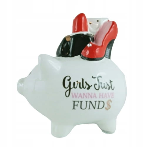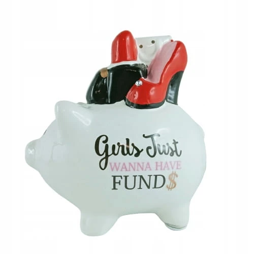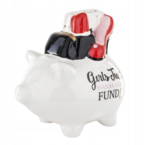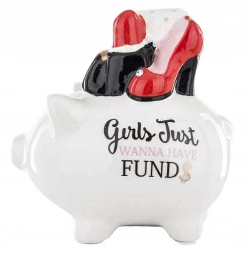 Skarbonka biała, ceramiczna, posiada silikonowy dekielek, dzięki czemu nie ma konieczności jej rozbijania. Na plecach świnka dzielnie niesie kobiece drobiazgi, a na brzuchu ma napis "GIRLS JUST WANNA HAVE FUNDS".