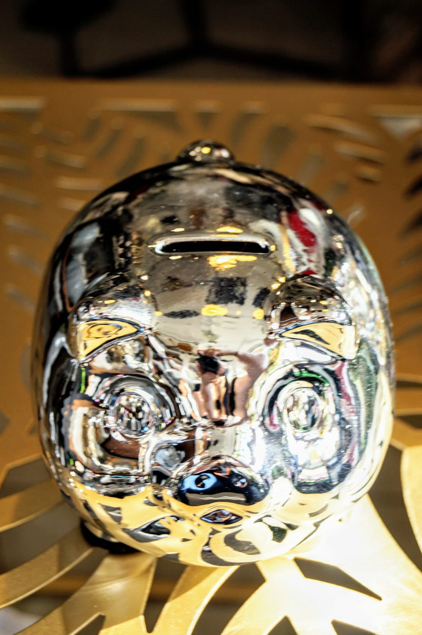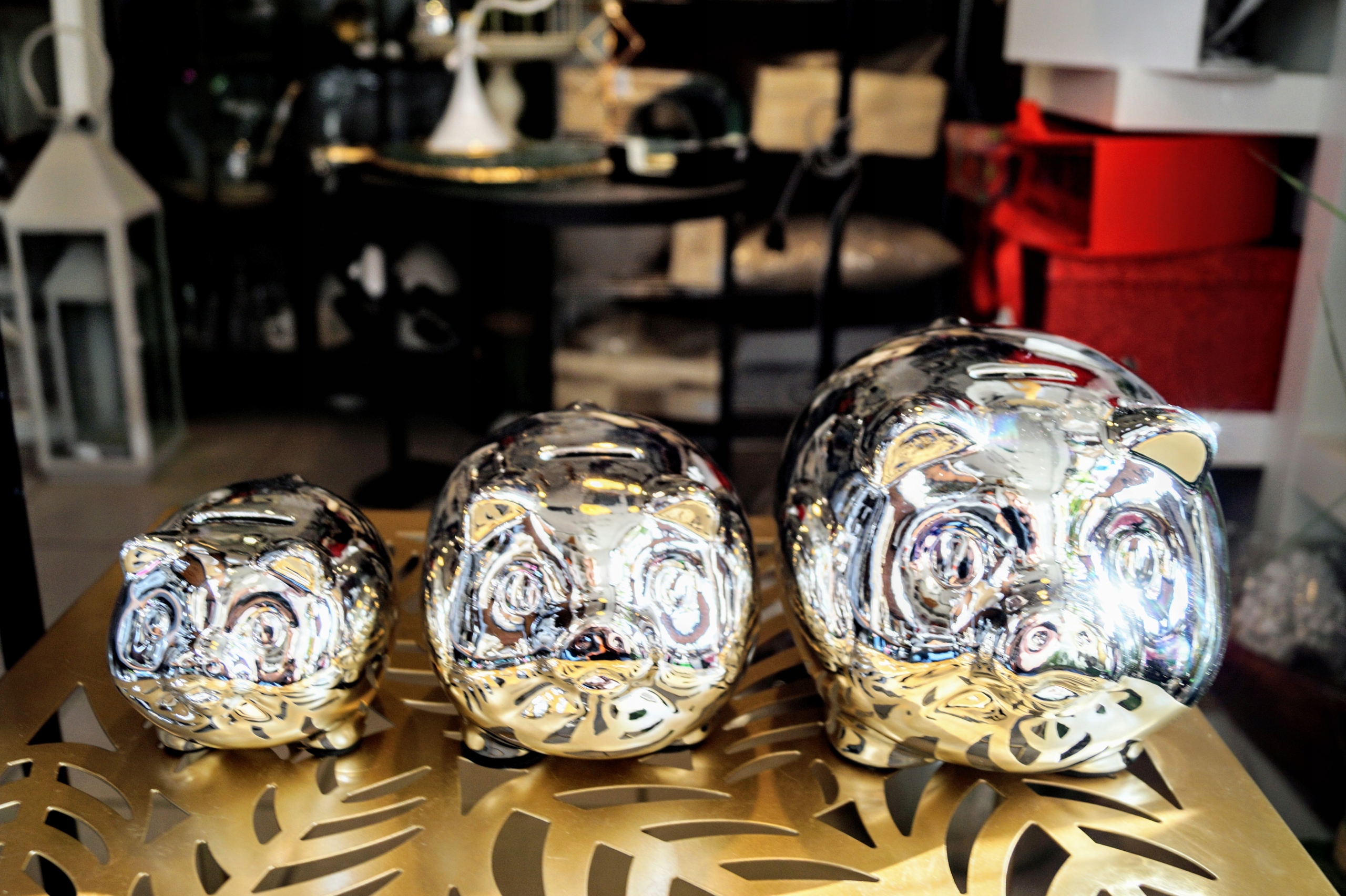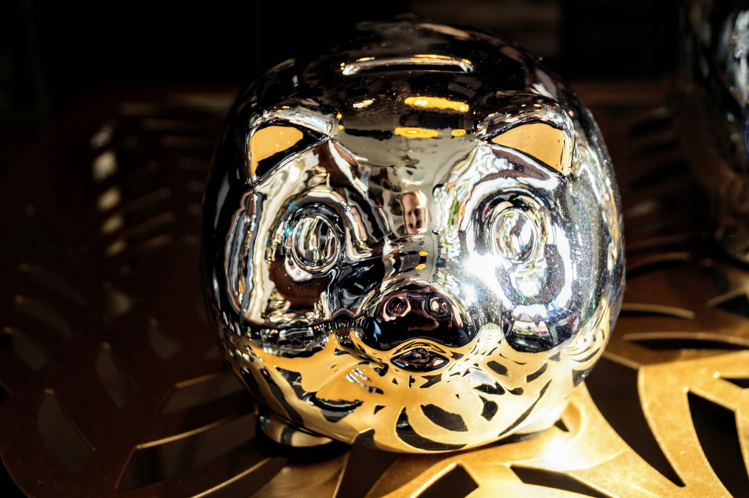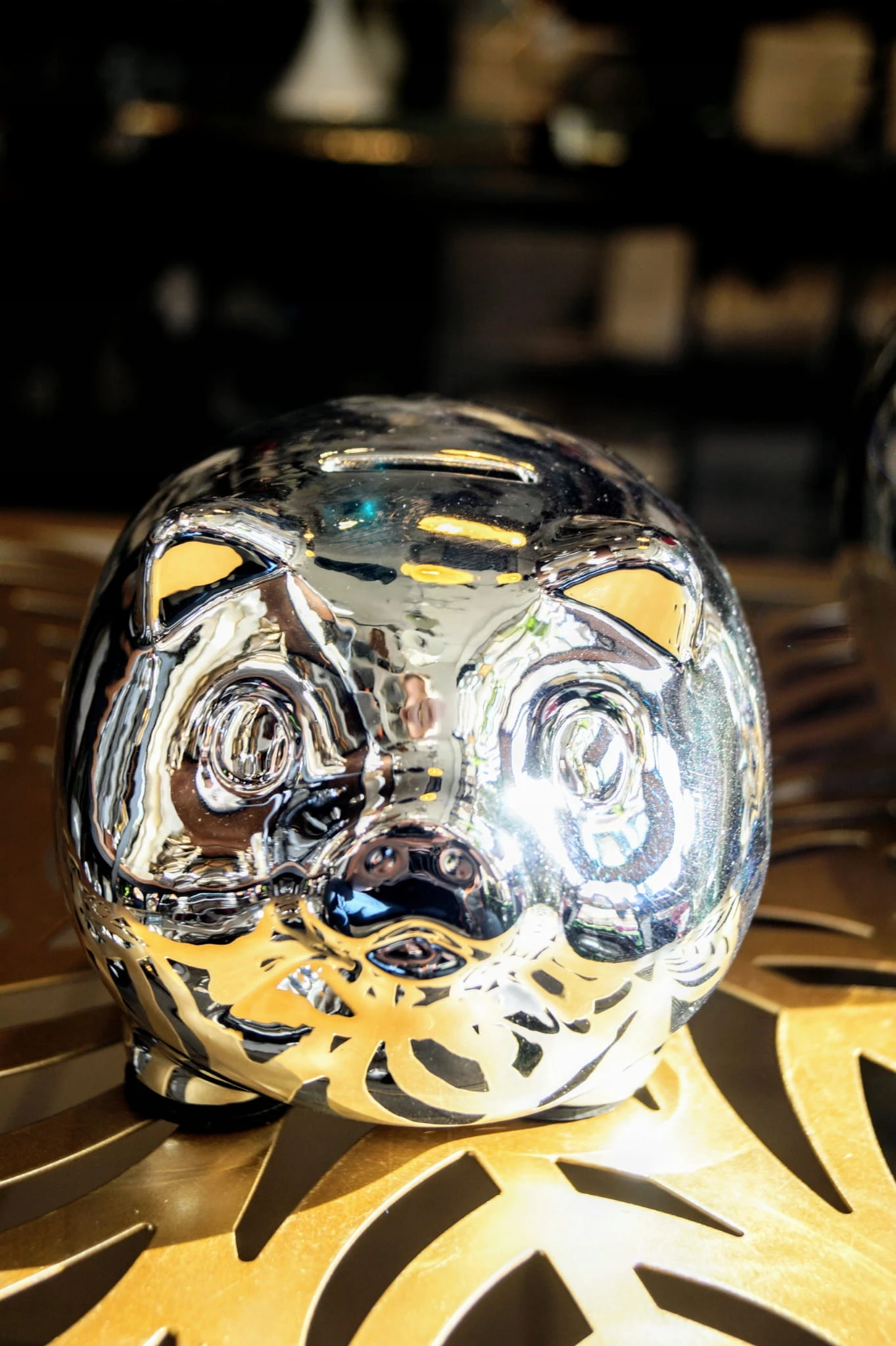 Ceramiczna skarbonka w srebrnym wykończeniu.