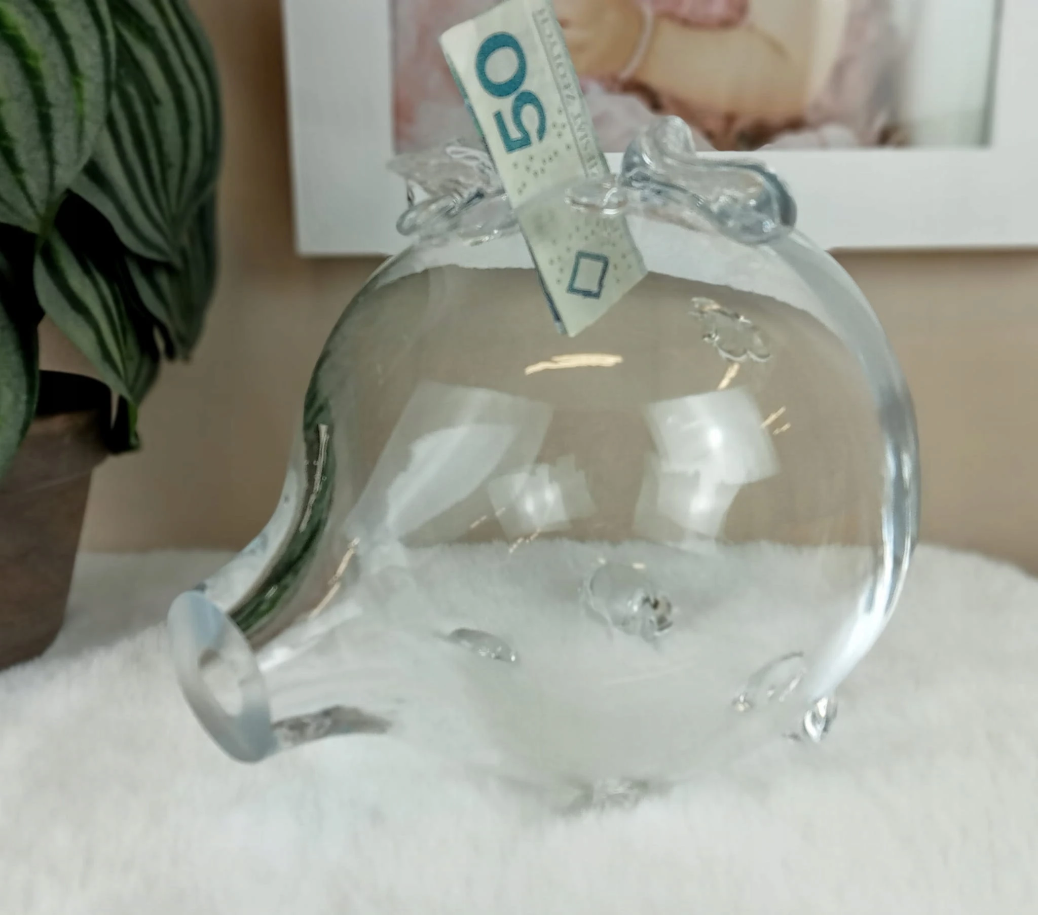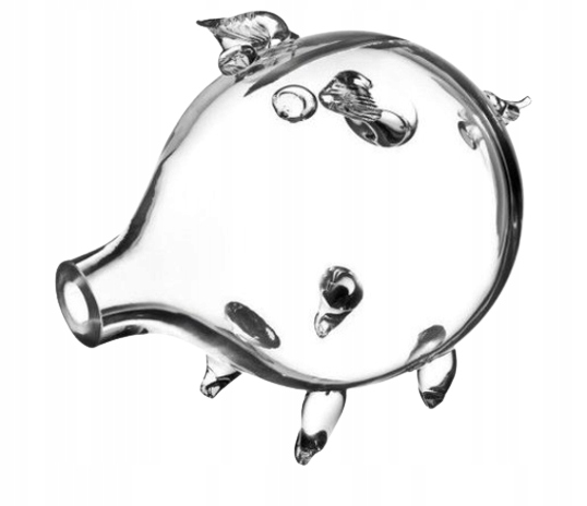 Klasyczna, szklana skarbonka w kształcie świnki. Skarbonka nie posiada dekielka, więc po jej napełnieniu należy ją zbić, co pomaga w wytrwałości i nie podbieraniu ze skarbonki :))