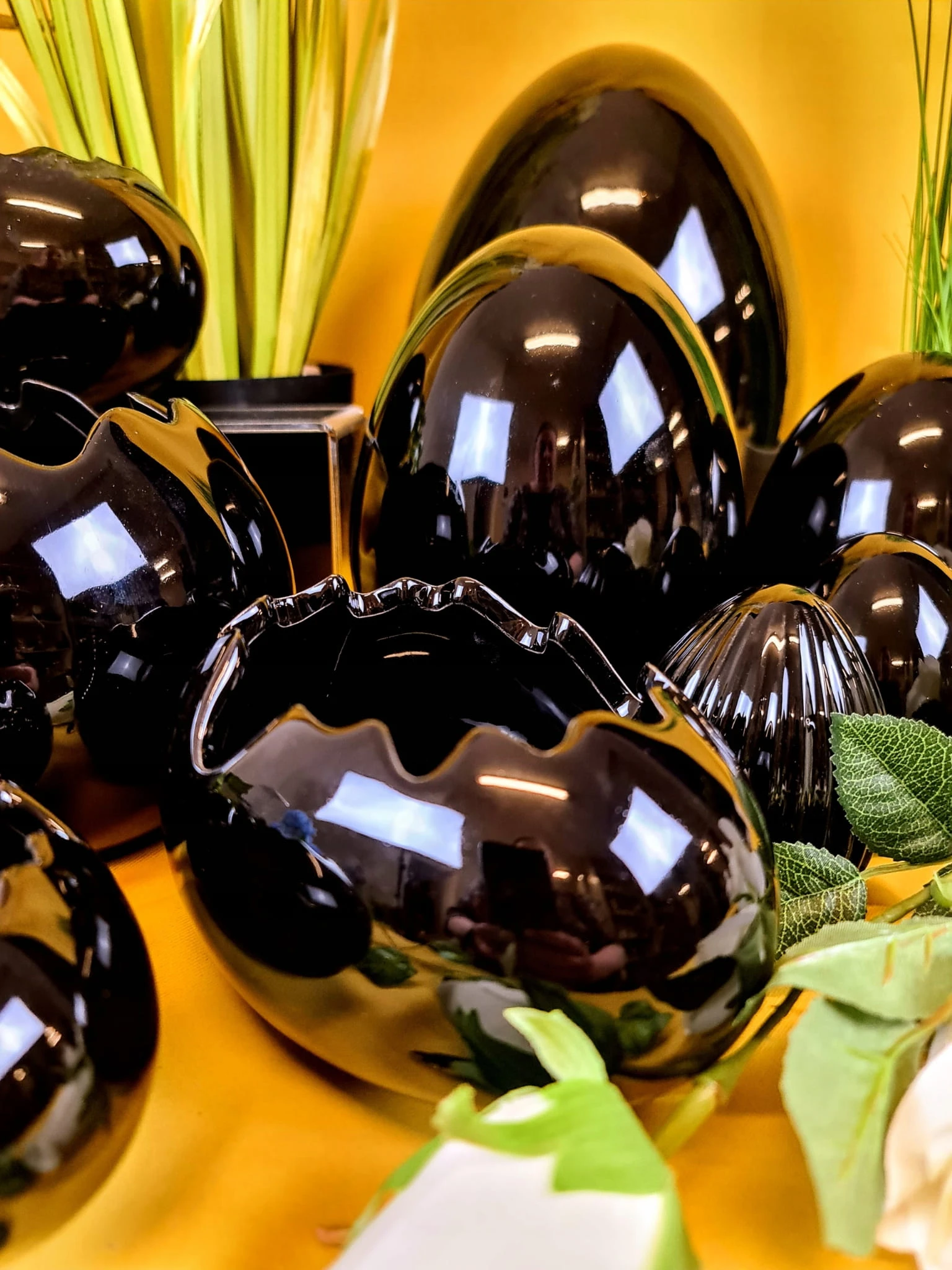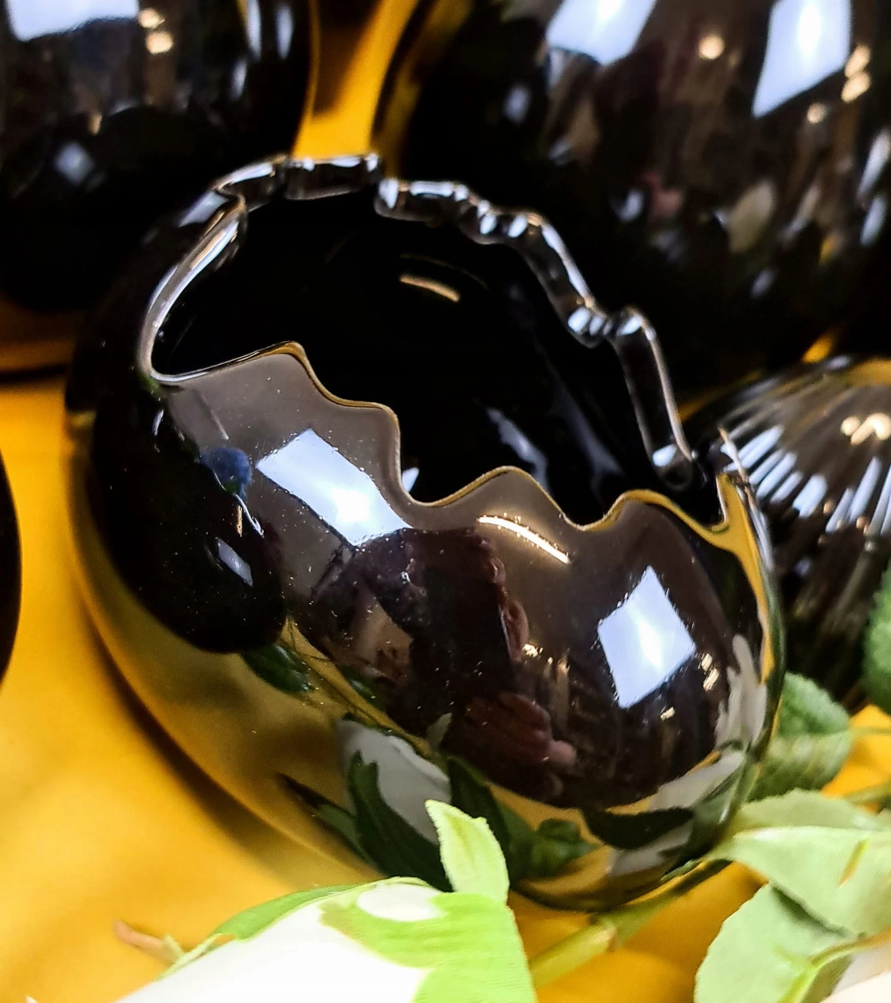Piękna czarna skorupka jajka - Wielkanocna jak i wiosenna dekoracja do Państwa domu. Nada niepowtarzalnego charakteru wnętrzu urządzonego praktycznie w każdym stylu. Może posłużyć jako osłonka, doniczka czy misa.