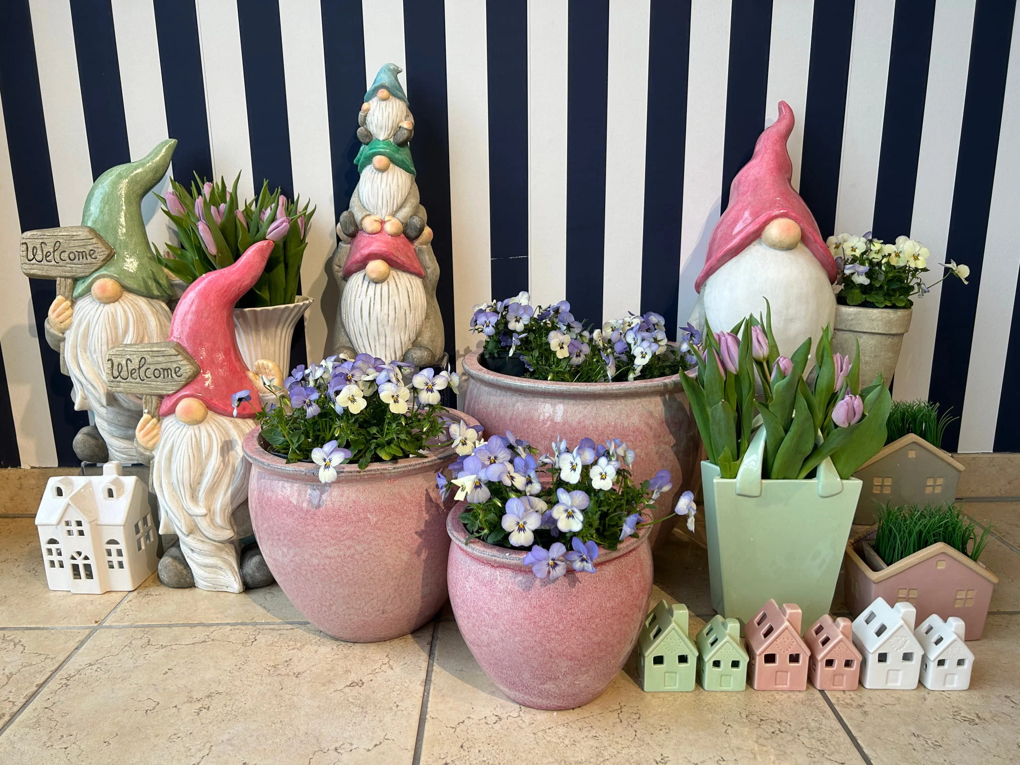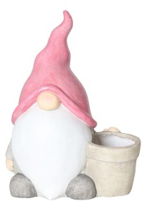 Ceramiczna figurka krasnala w różowej czapce z pewnością doda klimatu.