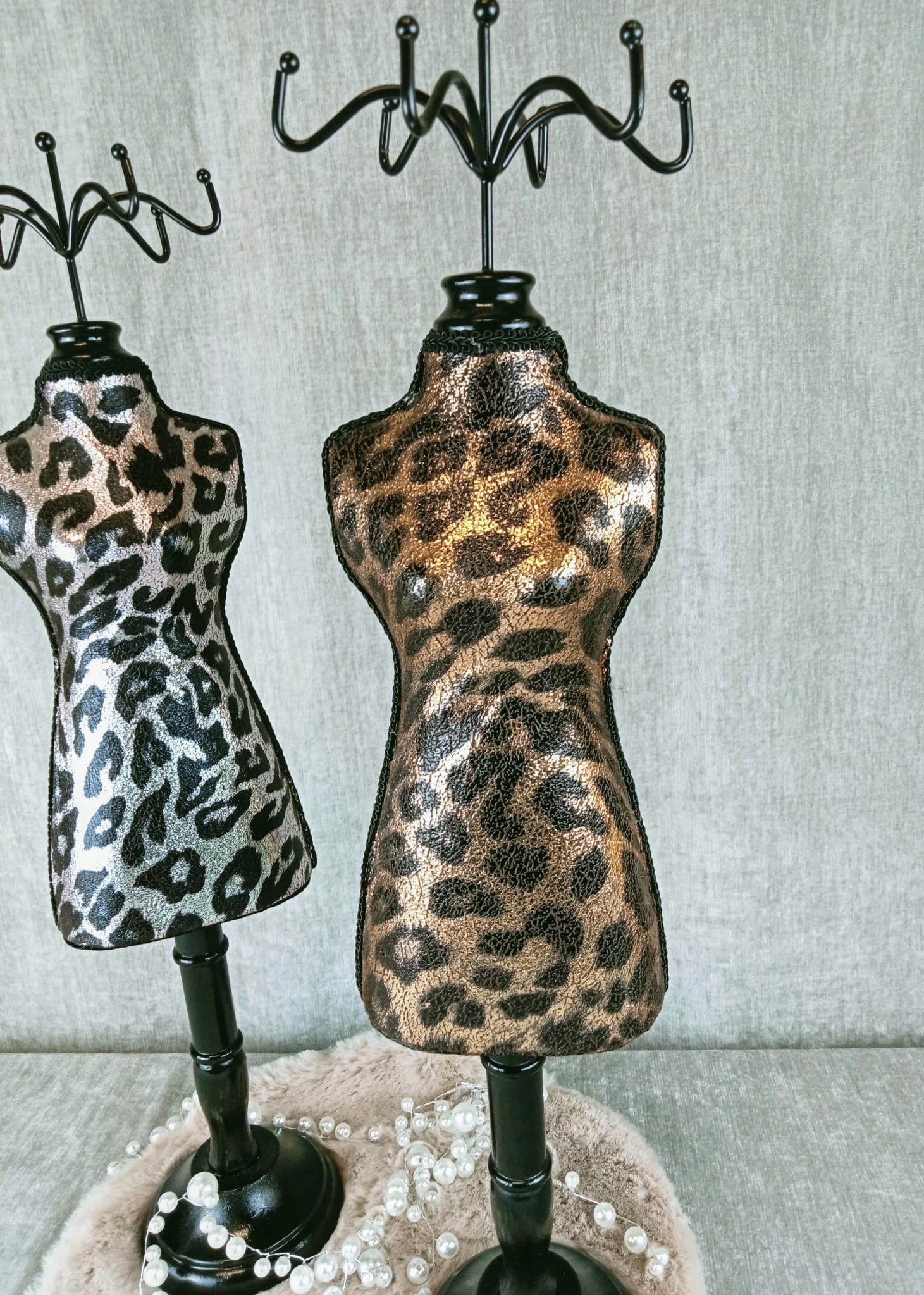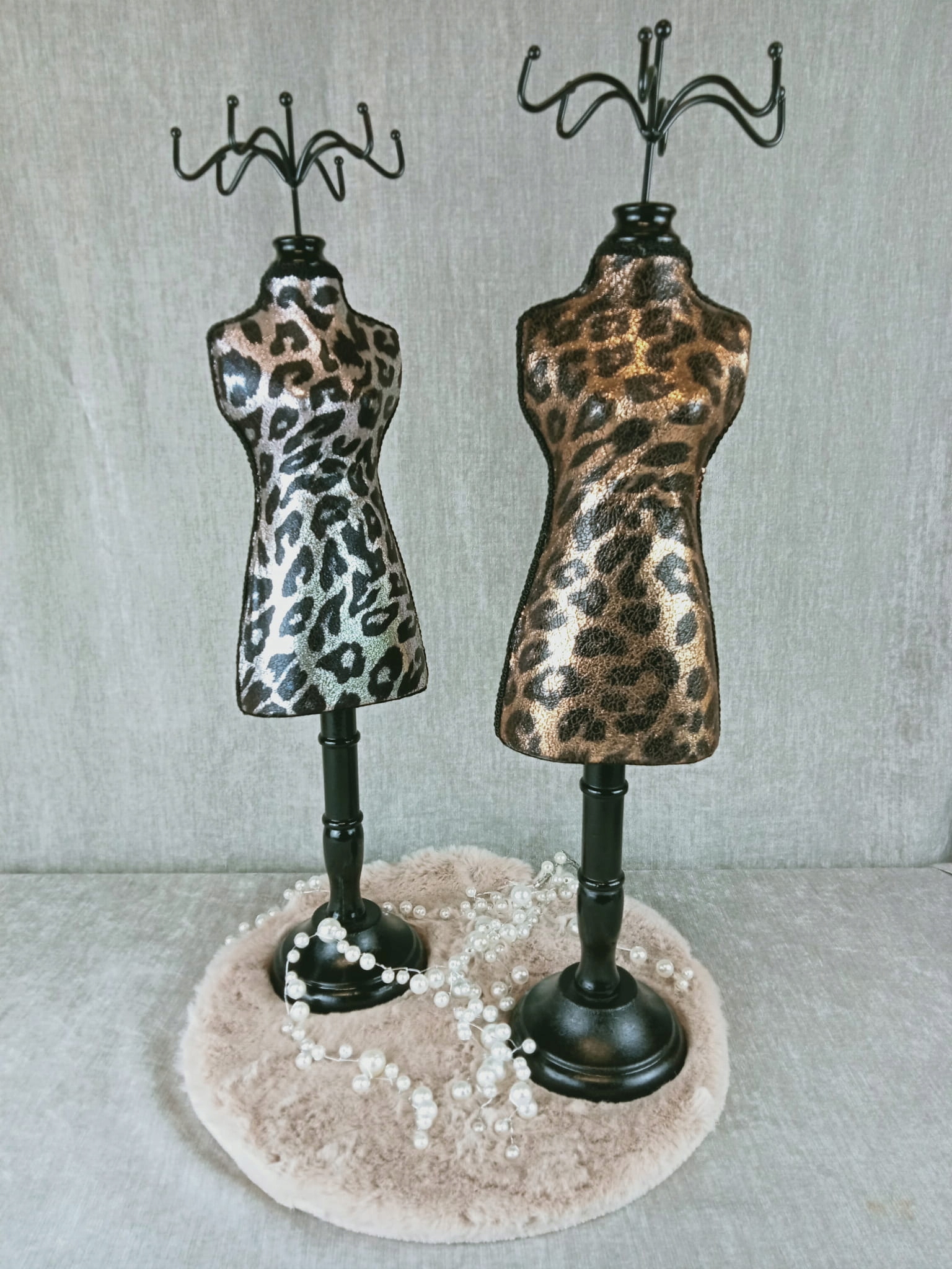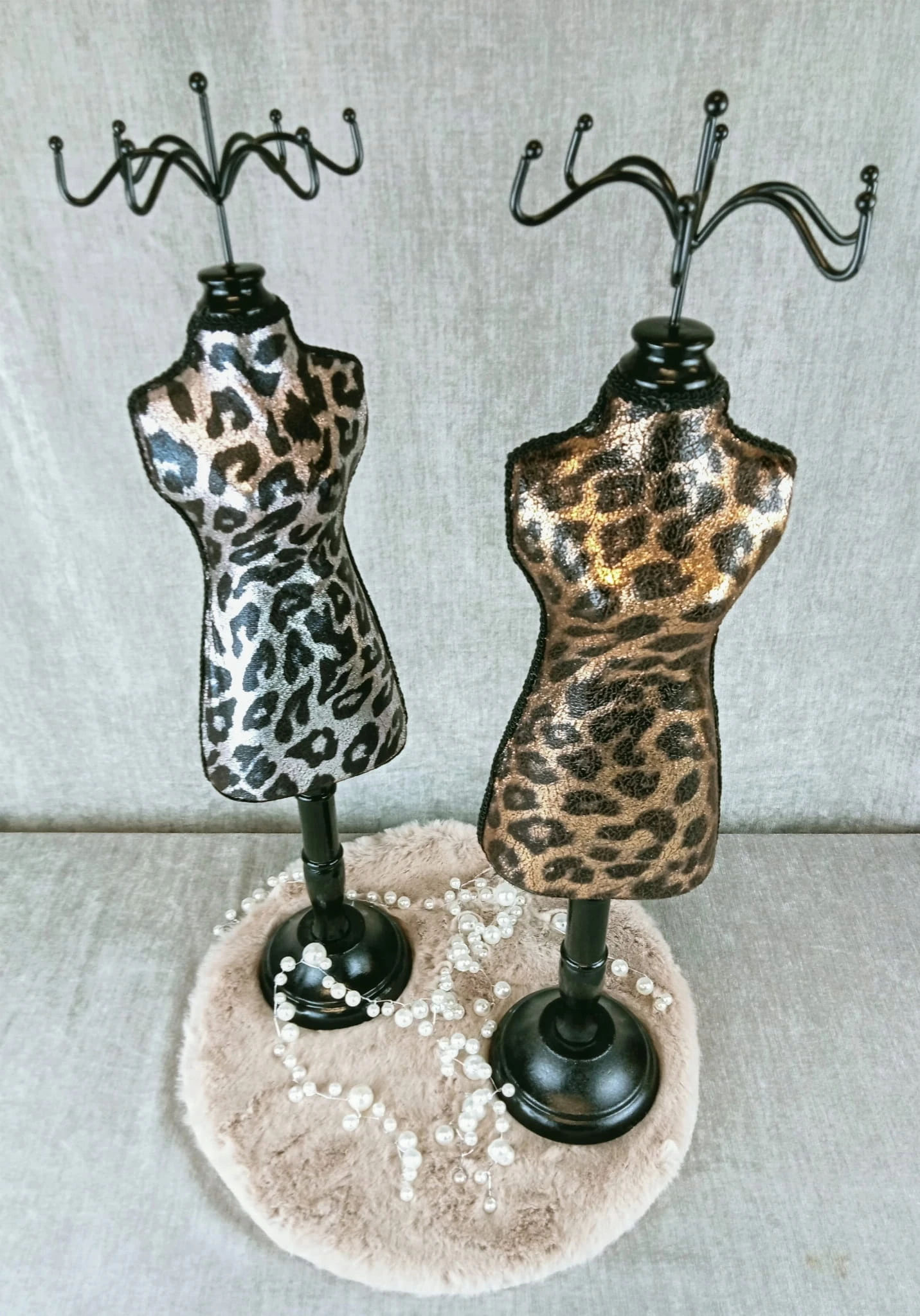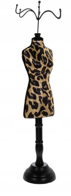 Duży stojak na biżuterię w kształcie krawieckiego manekina w piękny wzór panterki, który doskonale sprawdzi się jako dekoracja oraz prezent. Świetnie zaprezentuje się na toaletce z pierścionkami lub bransoletkami porządkując naszą biżuterię. Dzięki eleganckiemu projektowi idealnie sprawdzi się w wielu wnętrzach.