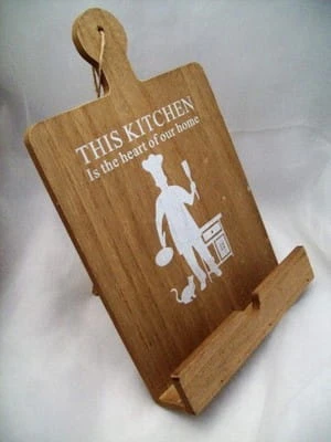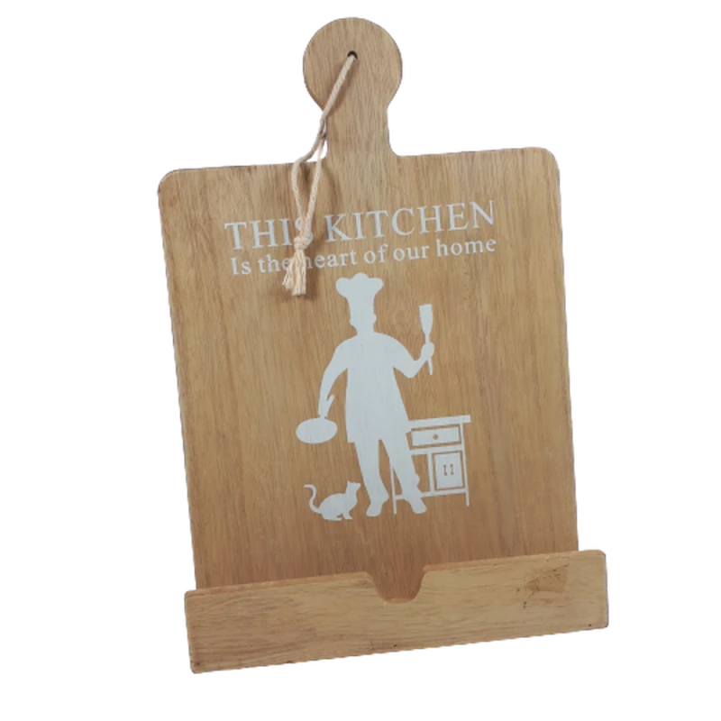 Drewniana podstawka pod książkę kucharską / podpórka pod książkę, elegancki gadżet stylowy stojak, drewniana podpórka pod książkę do czytania. Gadżet działa podobnie jak miniaturowe sztalugi malarskie. Wykonano go z naturalnego polerowanego drewna w kolorze jasnobrązowym z białym napisem i namalowaną figurką kucharza z patelnią i kotem.