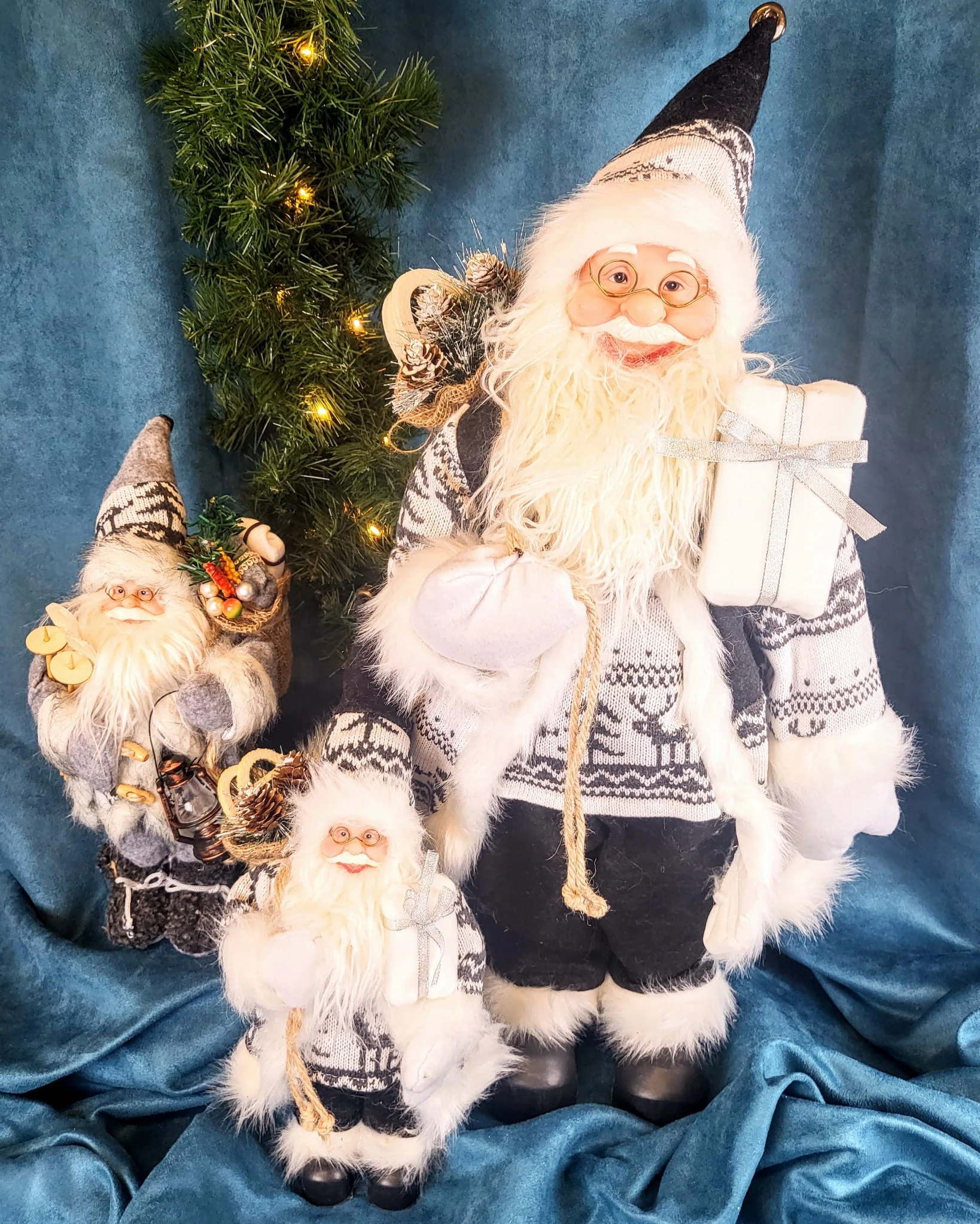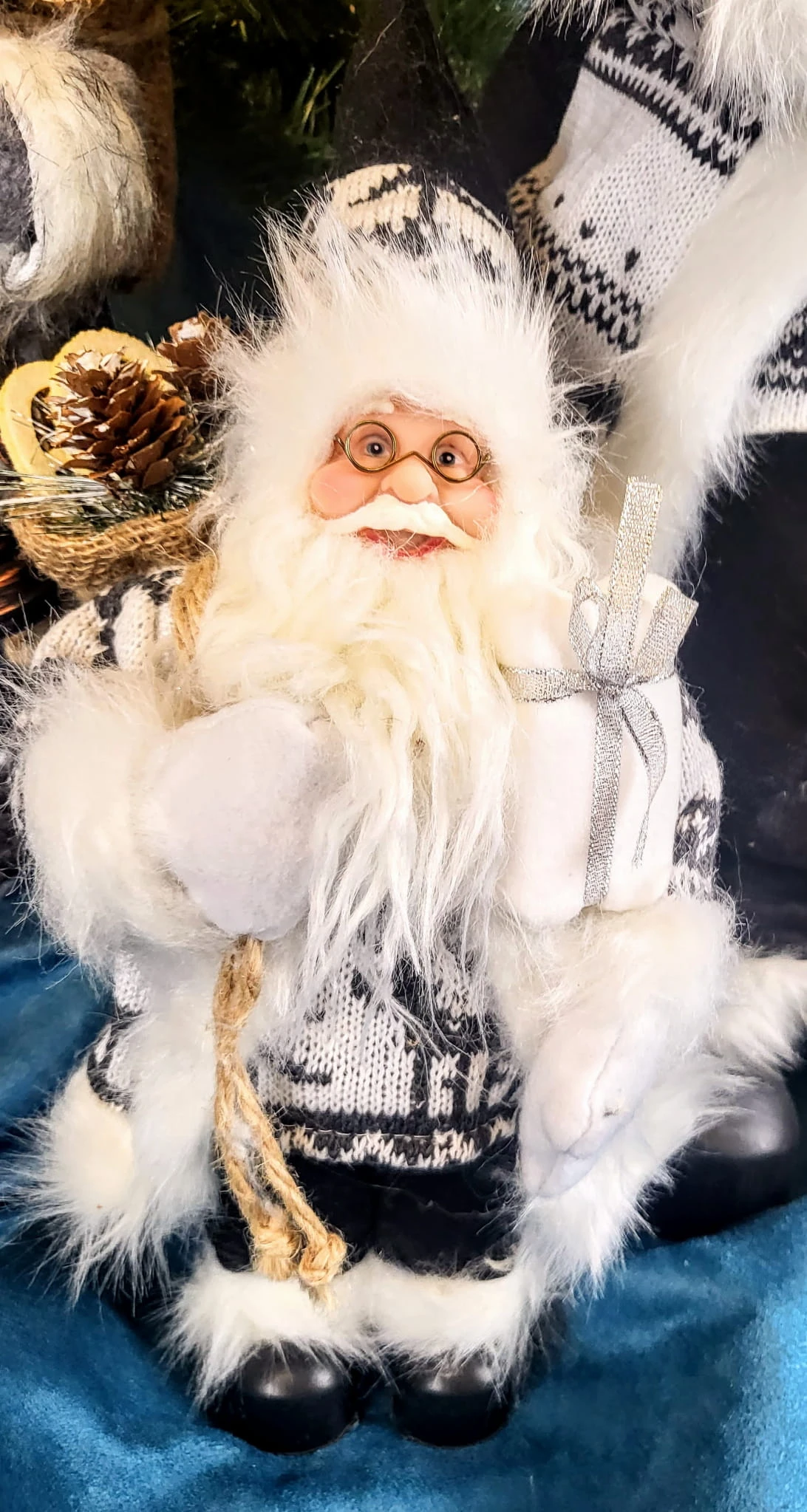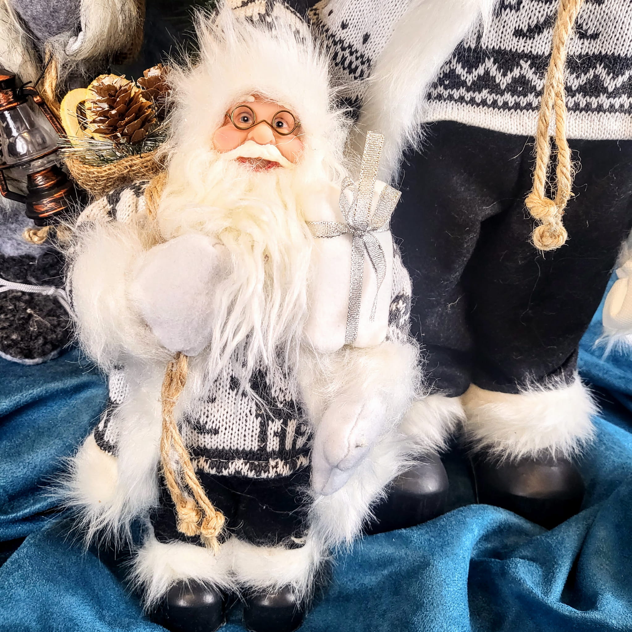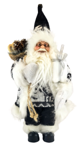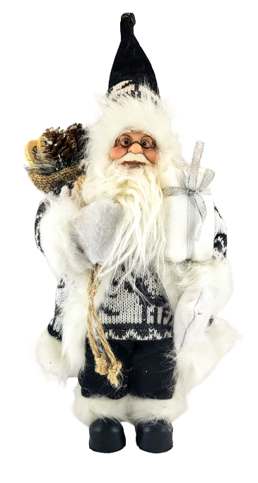 Urocza figurka mikołaja w czarno-białym stroju. Mikołaj na plecach ma worek a w ręce trzyma prezent. Figurka nada świątecznego nastroju w każdym wnętrzu.