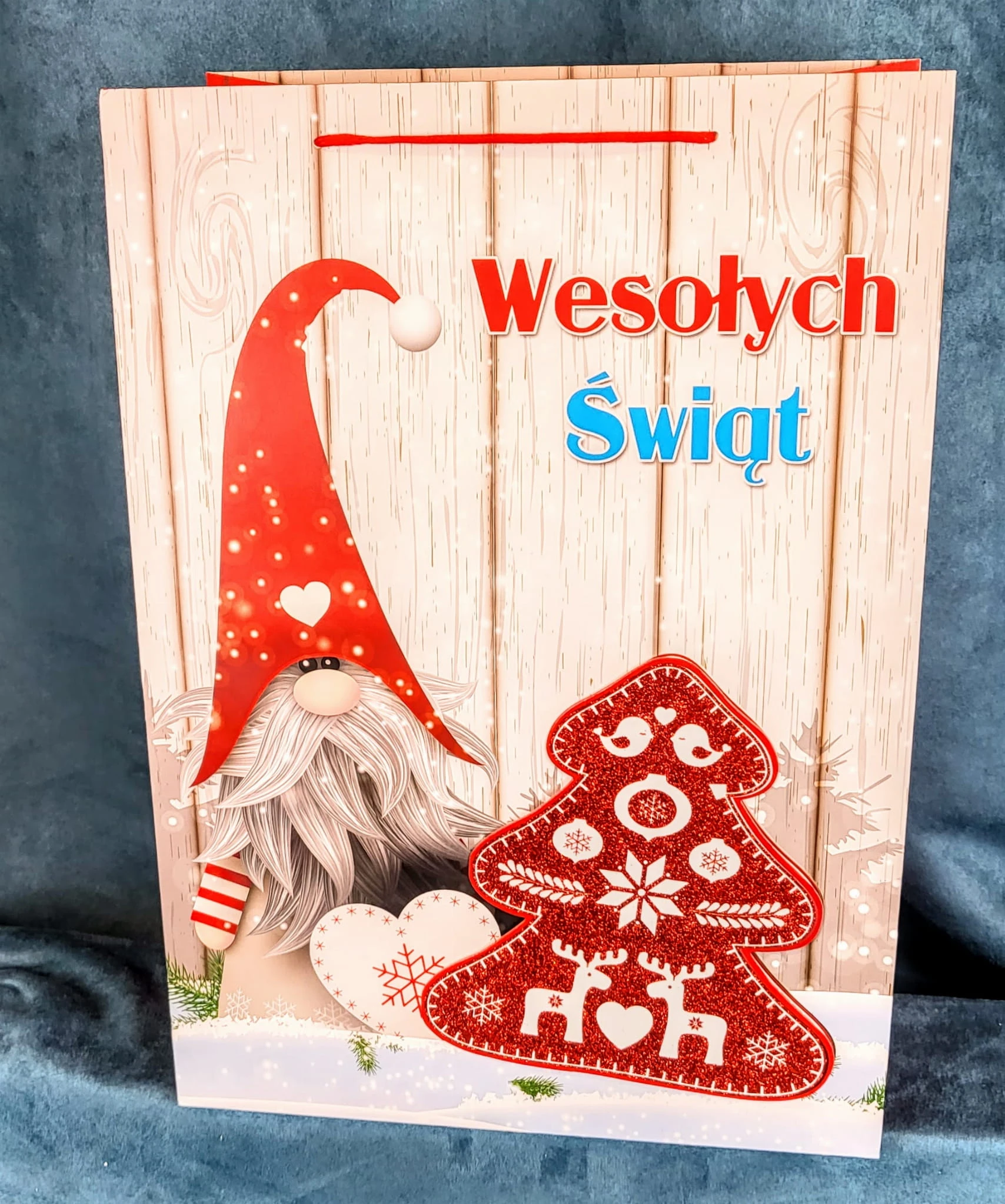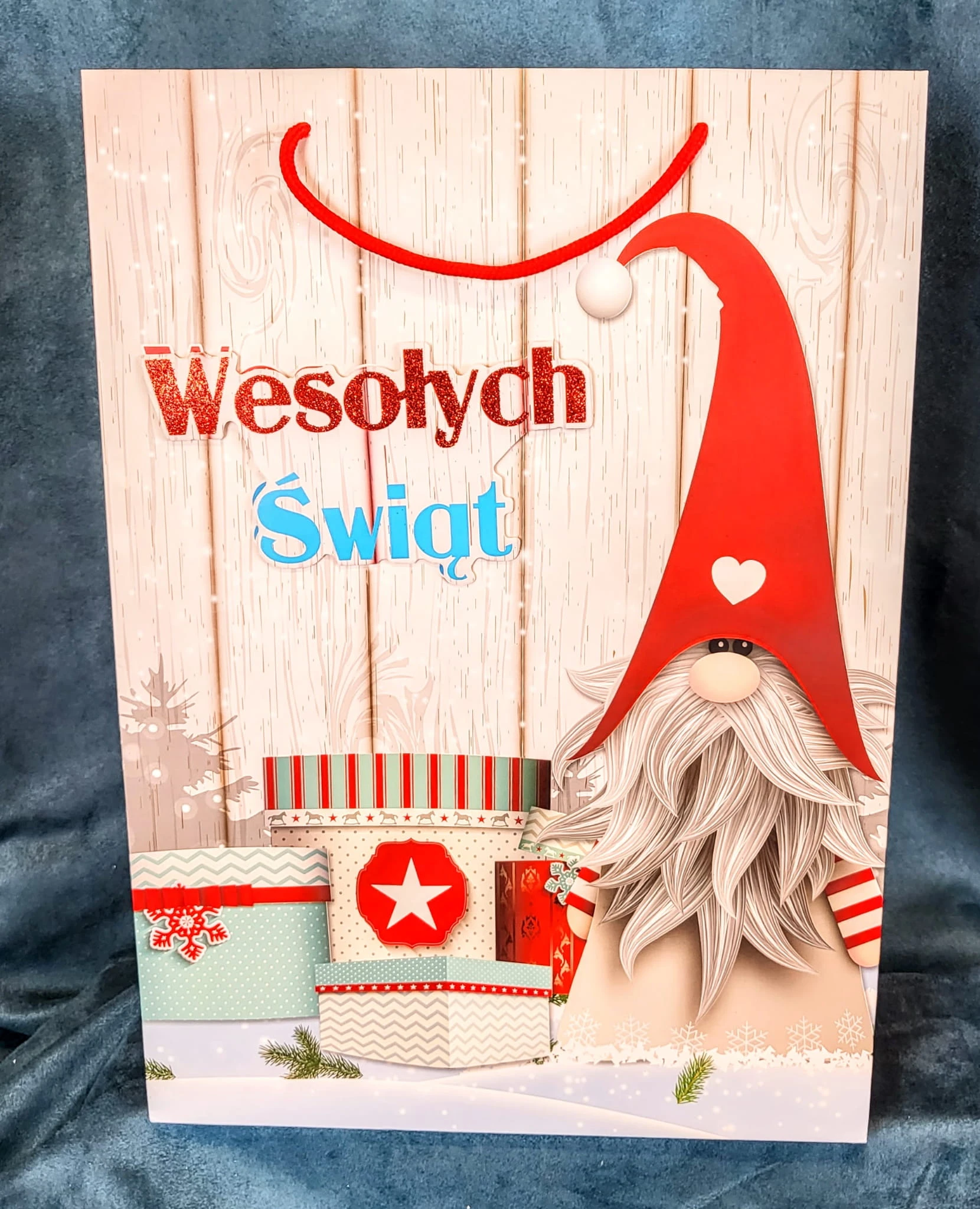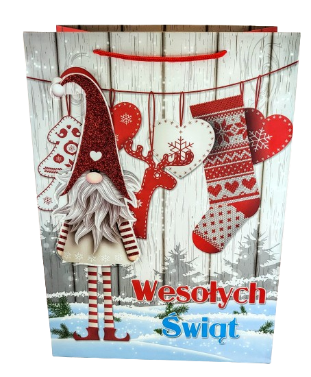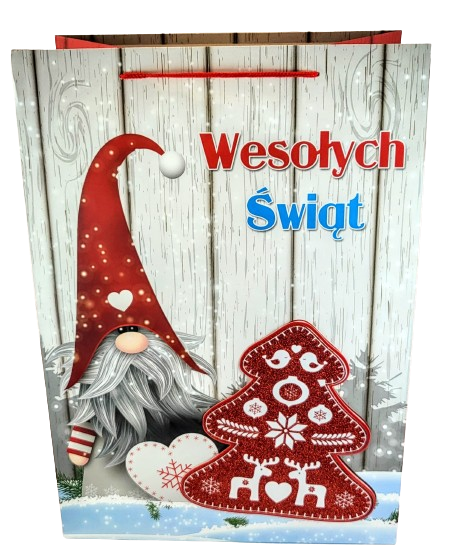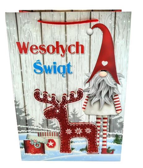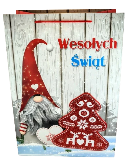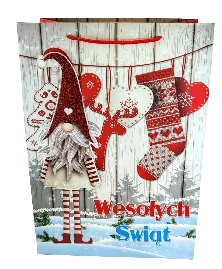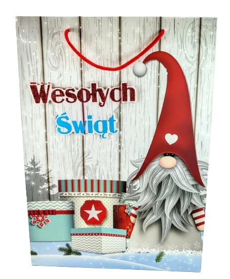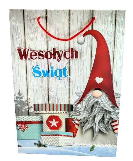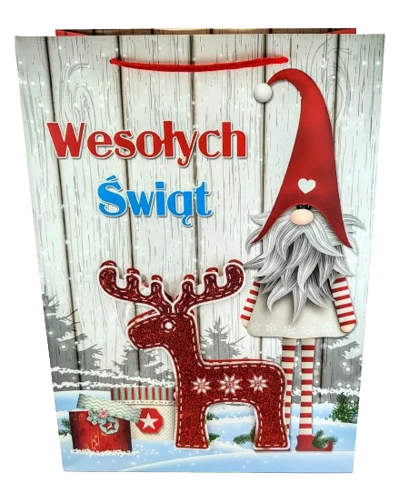 Świąteczna torebka prezentowa z szerokim dnem.