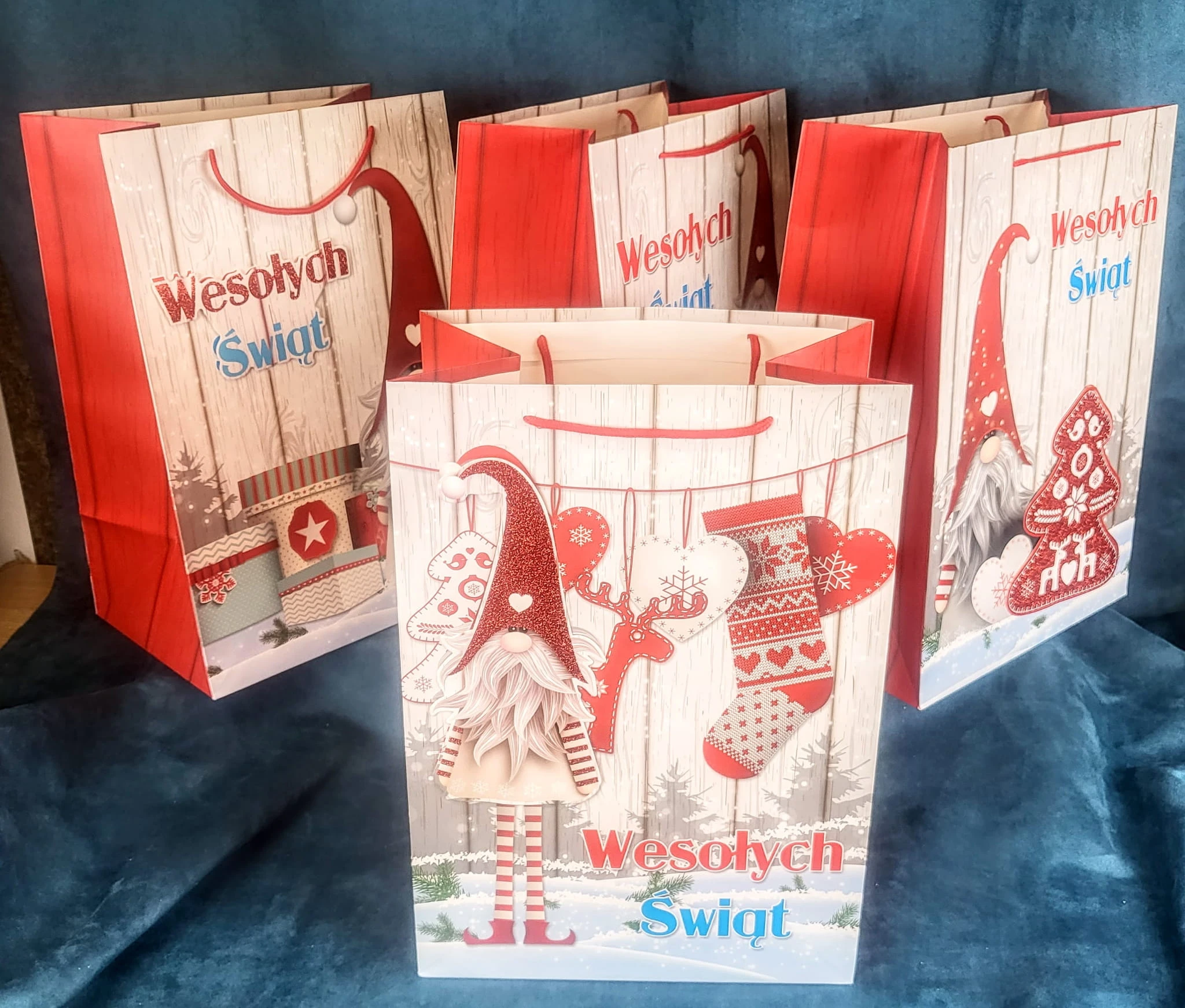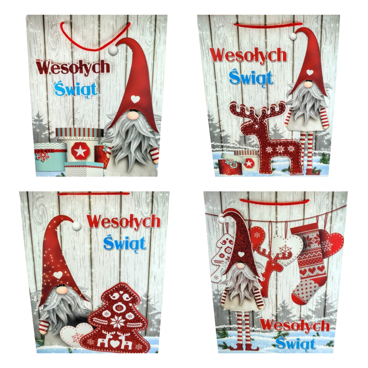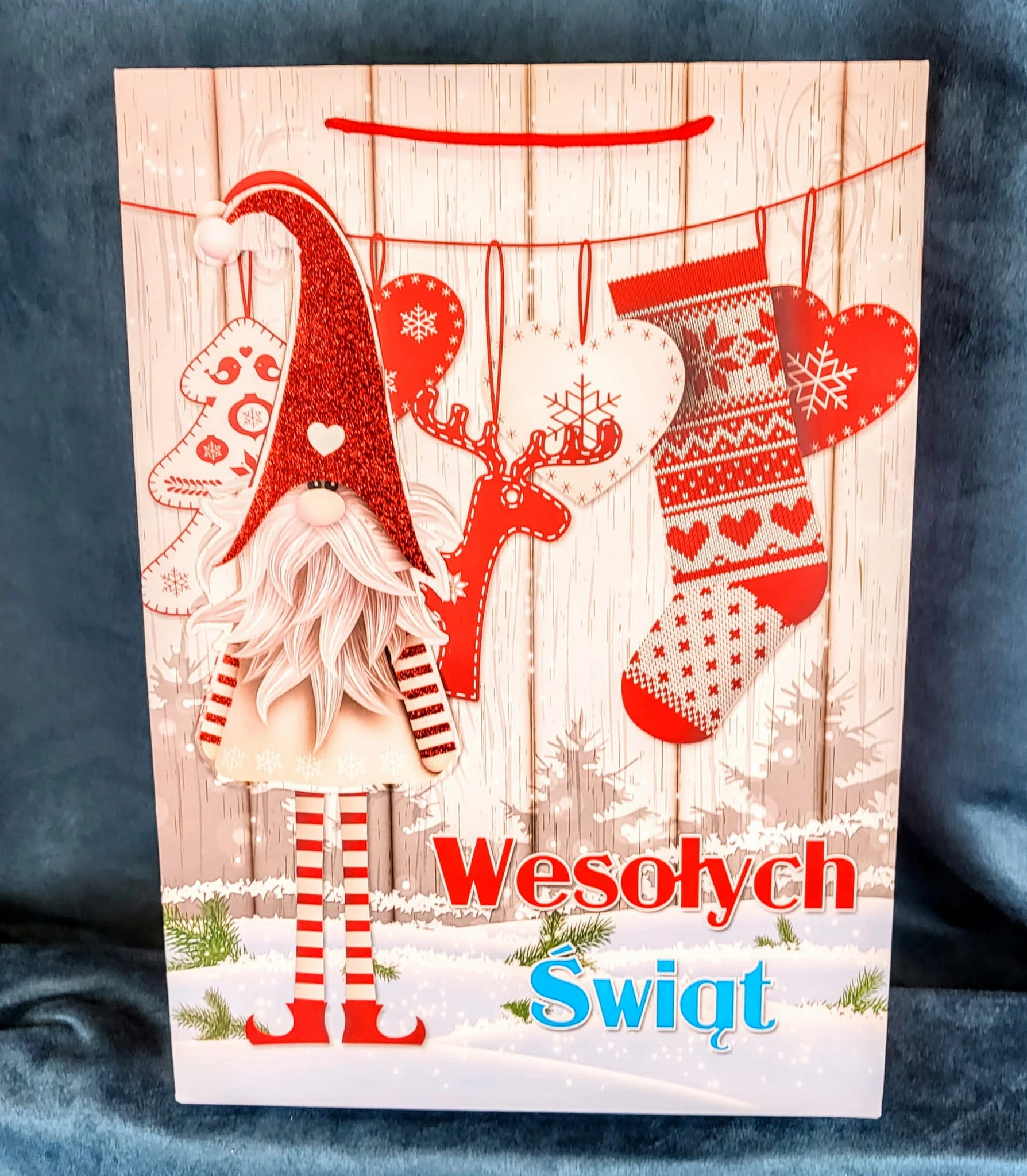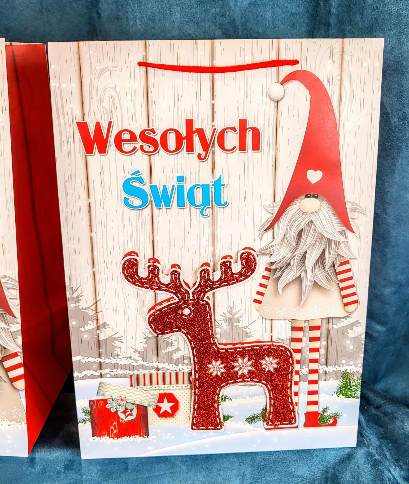 Świąteczna torebka prezentowa z szerokim dnem.