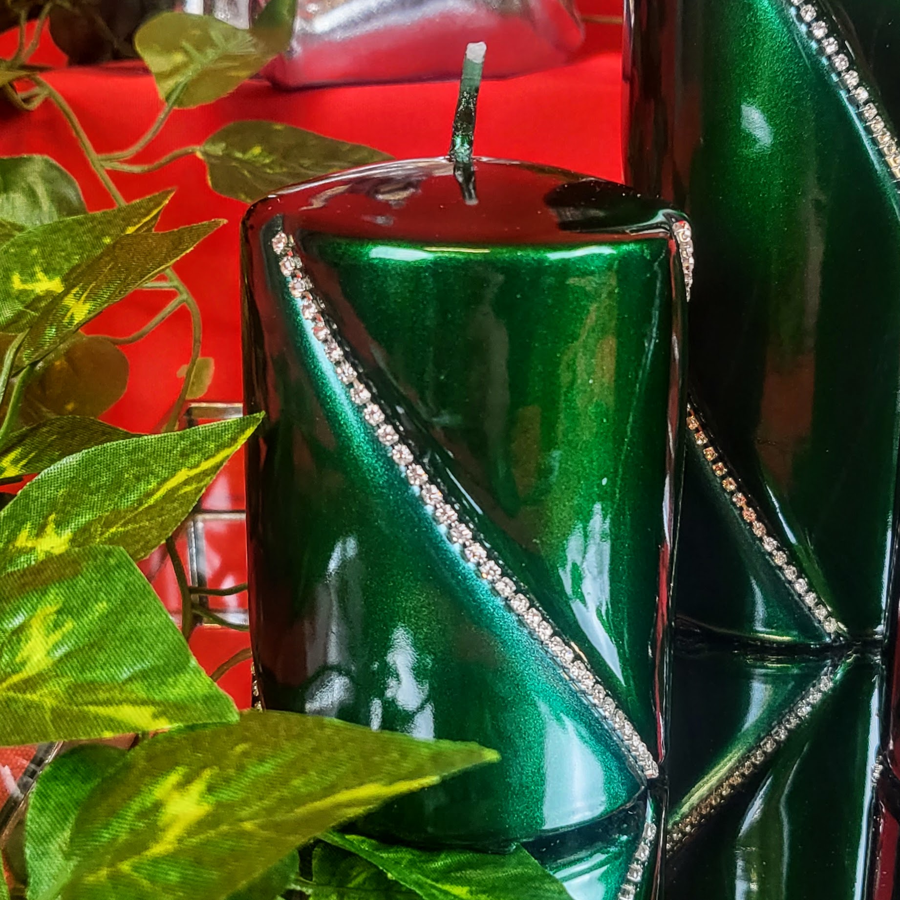 Ozdobna biała świeczka z cyrkoniami. Ożywi każdą półkę czy komodę, a w okresie bożonarodzeniowym stanowić będzie uroczą ozdobę stołu i/lub stroików.