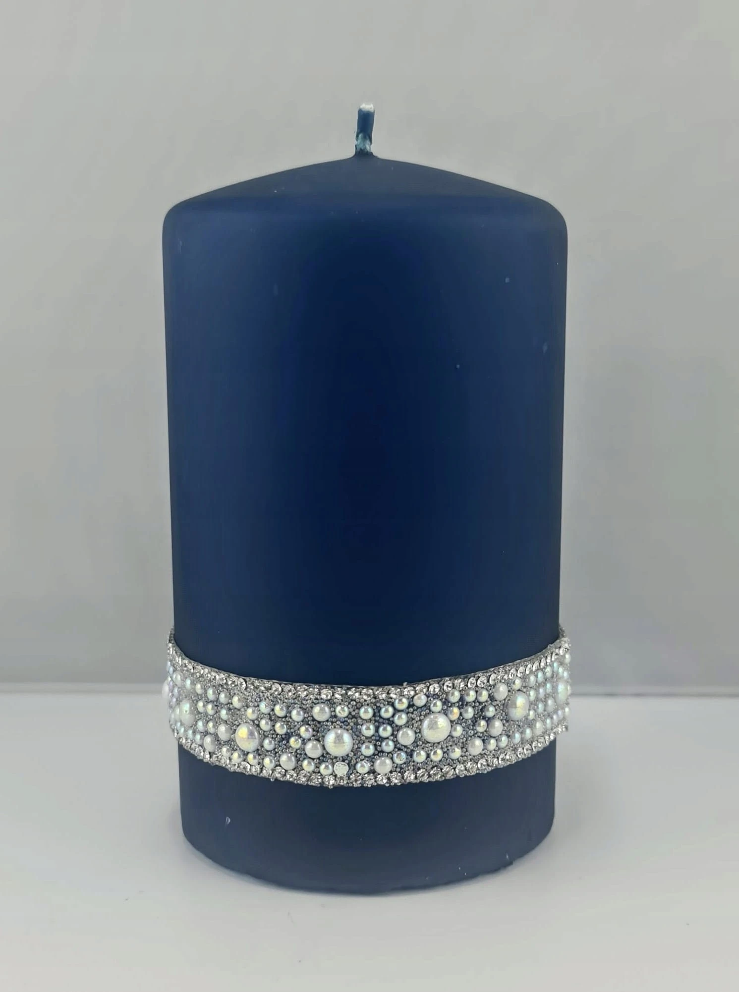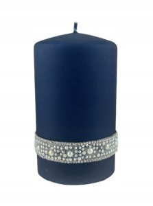 Parafinowa świeca w kształcie walca z ozdobną bransoletką.