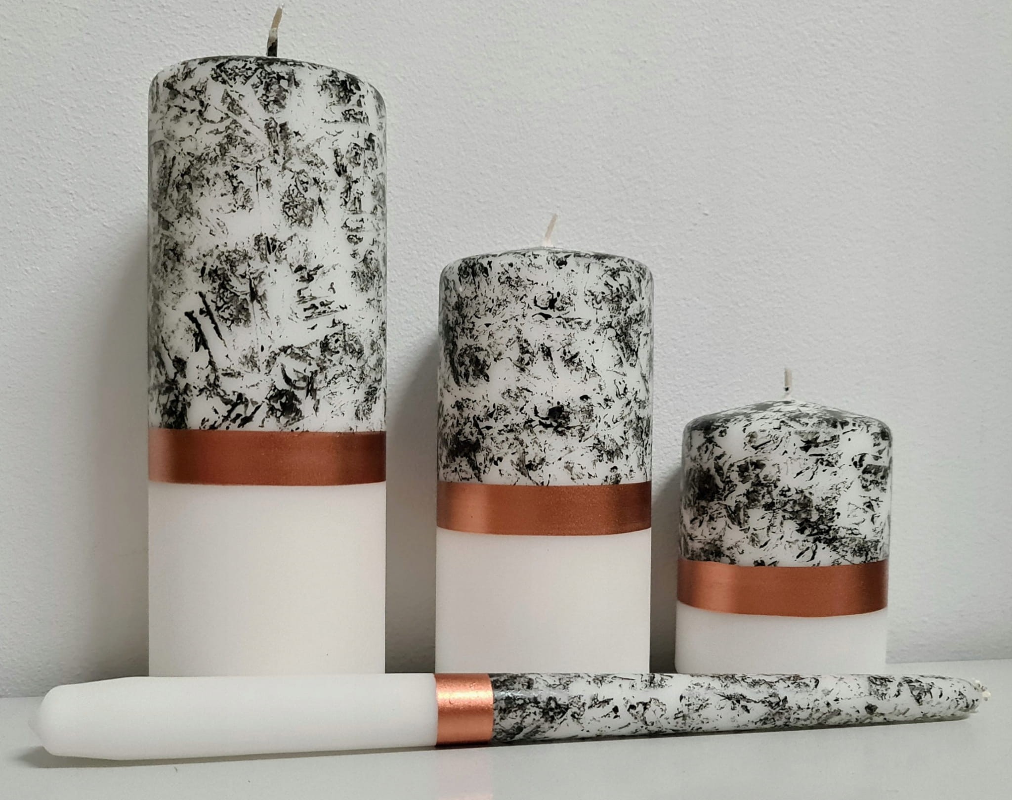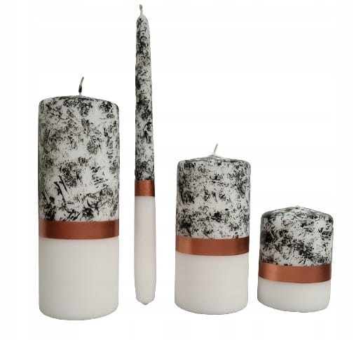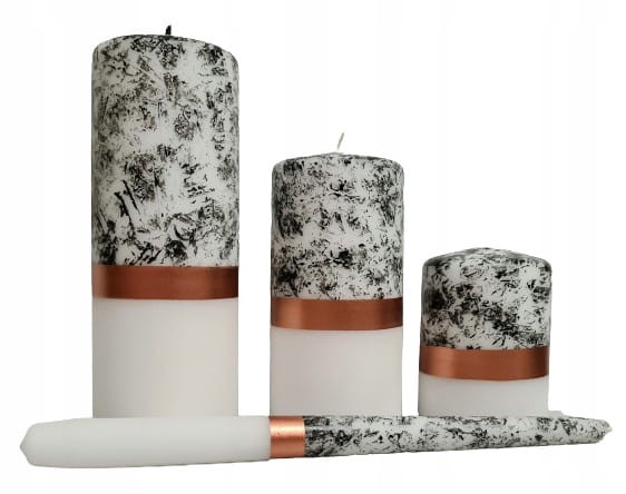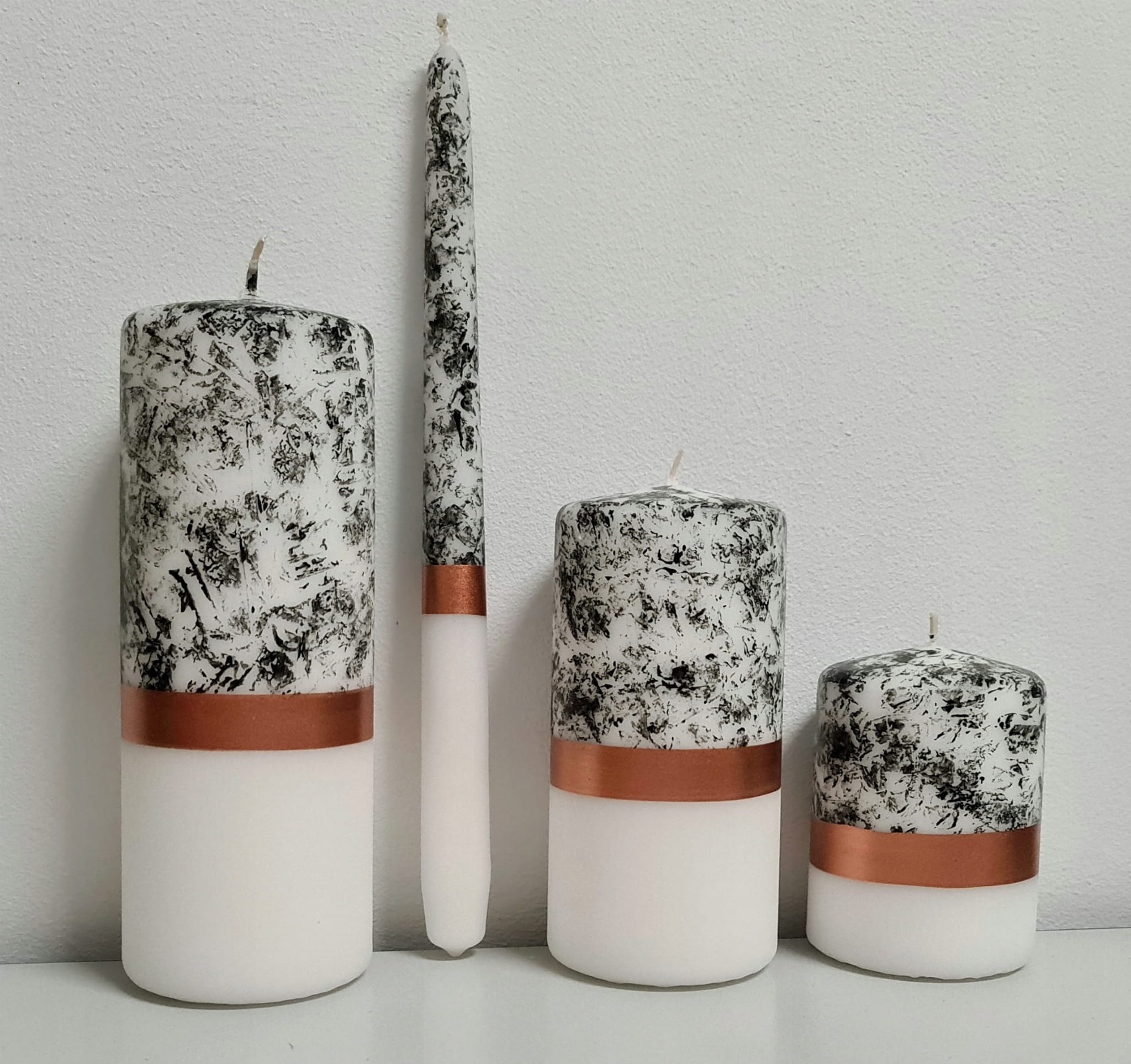 Świece z serii COPPER BELT, to oryginalna biało-marmurkowa świeca z efektownym zdobieniem w kolorze miedzi. Świetnie sprawdzi się we wnętrzach nowoczesnych i nie tylko. Jest to idealny pomysł na prezent dla osoby, która lubi eleganckie dodatki.