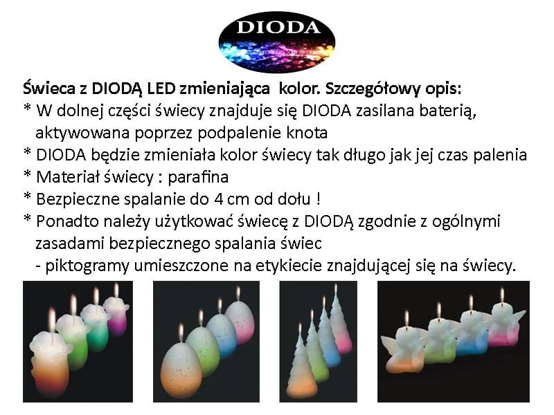 - Ponadto należy użytkować świecę z DIODĄ zgodnie z ogólnymi zasadami bezpiecznego spalania świec - piktogramy umieszczone na etykiecie znajdującej się na świecy