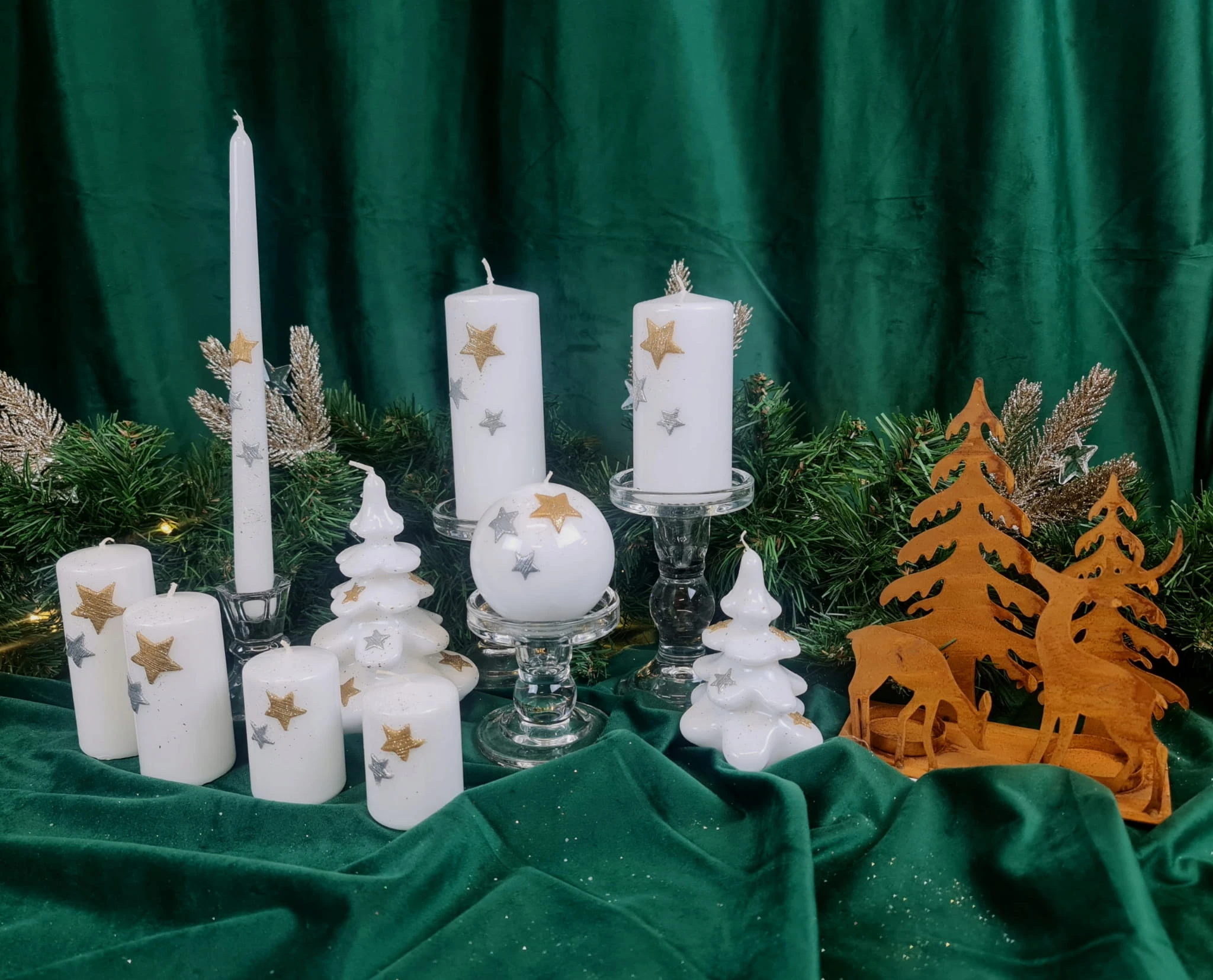 Świece z serii TRZY GWIAZDKI, to oryginalna świąteczna świeca z efektownym zdobieniem z motywem gwiazdek. Świetnie sprawdzi się we wnętrzach nowoczesnych i nie tylko. Jest to idealny pomysł na prezent dla osoby, która lubi eleganckie dodatki.