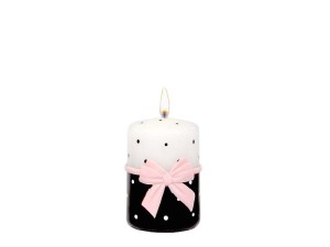 Świeca wyróżnia się kontrastowym połączeniem kolorów. Górna część w kolorze białym z subtelnymi czarnymi kropkami harmonijnie przechodzi w dolną czarną część, a całość dopełnia urocza różowa kokarda, nadająca świecy eleganckiego i kobiecego charakteru.